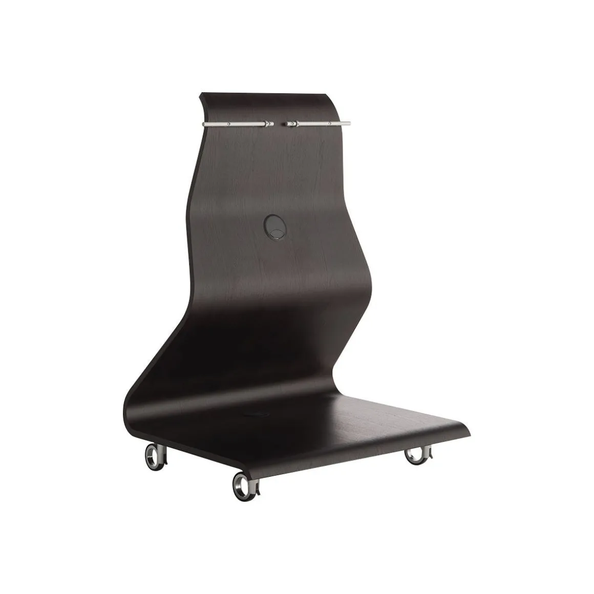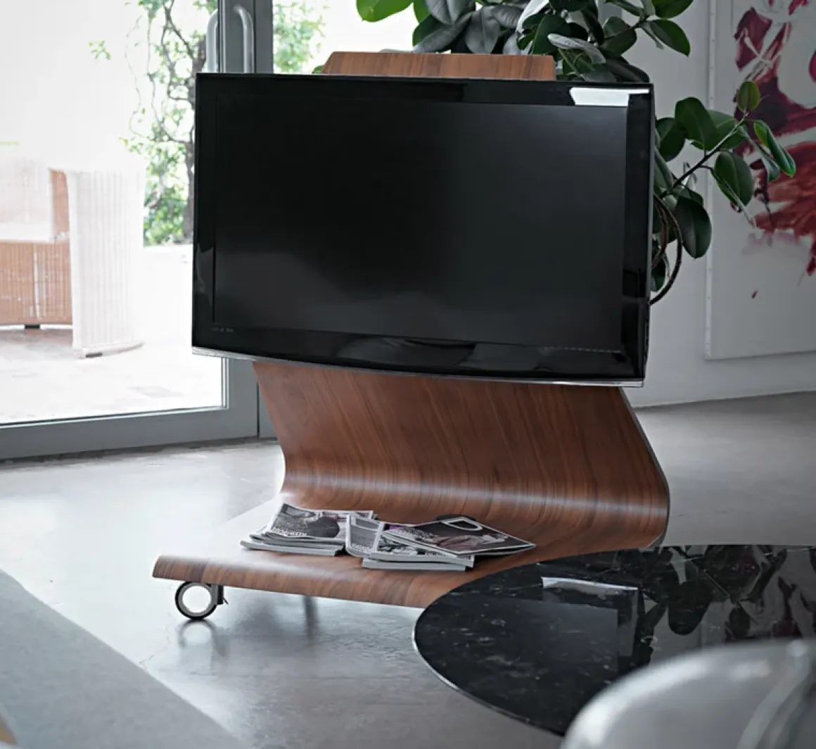 Le contreplaqué plié à chaud dessine une courbe élégante et fonctionnelle, le meuble est destiné à recevoir aussi des écrans de grandes dimensions.