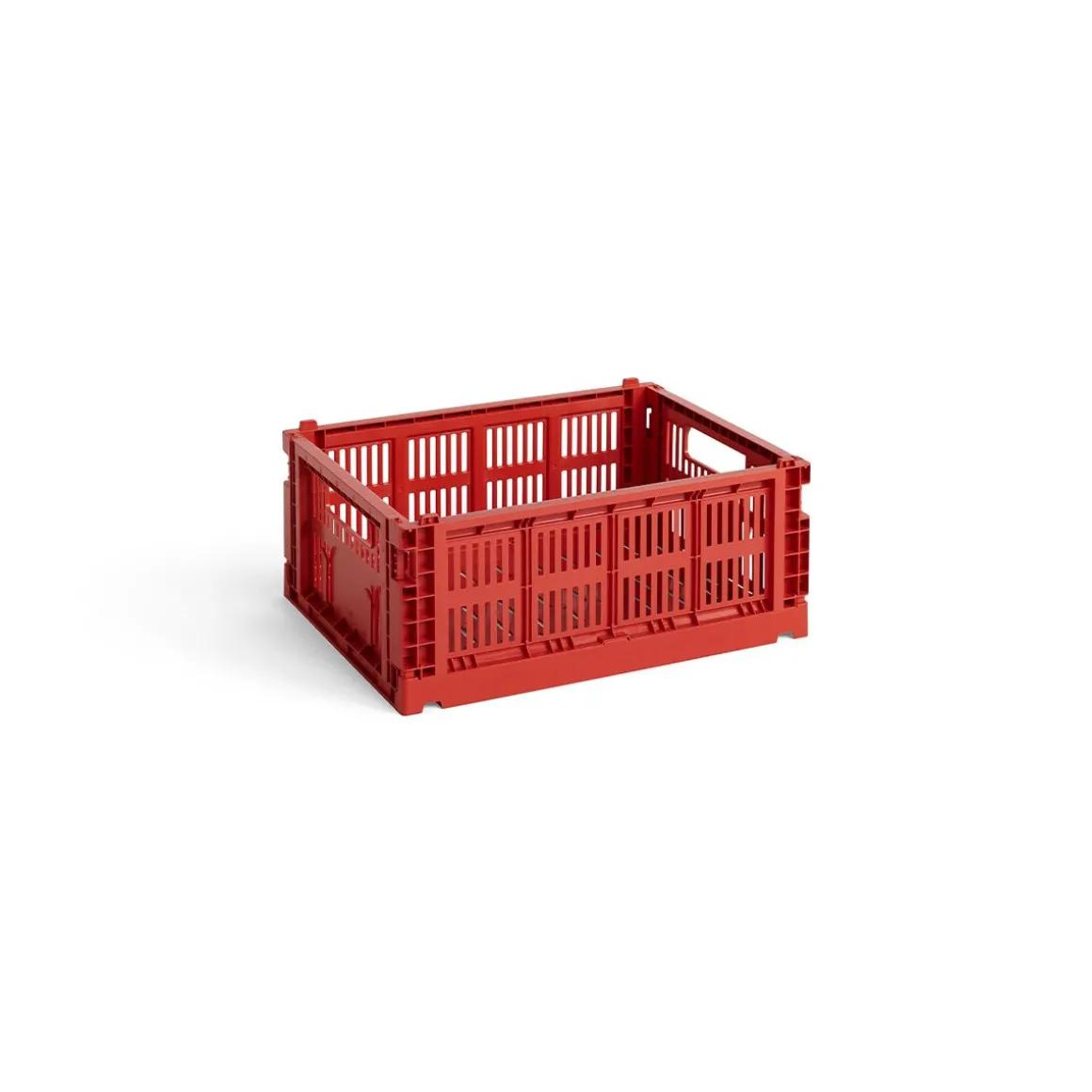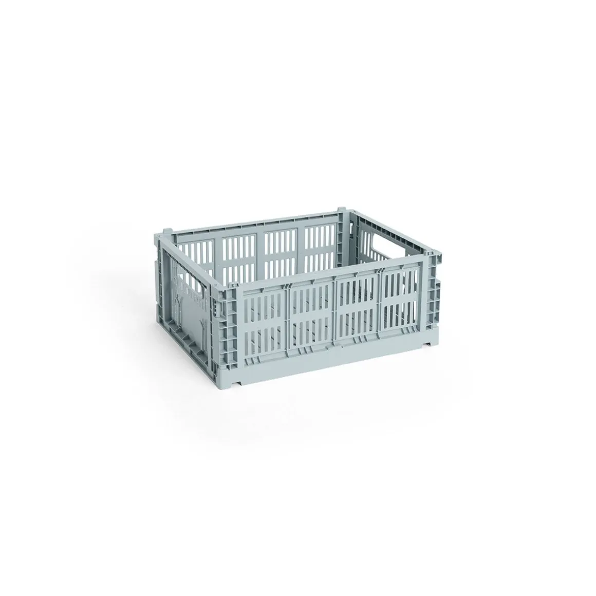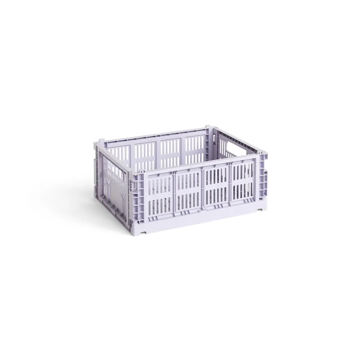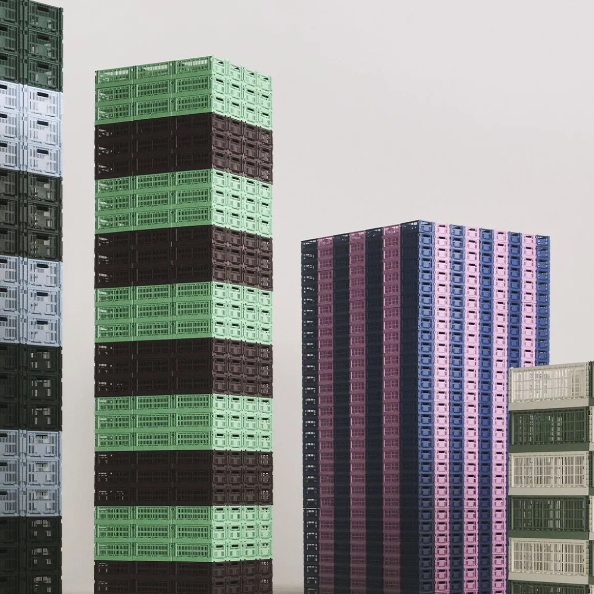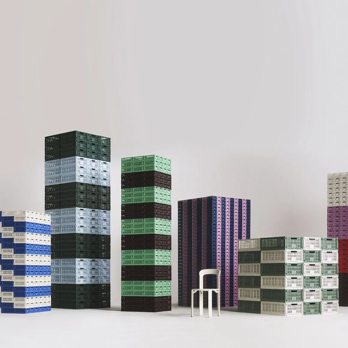Colour Crate de Hay. La gamme Colour Crate de HAY est une gamme de boîtes de rangement pratiques et adaptables, au design perforé. Fabriquées à partir de plastique post-consommation 100% recyclé. Elles s’emboîtent les unes dans les autres selon de multiples configurations, ce qui les rend idéales pour le rangement, l’exposition et même pour des meubles innovants. Leur multifonctionnalité, combinée à leur capacité à se replier à plat lorsqu’elles ne sont pas utilisées, en fait une solution de rangement polyvalente et peu encombrante.