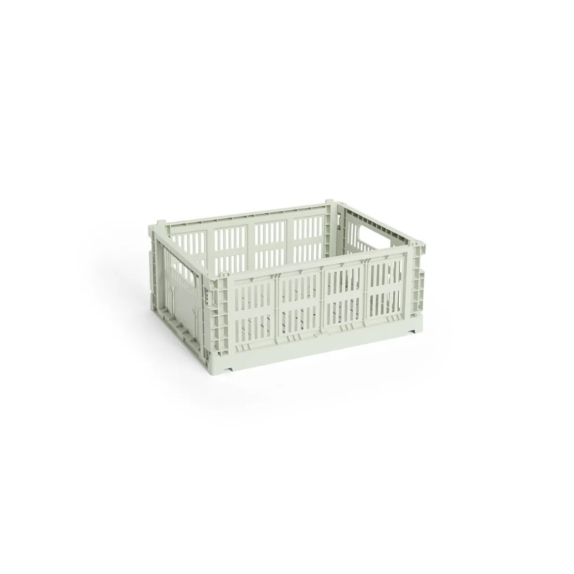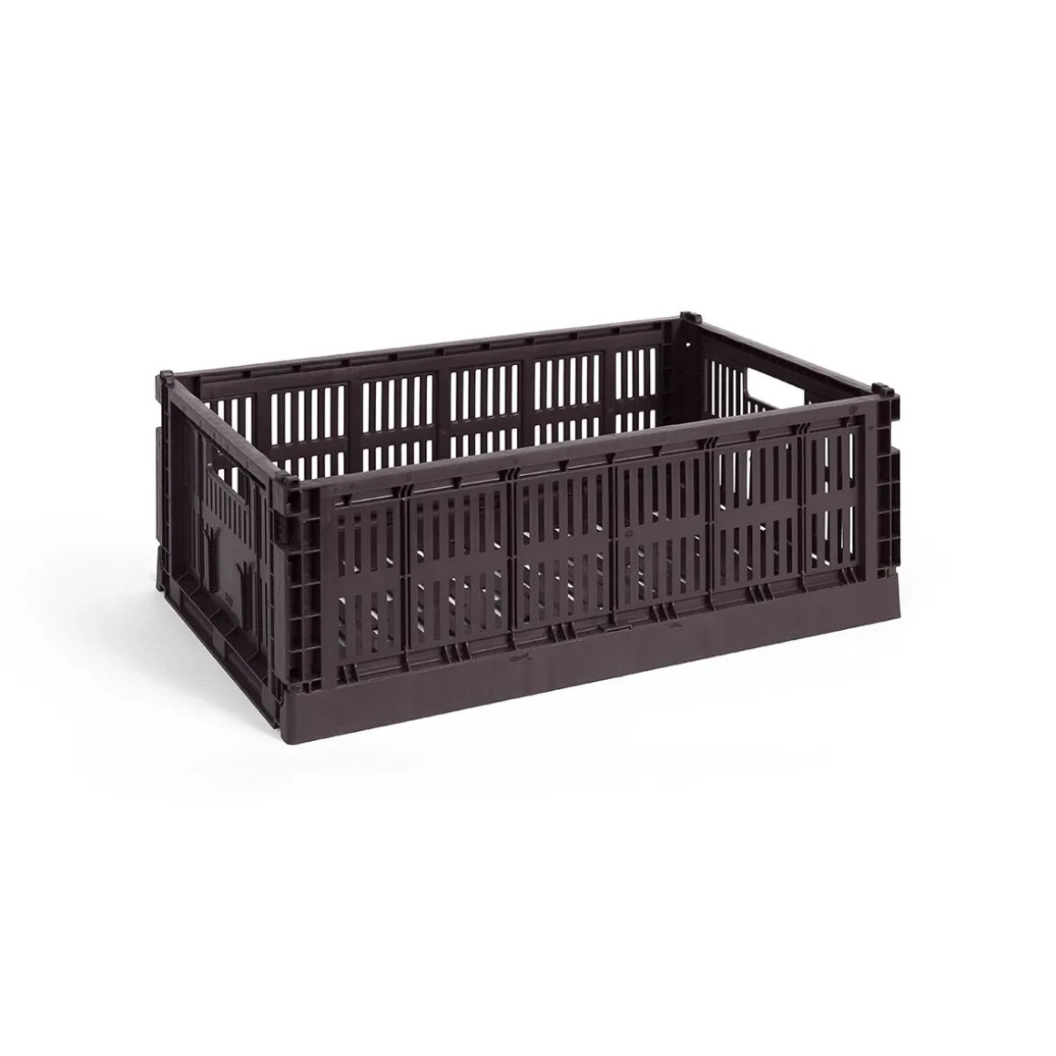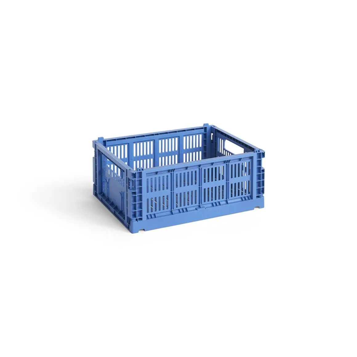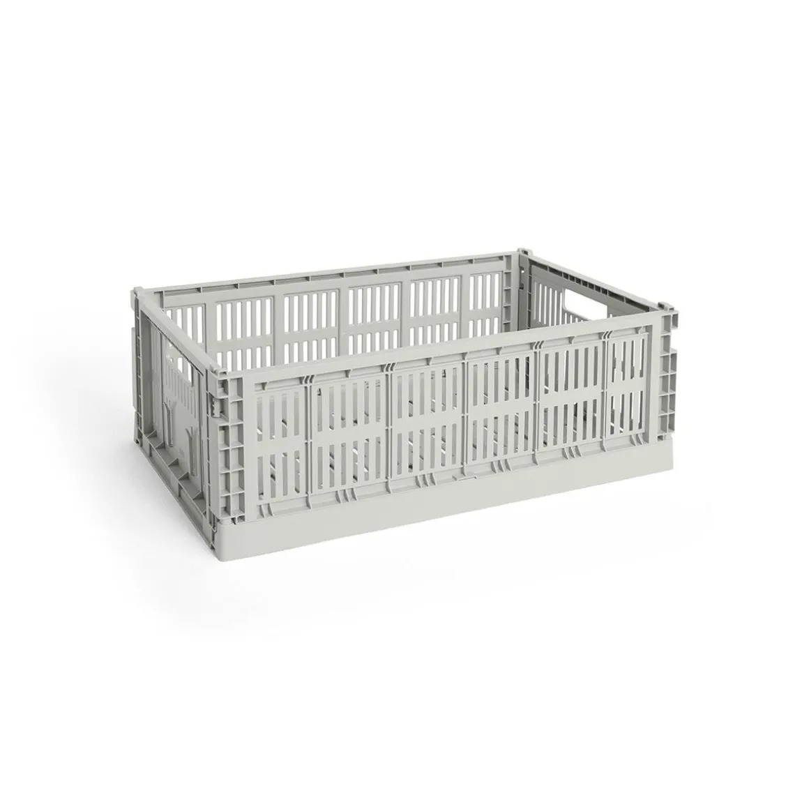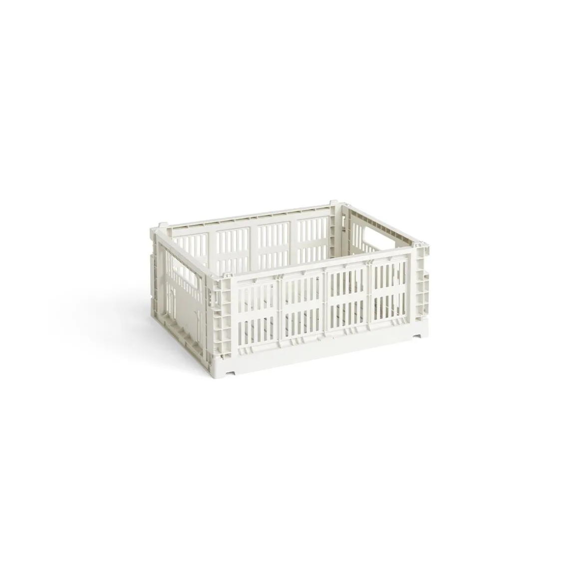 Colour Crate de Hay. La gamme Colour Crate de HAY est une gamme de boîtes de rangement pratiques et adaptables, au design perforé. Fabriquées à partir de plastique post-consommation 100% recyclé. Elles s’emboîtent les unes dans les autres selon de multiples configurations, ce qui les rend idéales pour le rangement, l’exposition et même pour des meubles innovants. Leur multifonctionnalité, combinée à leur capacité à se replier à plat lorsqu’elles ne sont pas utilisées, en fait une solution de rangement polyvalente et peu encombrante.