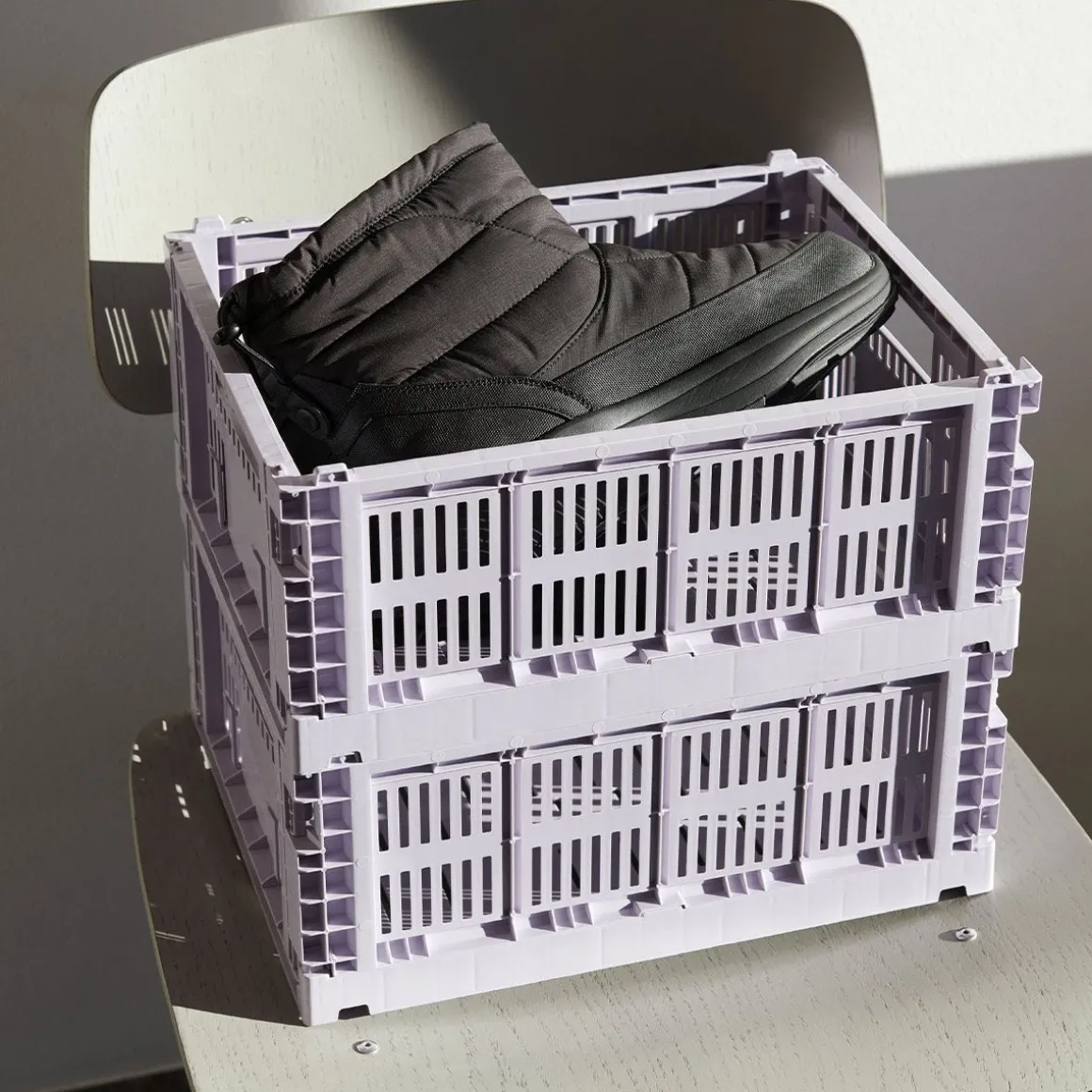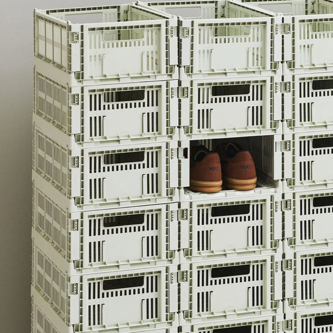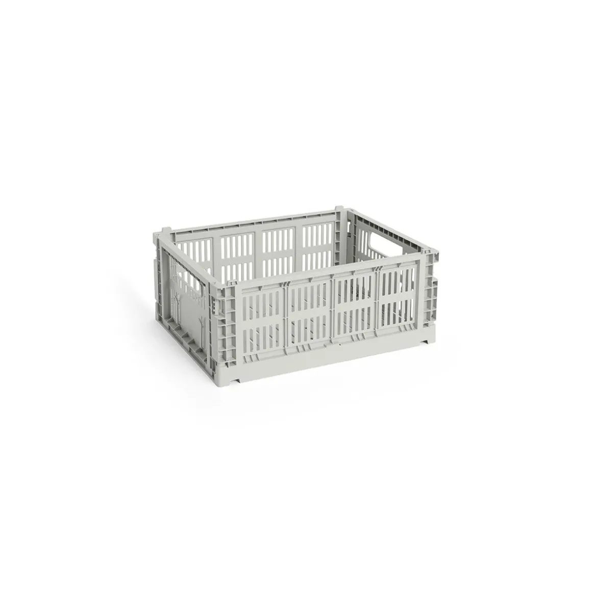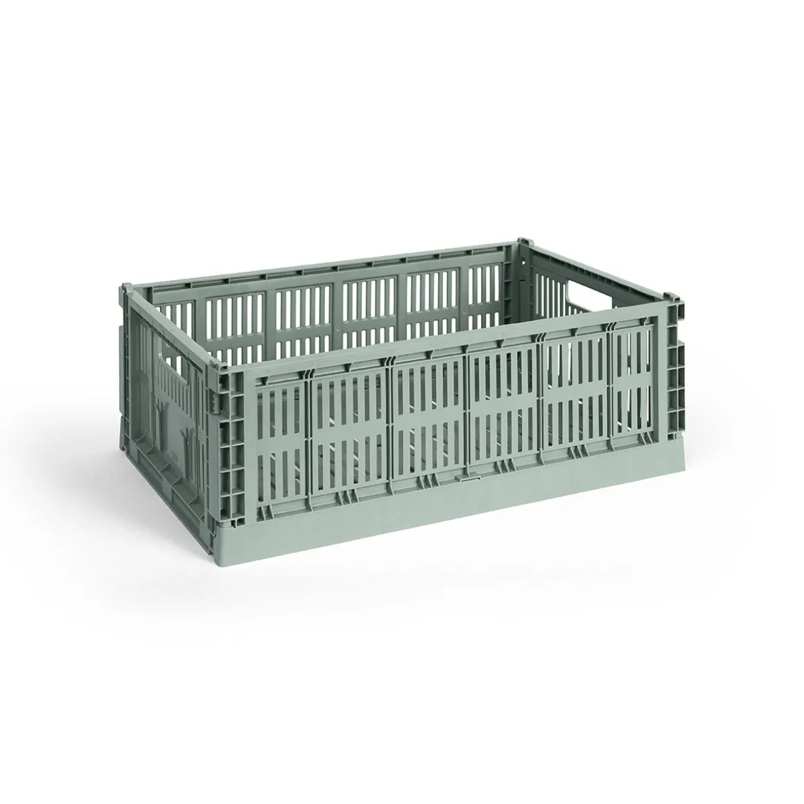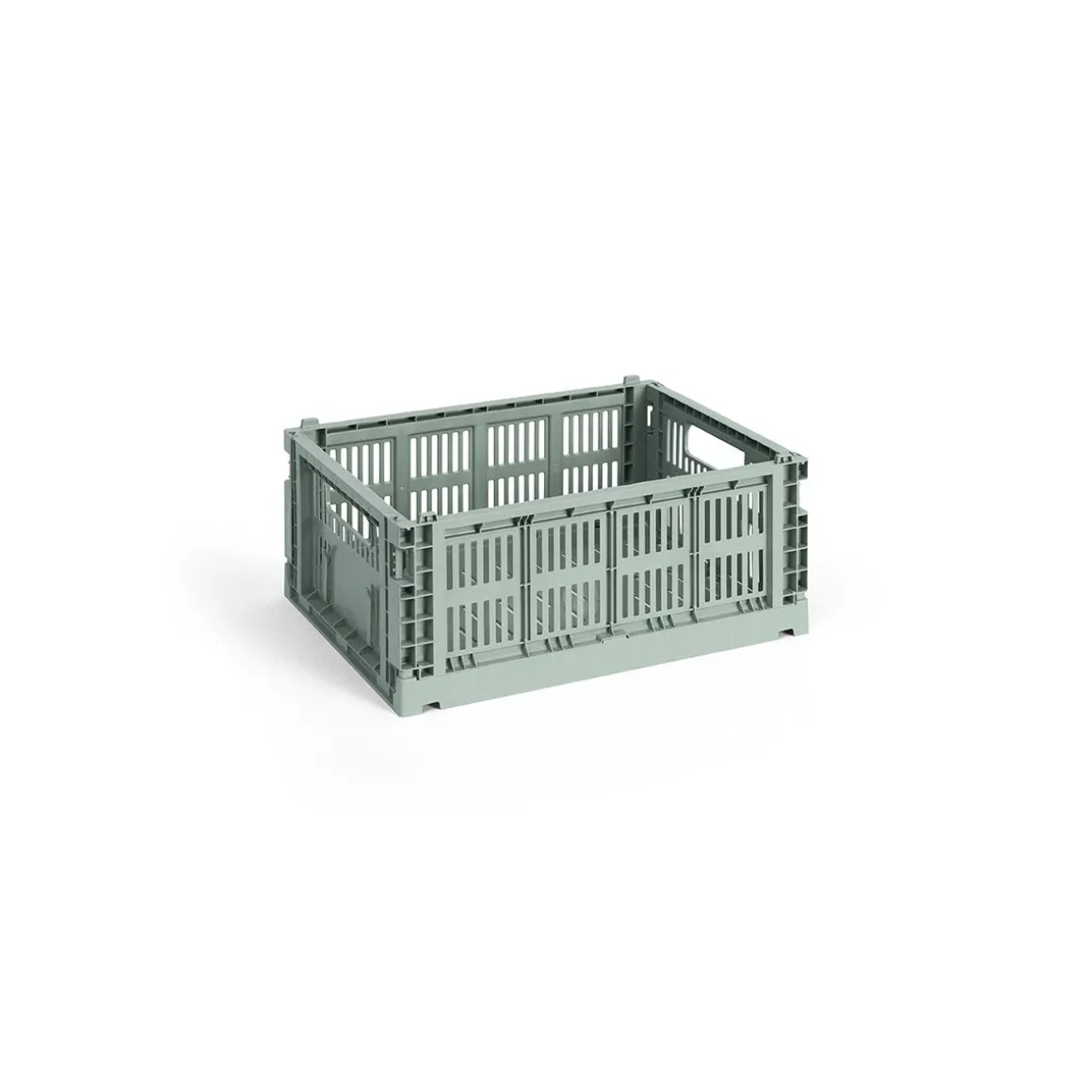 Colour Crate de Hay. La gamme Colour Crate de HAY est une gamme de boîtes de rangement pratiques et adaptables, au design perforé. Fabriquées à partir de plastique post-consommation 100% recyclé. Elles s’emboîtent les unes dans les autres selon de multiples configurations, ce qui les rend idéales pour le rangement, l’exposition et même pour des meubles innovants. Leur multifonctionnalité, combinée à leur capacité à se replier à plat lorsqu’elles ne sont pas utilisées, en fait une solution de rangement polyvalente et peu encombrante.