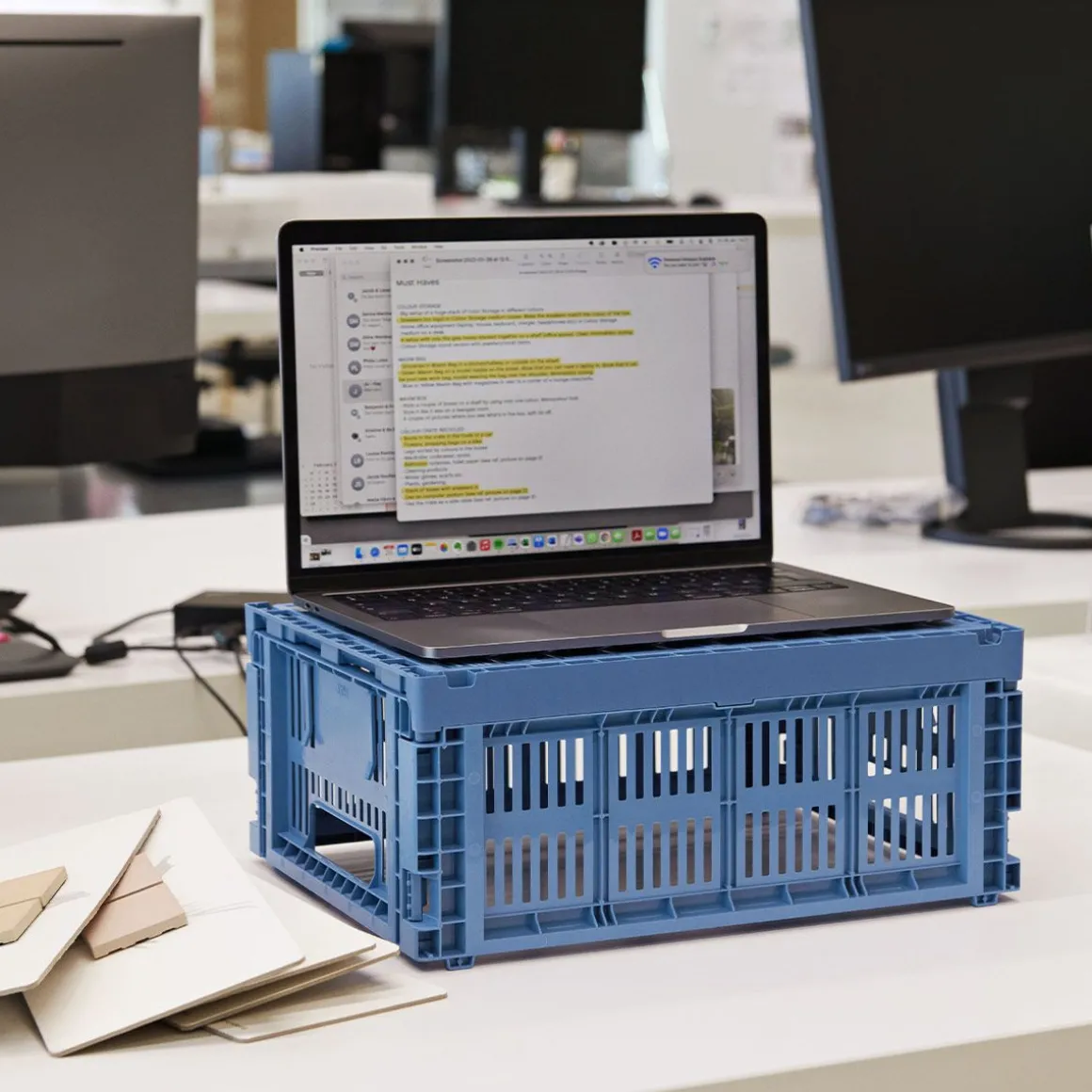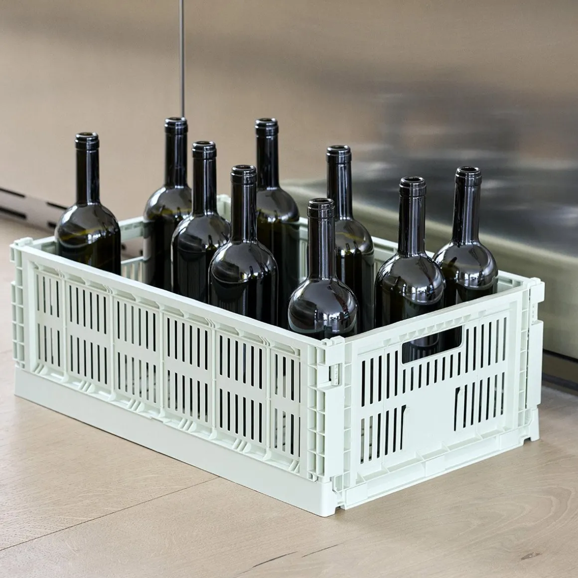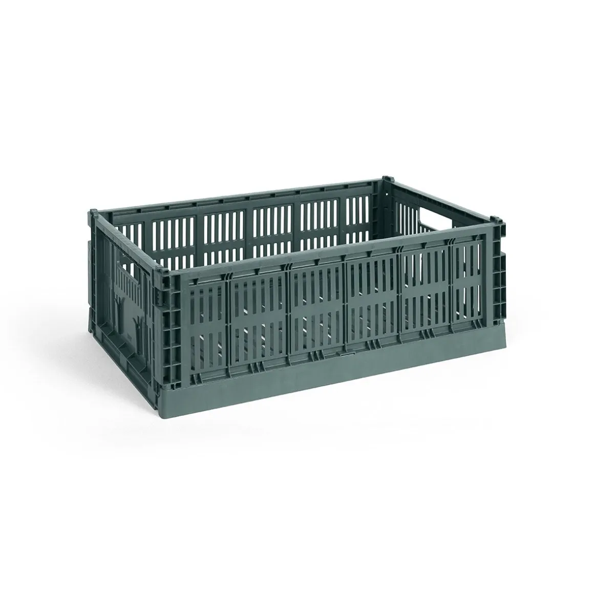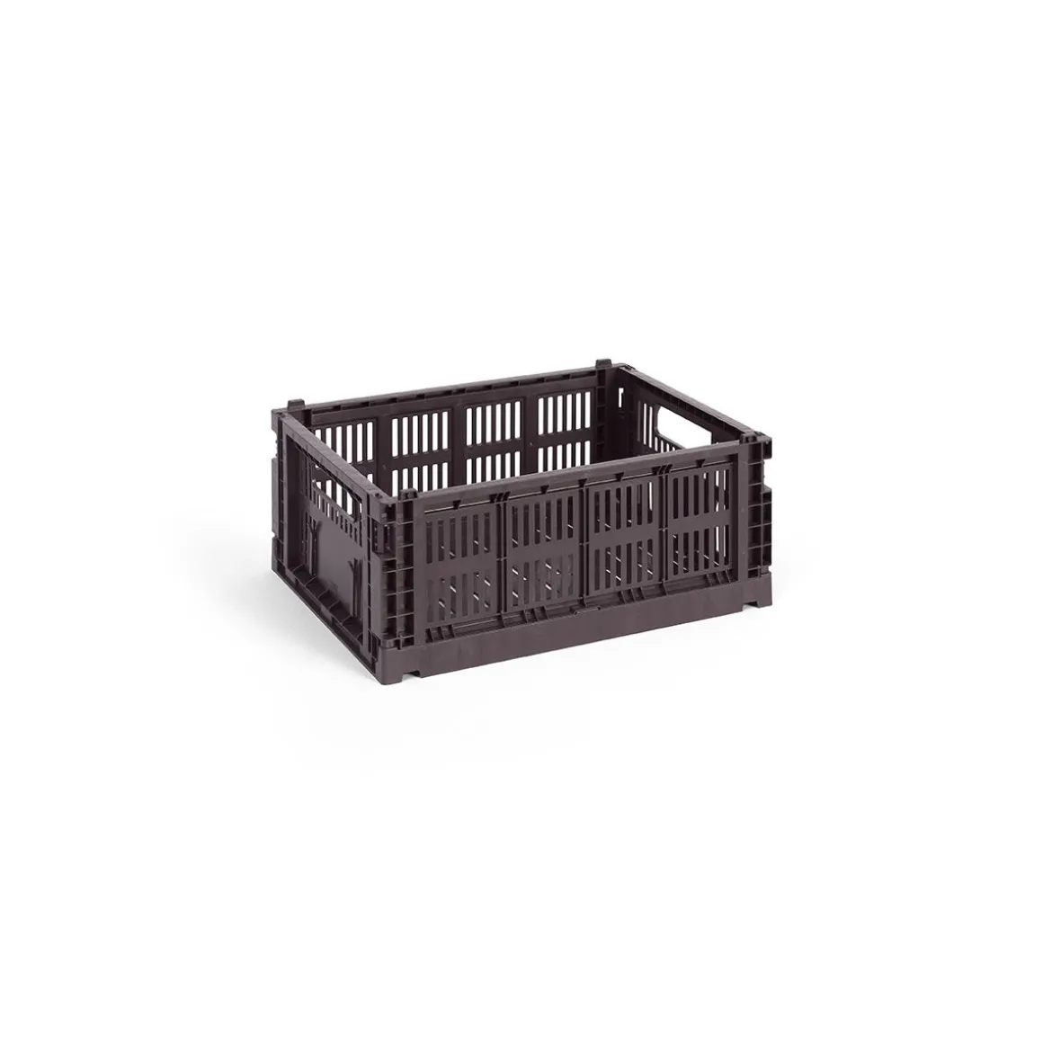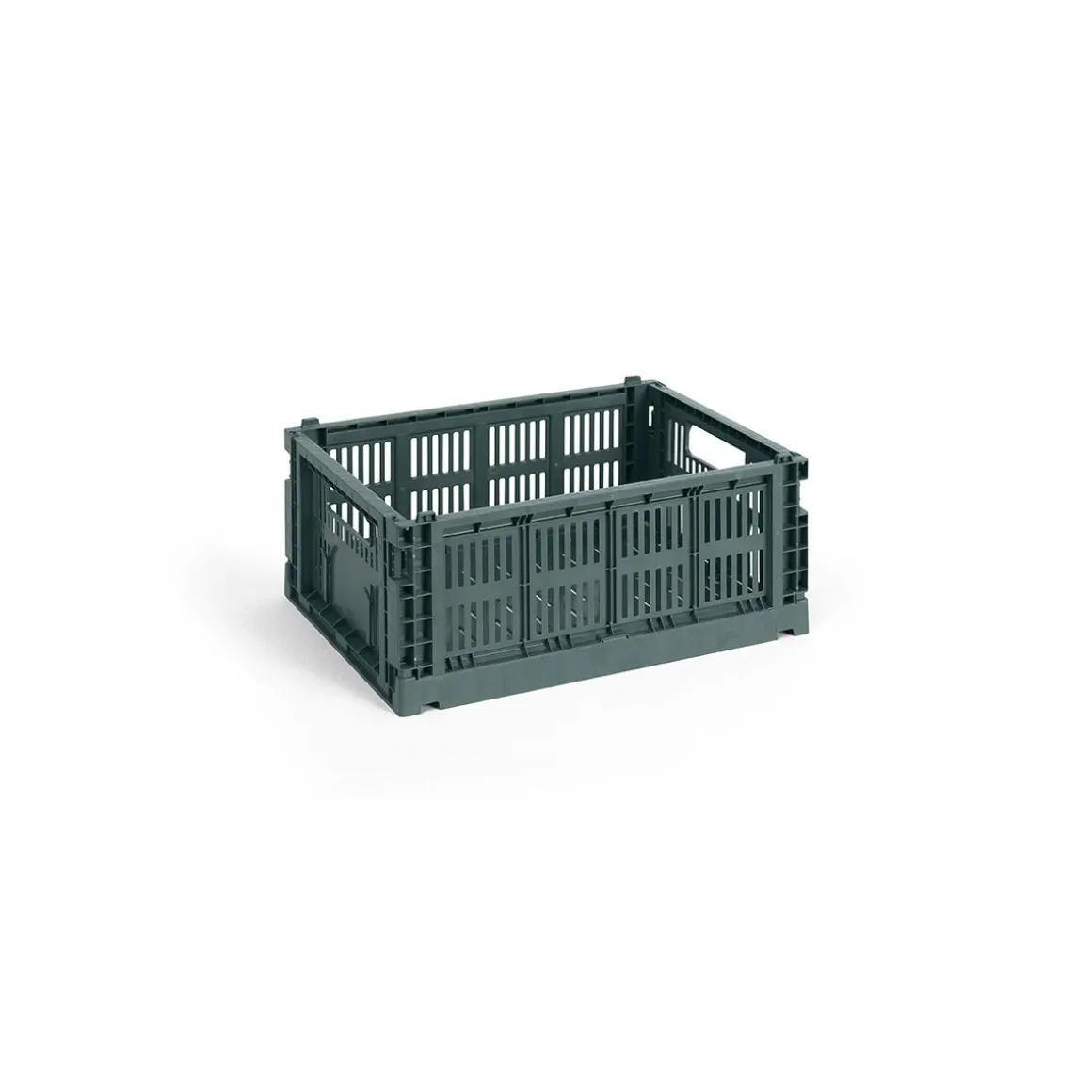 Colour Crate de Hay. La gamme Colour Crate de HAY est une gamme de boîtes de rangement pratiques et adaptables, au design perforé. Fabriquées à partir de plastique post-consommation 100% recyclé. Elles s’emboîtent les unes dans les autres selon de multiples configurations, ce qui les rend idéales pour le rangement, l’exposition et même pour des meubles innovants. Leur multifonctionnalité, combinée à leur capacité à se replier à plat lorsqu’elles ne sont pas utilisées, en fait une solution de rangement polyvalente et peu encombrante.