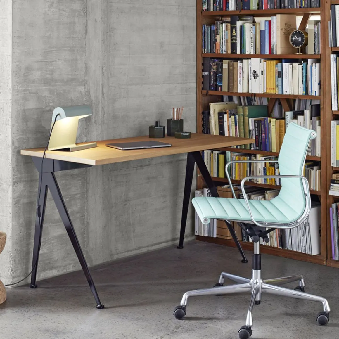 Vers 1950, Jean Prouvé crée la table Compas dans différentes versions qui sont basées sur les principes constructeurs de sa personnalité. Leur point commun sont les pieds métalliques fins, ouverts en diagonale, qui rappellent l’ouverture des branches d’un compas. Le plateau en bois massif confère à Compas Direction un charme individuel. Avec ses dimensions compactes, cette table parfaire pour un bureau à domicile nécessitant peu de papier.