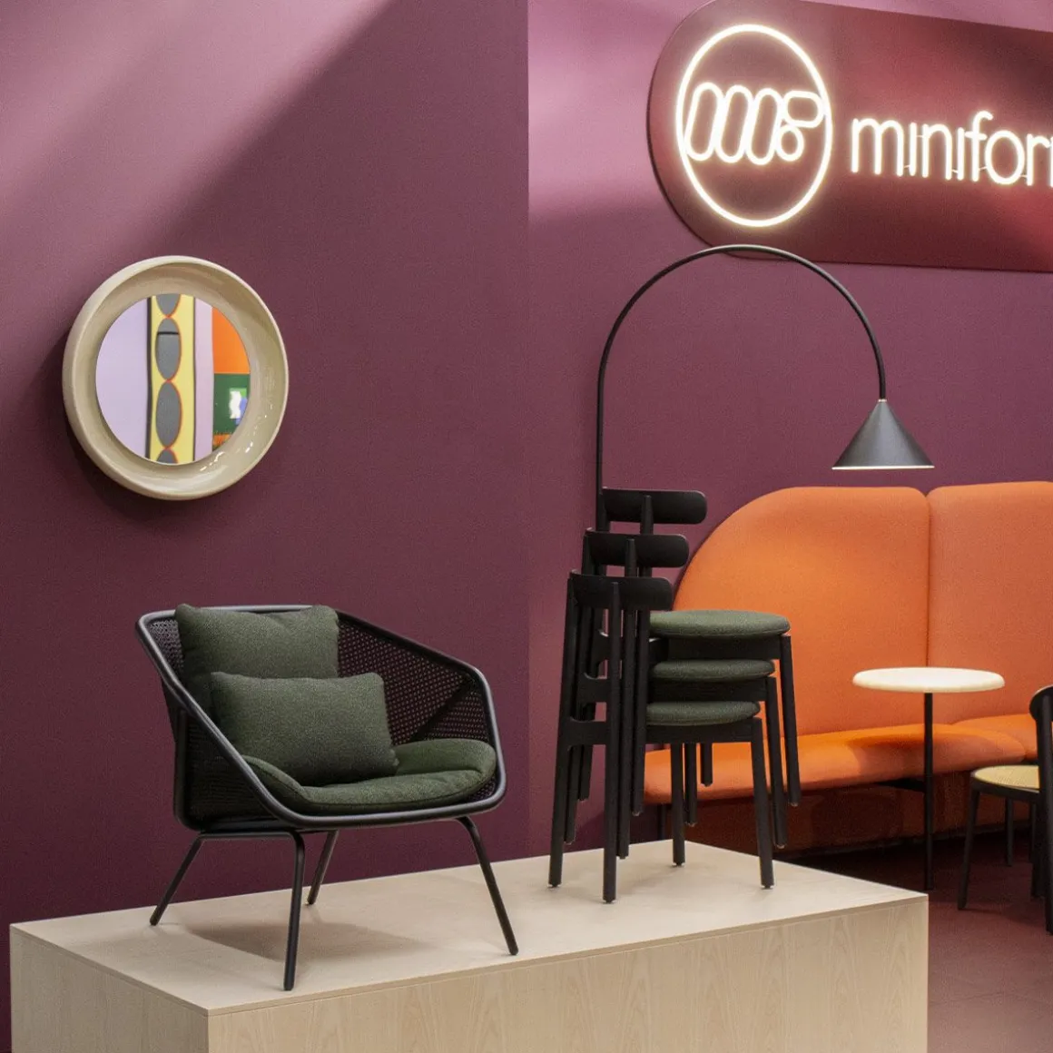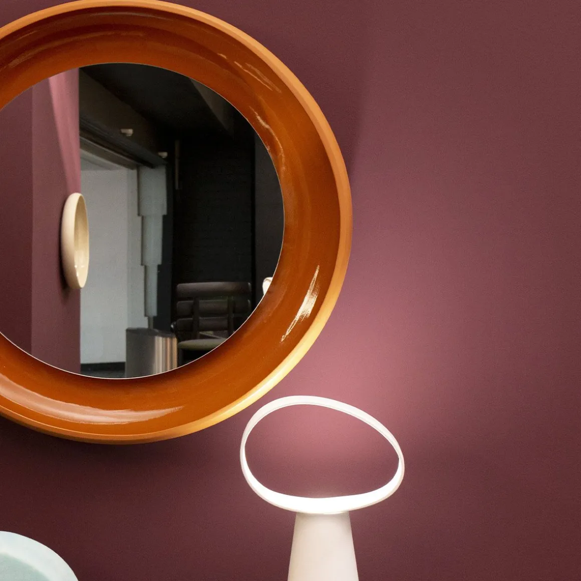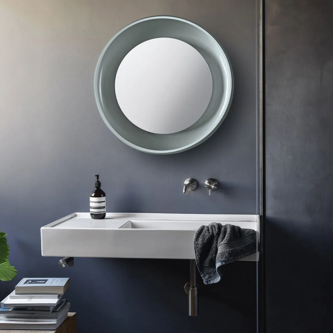Coque de Miniforms par Alain Gilles. Coque a un style dynamique et plein de contrastes. Le miroir est protégé par une coque en céramique, où se côtoient deux finitions opposées : brillante et mate. La surface de la partie interne est émaillée et brillante tandis que le revêtement extérieur est texturé. Le miroir se transforme en un objet précieux qui met en valeur les matériaux naturels, où les reflets se multiplient et donnent un sens au living.