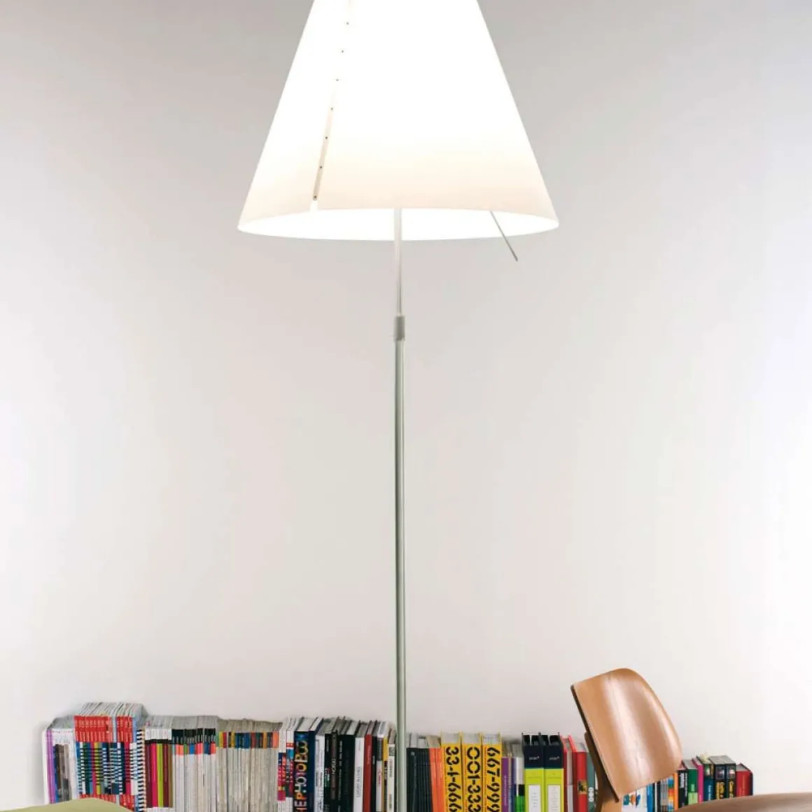 Lampadaire à la forme généreuse avec structure télescopique (réglable en hauteur). La structure est en aluminium et l’abat-jour en polycarbonate blanc. Sous une allure faussement classique, Grande Costanza impose une présence très design, alliant séduction, élégance et sobriété. Son abat-jour surdimensionné est réalisé en polycarbonate. Il diffuse une lumière douce et intense, idéale pour éclairer chaleureusement les volumes des intérieurs privé ou publics. Le contrepoids en acier chromé mat assure la stabilité tout en apportant une dimension décorative. La réglage de l’intensité se fait grâce à un variateur sensoriel en forme de petite tige, située sous l’abat-jour.