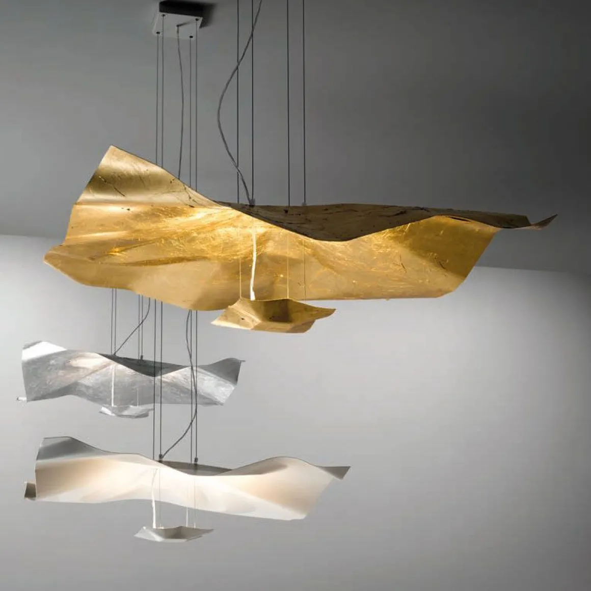 Crash se présente sous des formes de sculptures-satellites en acier malléable façonné à la main, de couleur glaciale, un total look monochromatique en feuille d’or, d’argent et éclat blanc total avec sa lumière réfléchissante. Une lumière monolithique qui atteint le sommet de sa forme grâce à la manipulation artisanale habile et irremplaçable qui signe et contresigne la marque KNIKERBOKER.
