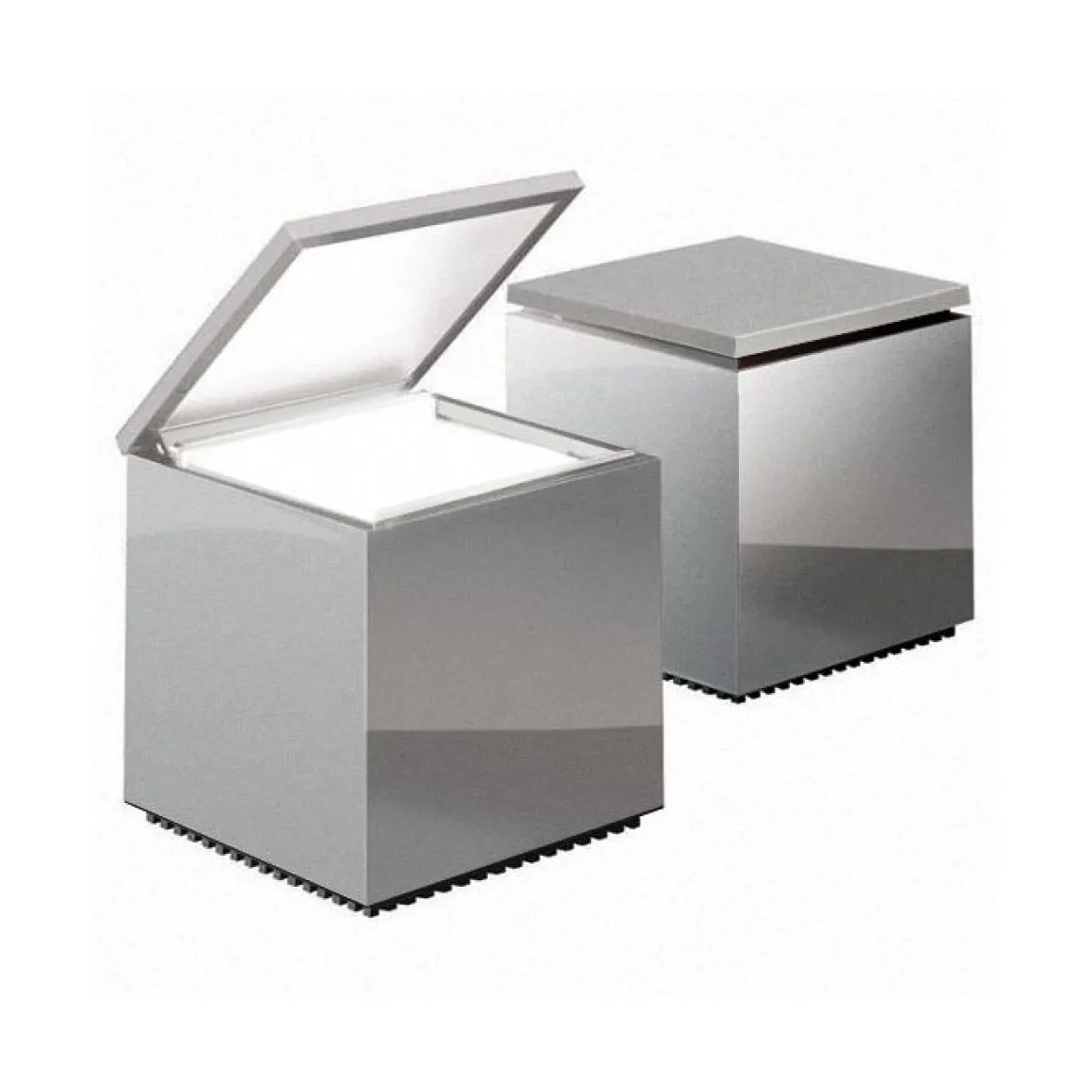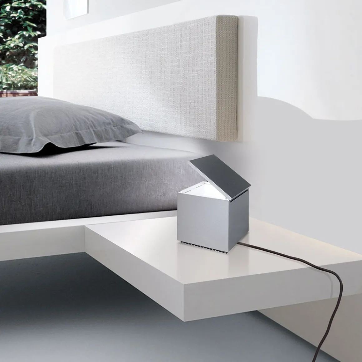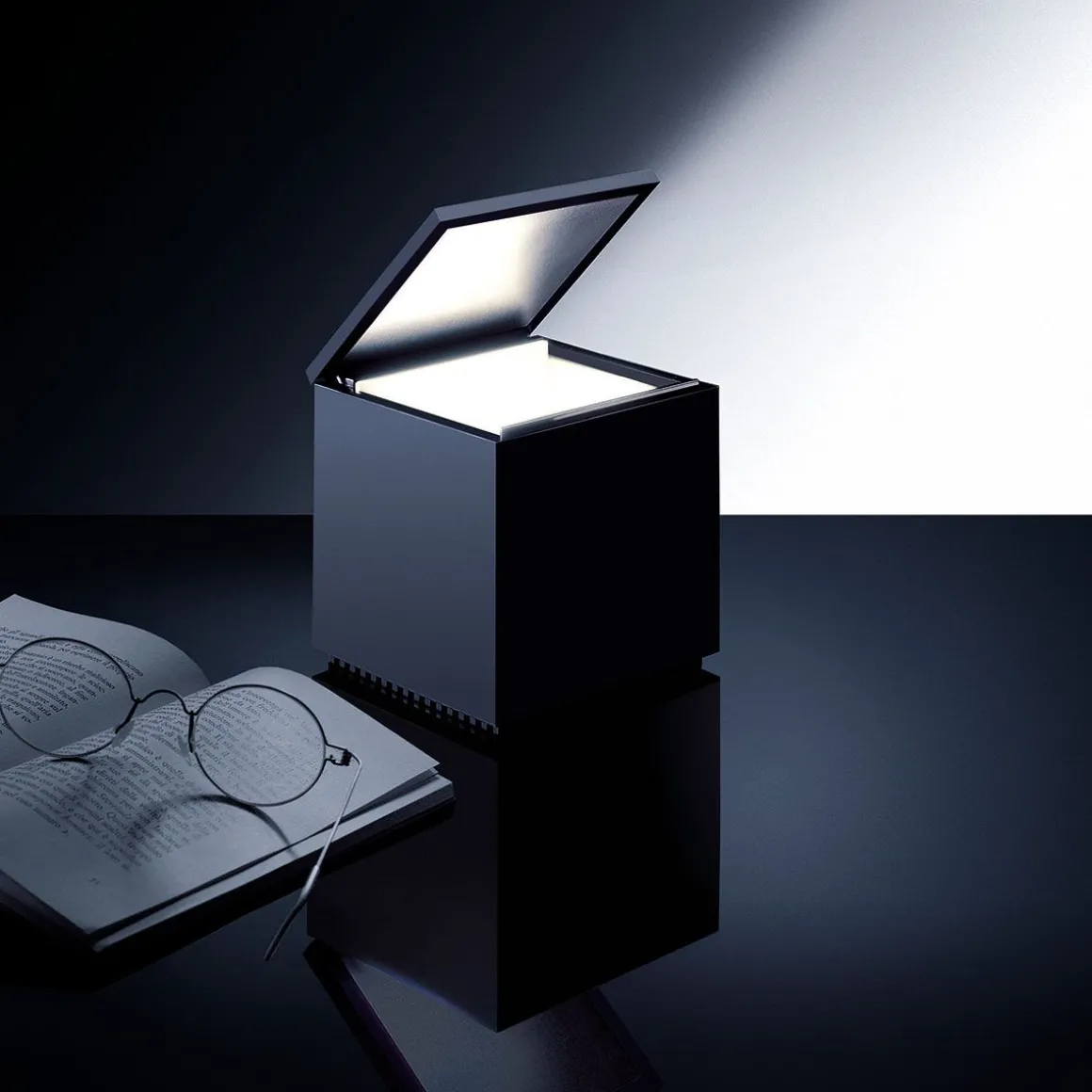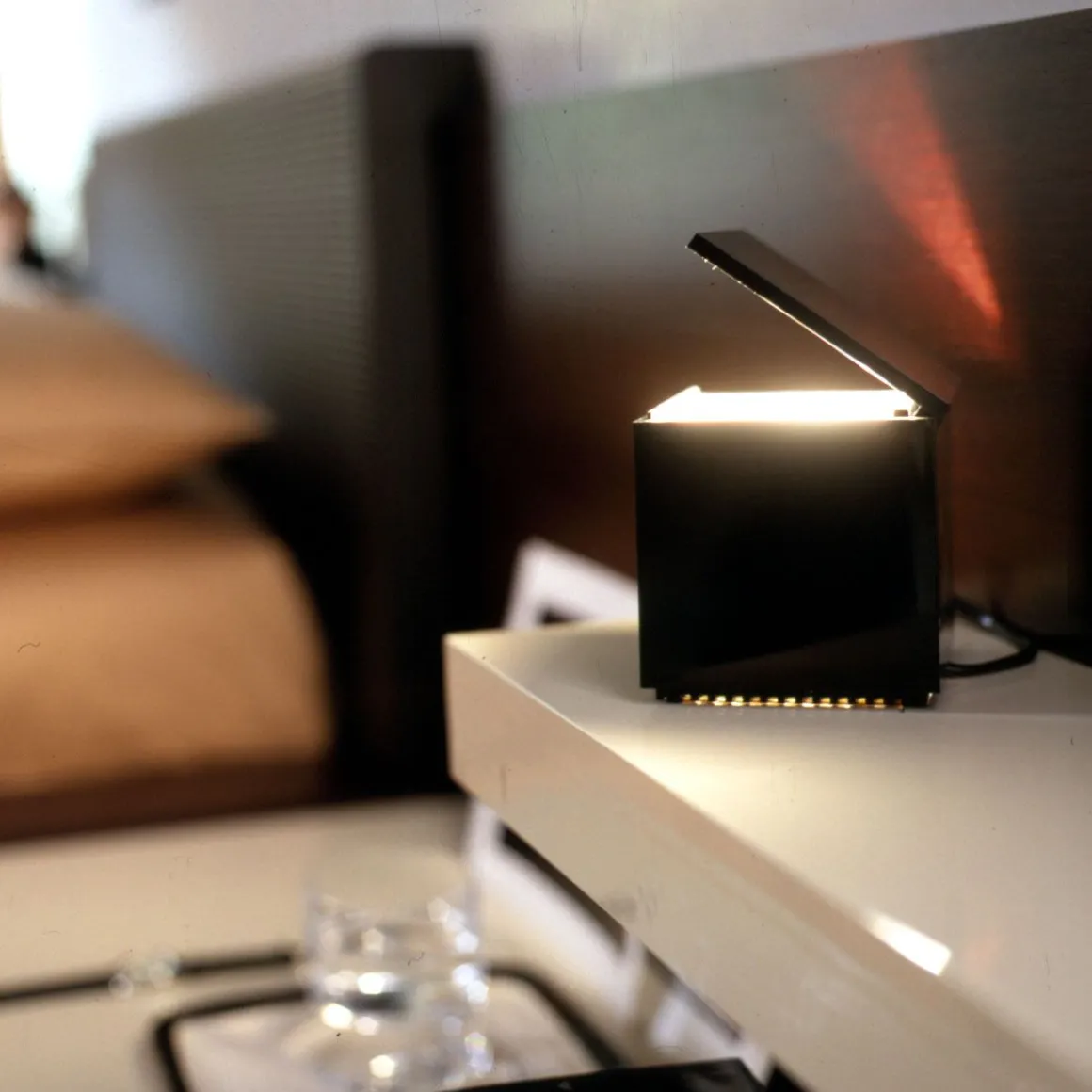 Cuboluce, pour lire au lit. Elle s’allume en soulevant le couvercle et s’éteint en l’abaissant, évitant ainsi la recherche de l’interrupteur. Elle émet un faisceau lumineux concentré, orientable à l’aide du couvercle/réflecteur. Acquise dans la “Collection d’Étude de Design” du Musée d’Art Moderne de New York.