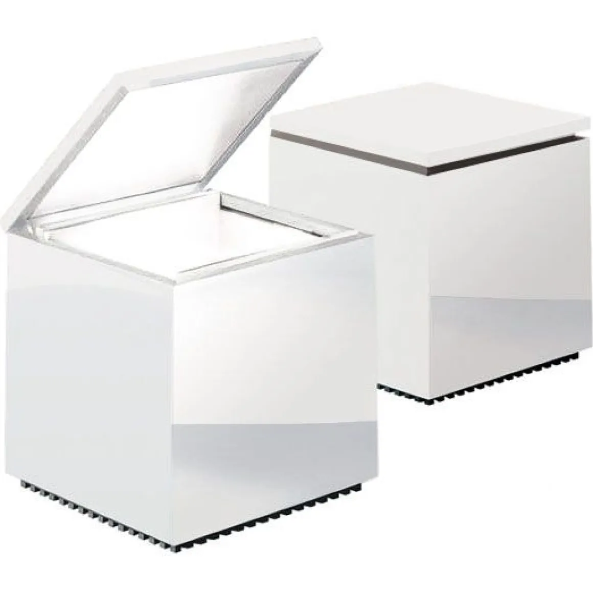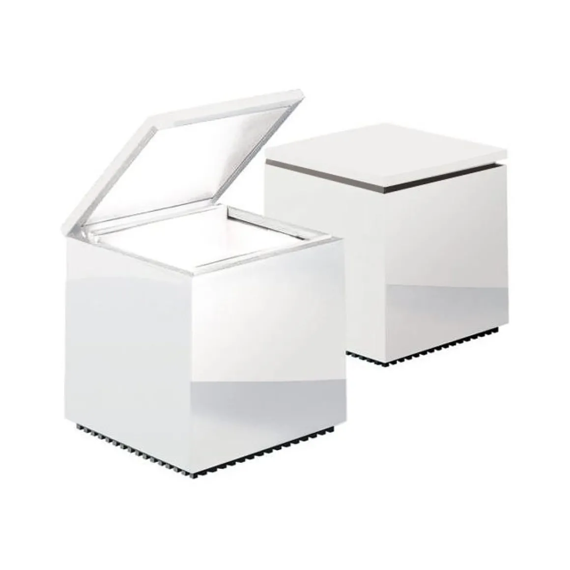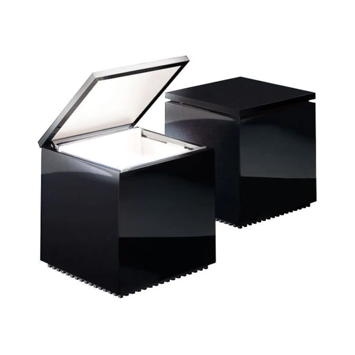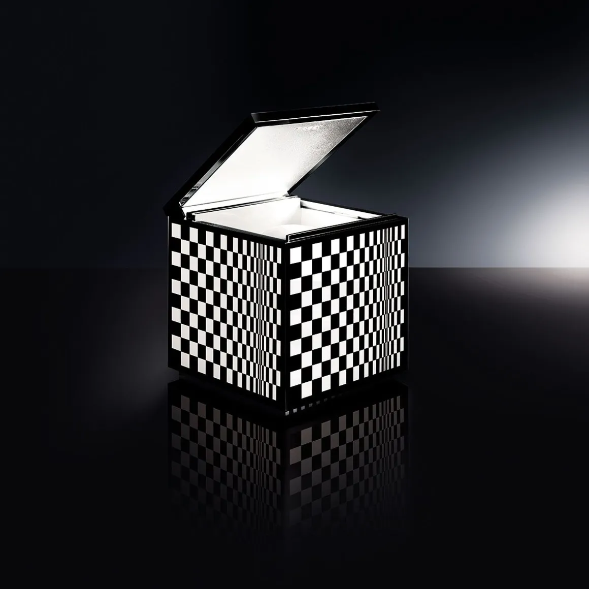 Cuboluce, pour lire au lit. Elle s’allume en soulevant le couvercle et s’éteint en l’abaissant, évitant ainsi la recherche de l’interrupteur. Elle émet un faisceau lumineux concentré, orientable à l’aide du couvercle/réflecteur. Acquise dans la “Collection d’Étude de Design” du Musée d’Art Moderne de New York.
