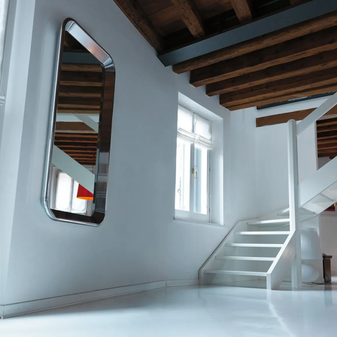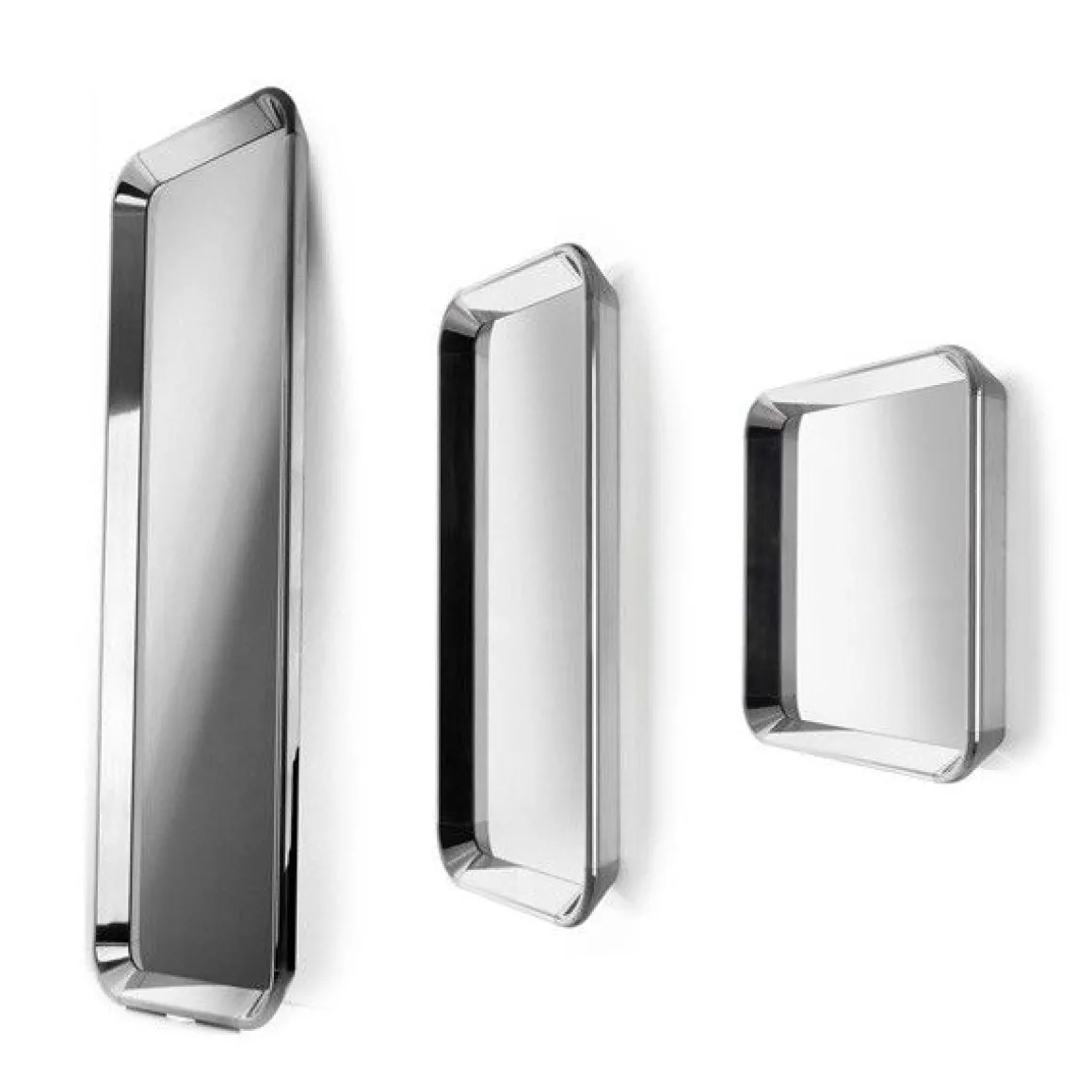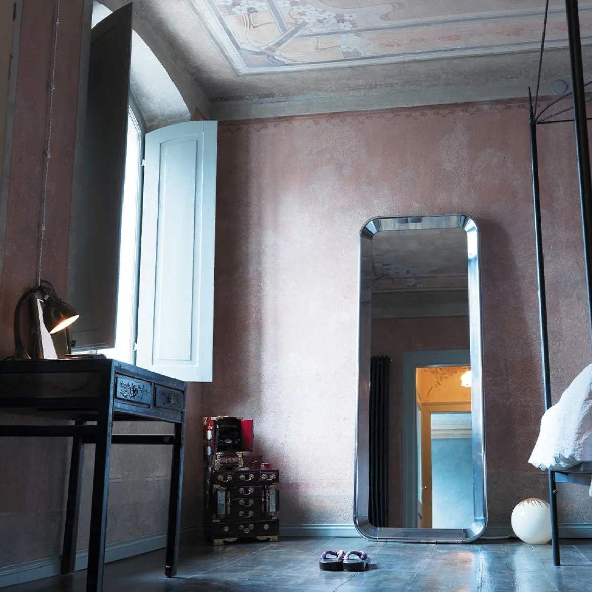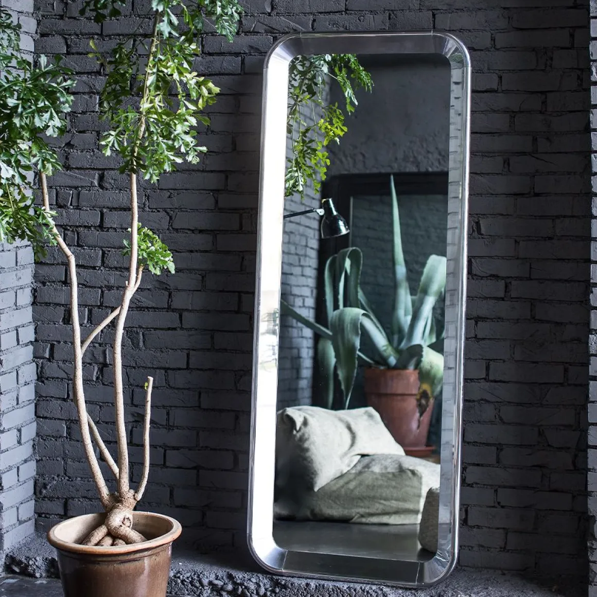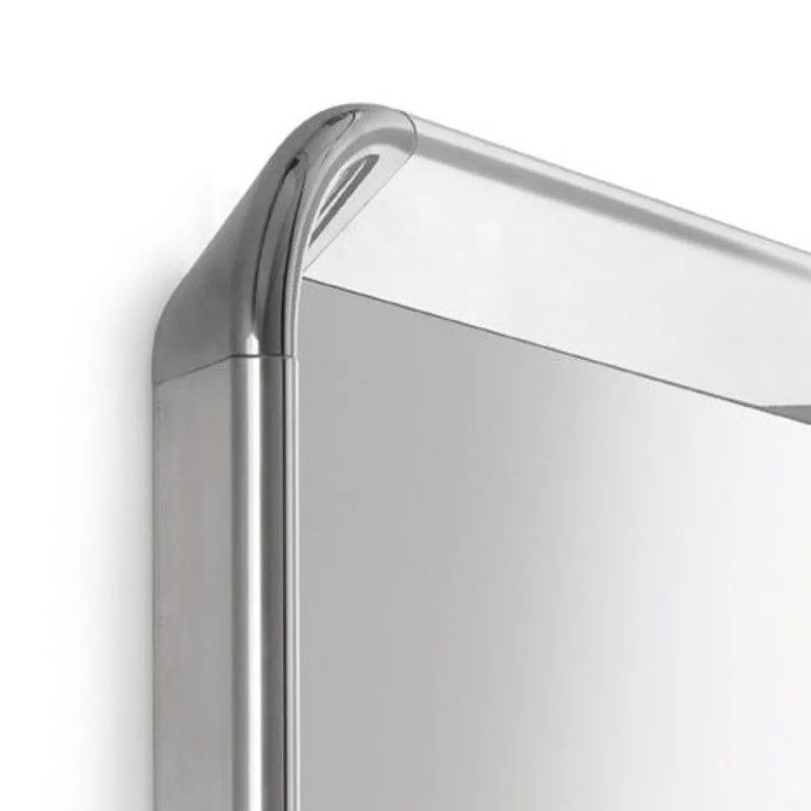 Matériaux : Cadre en aluminium extrudé poli. Joints en fonte d’aluminium. Miroir avec pellicule plastique de protection sur le dos. Crochets en fer zingué pour la fixation murale inclus