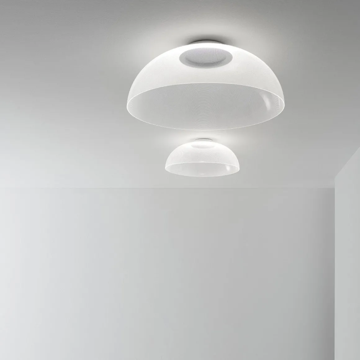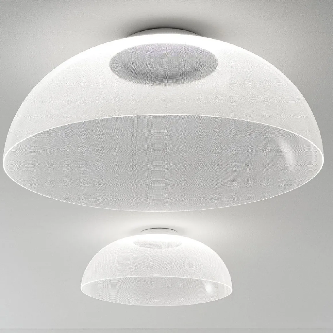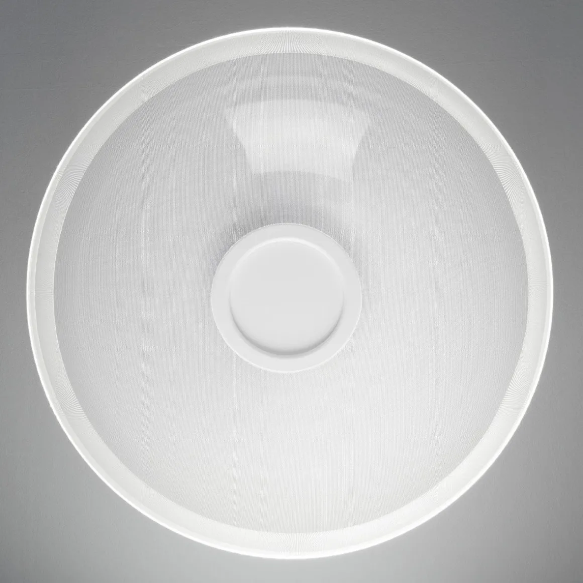 Demì, lorsqu’il est éteint, est une grande coupole transparente. Grâce à la technologie exclusive OptiLight™, lorsqu’il est allumé, le bord inférieur et les milliers de micro-incisions laser de la surface diffusent une lumière douce et homogène. Celle-ci est générée par une source LED invisible située dans l’anneau du grand trou supérieur qui, comme dans l’ancien Panthéon, est la source de lumière.