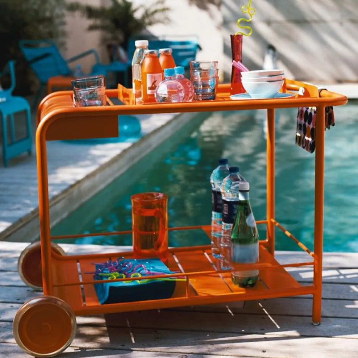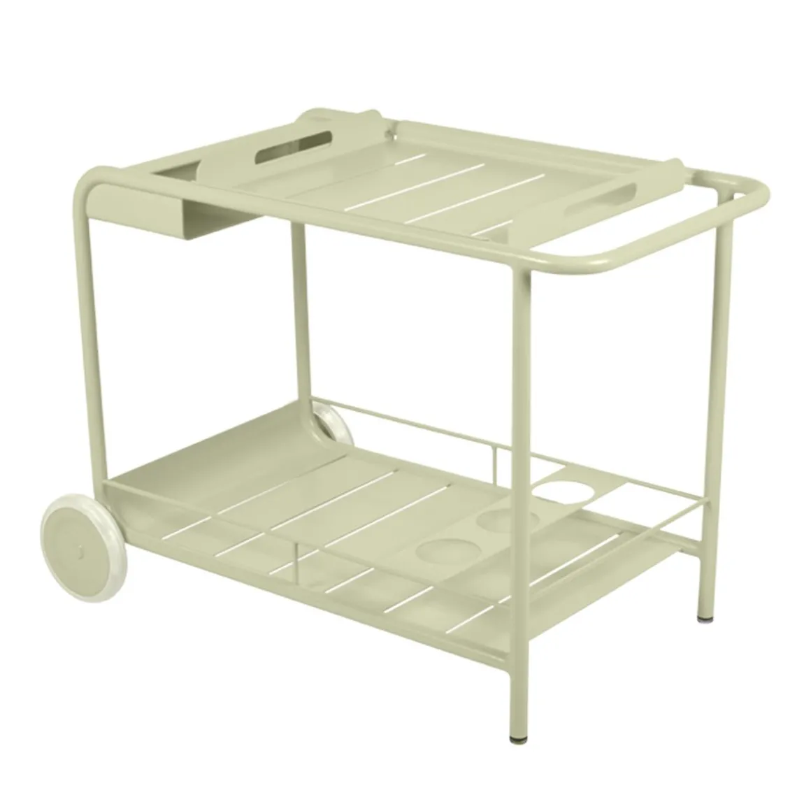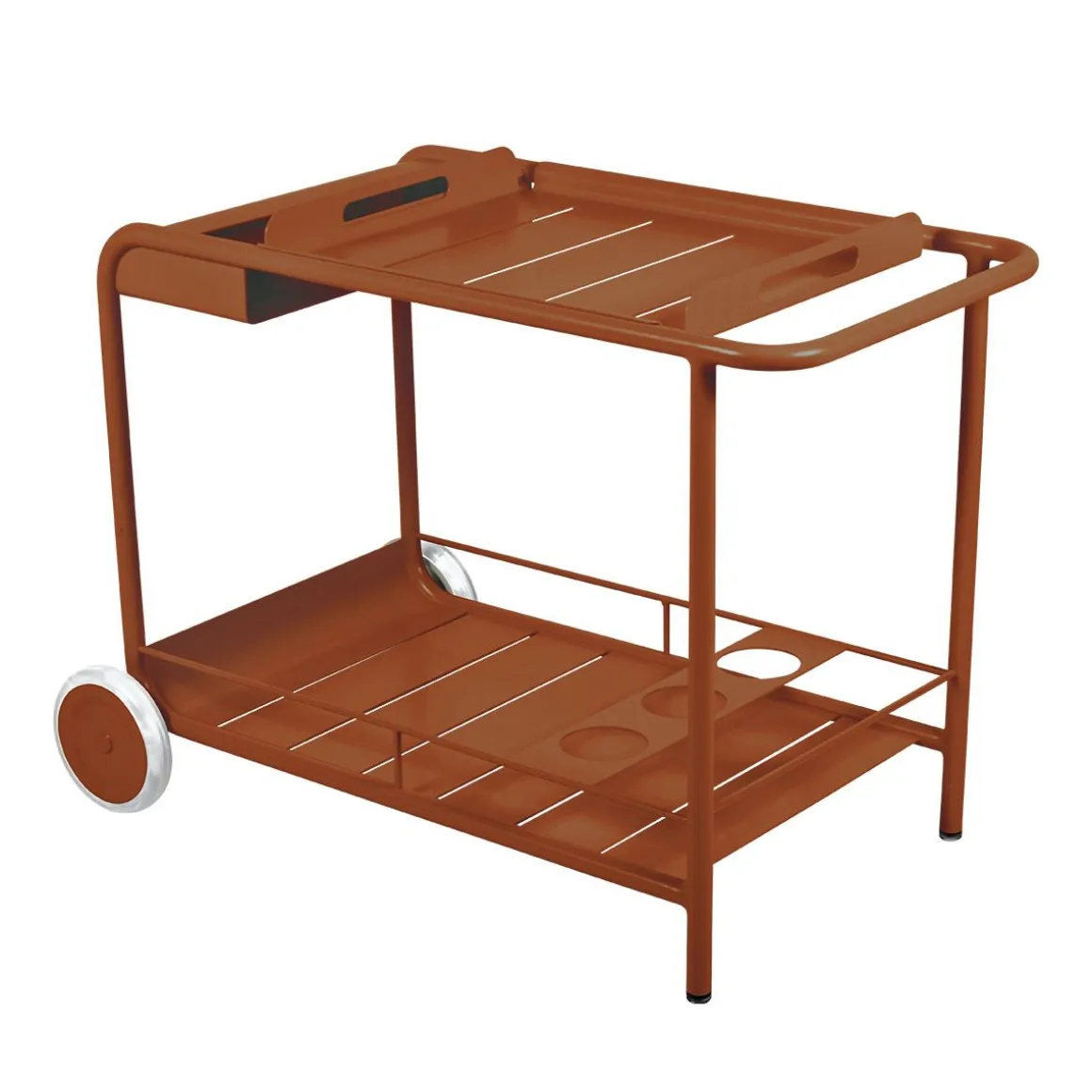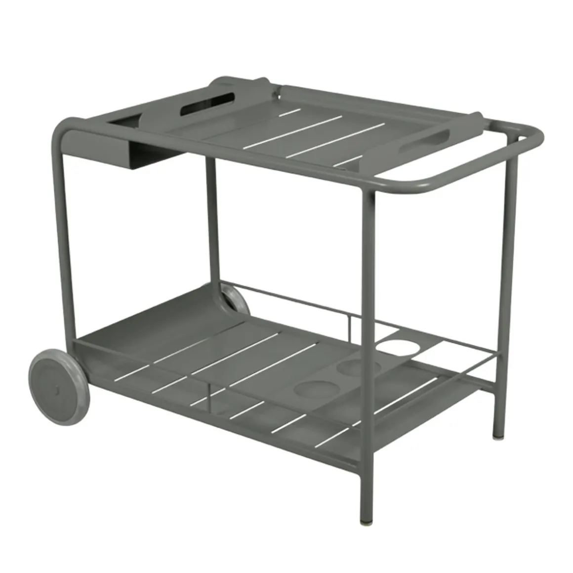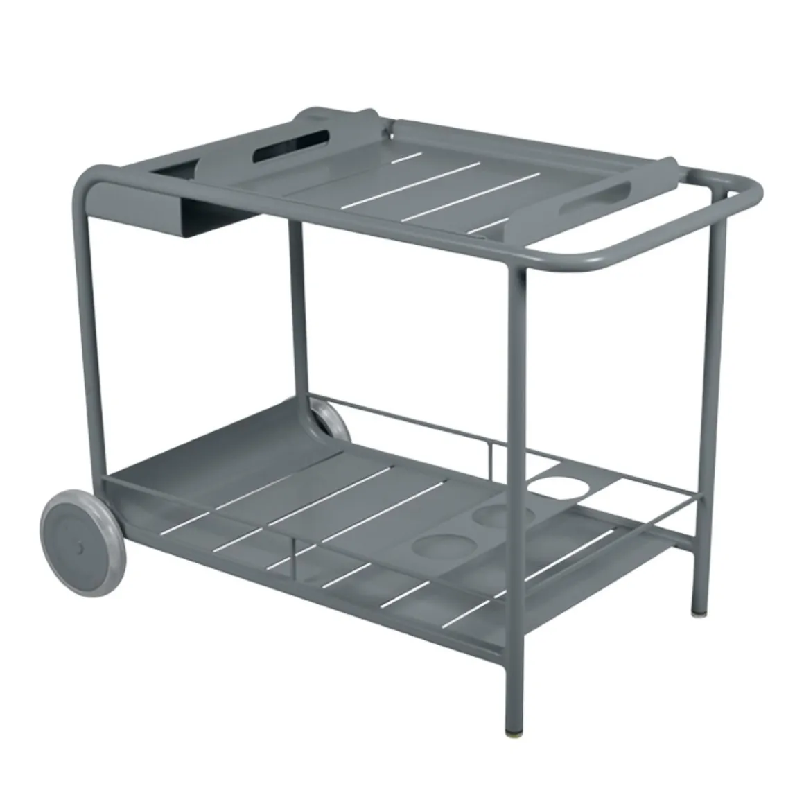 Desserte Luxembourg de Fermob par Frédéric Sofia. Cette desserte-bar au plateau amovible, idéale pour le service, vous suivra partout grâce à ses 2 roues. Elle combine l’essentiel : l’esthétisme et la praticité avec sa conception astucieuse (plateau amovible, rangement pour les bouteilles, etc.) ! Entièrement réalisée en aluminium, cette desserte roulante résiste aux conditions extérieures, même les plus rudes, et se déplace facilement. Elle trouve évidemment particulièrement bien sa place lorsqu’elle accompagne un ensemble table et chaises Luxembourg : astucieux rappels déclinables en une multitude de couleurs.