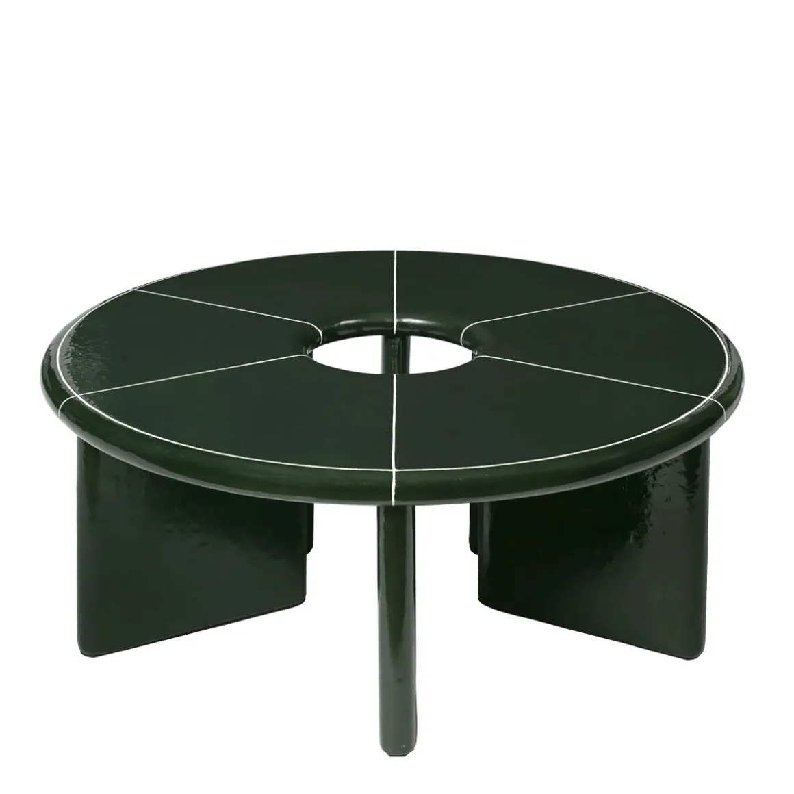 Deya de Ferm Living. Fabriquée en béton fibré, la Table basse Deya présente un émaillage vert foncé étonnant avec une texture irrégulière, accentuée par des lignes d’enduit blanc cassé. Le plateau de table segmenté présente un design géométrique audacieux, complété par des bords généreusement arrondis pour une présence adoucie. Avec son équilibre entre savoir-faire artisanal et géométrie audacieuse, la Table basse Deya est une pièce polyvalente qui convient aussi bien aux espaces intérieurs qu’extérieurs.