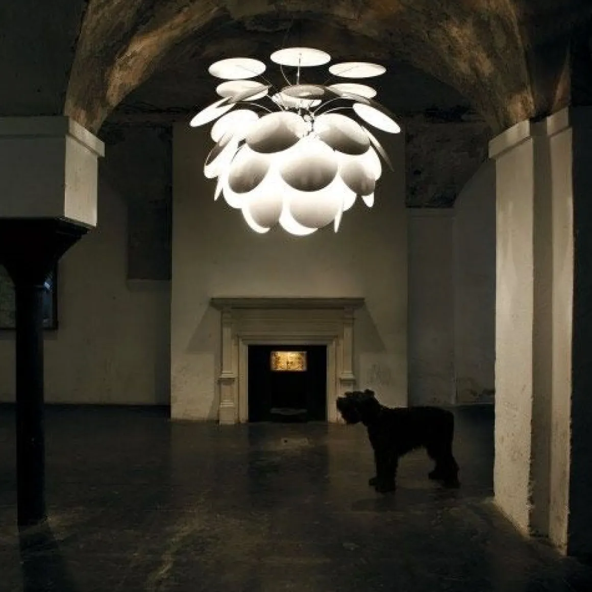 Exubérant même quand elle est éteint, la richesse de l’éclairage issue de la lampe Discocó permet une illumination directe vers le bas avec un jeu spectaculaire de lumières et des ombres douces.