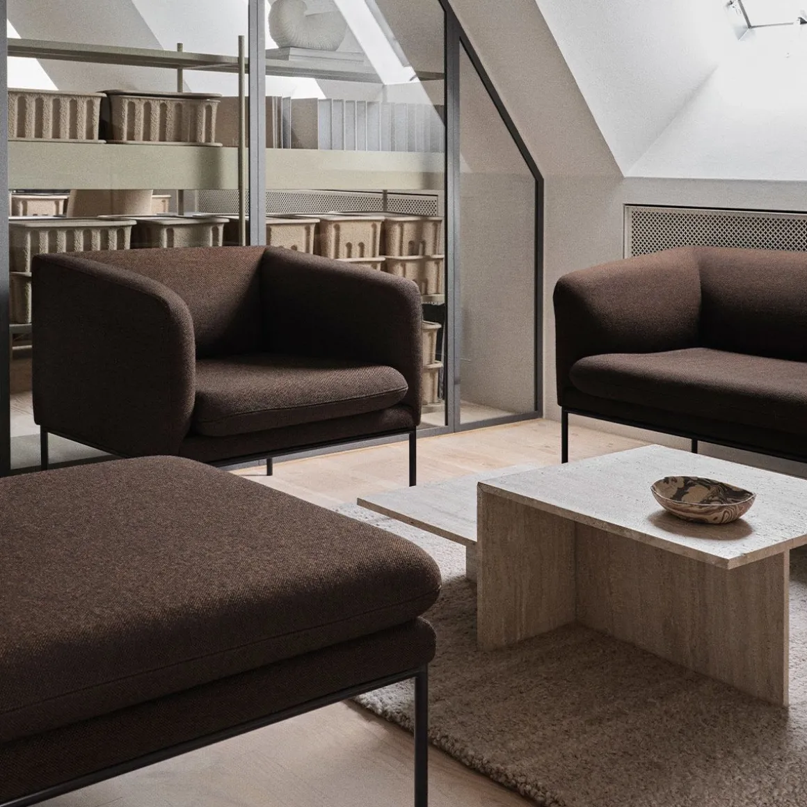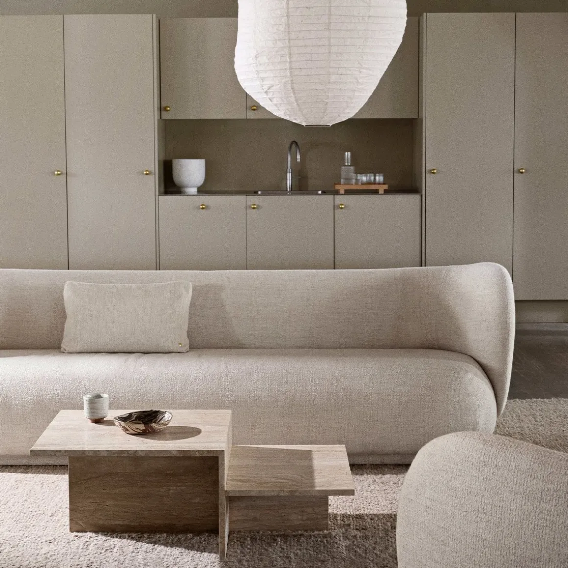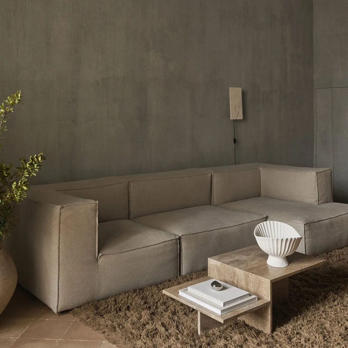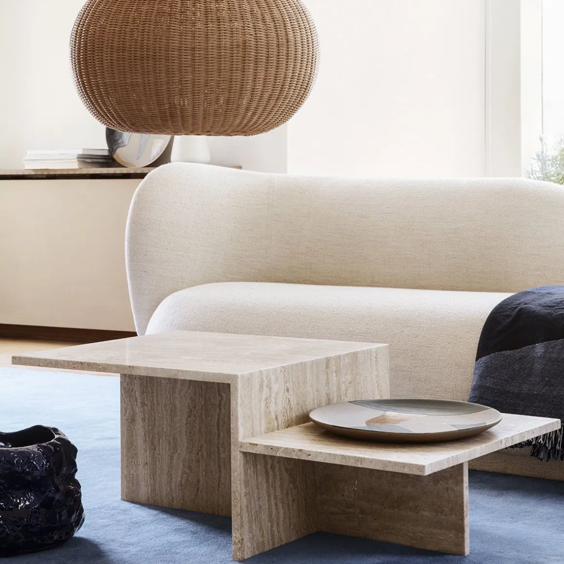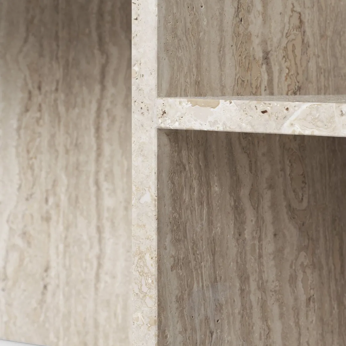 Initialement inspirée par le minimalisme japonais, la table basse Distinct explore la création de structures complexes basées sur un seul élément. La construction minimaliste crée un contraste avec la richesse des textures terreuses du travertin. Avec les qualités naturelles et diverses du calcaire de couleur sable, elle offre une crudité et une tangibilité qui mettent en valeur le caractère architectural de la pièce de mobilier.