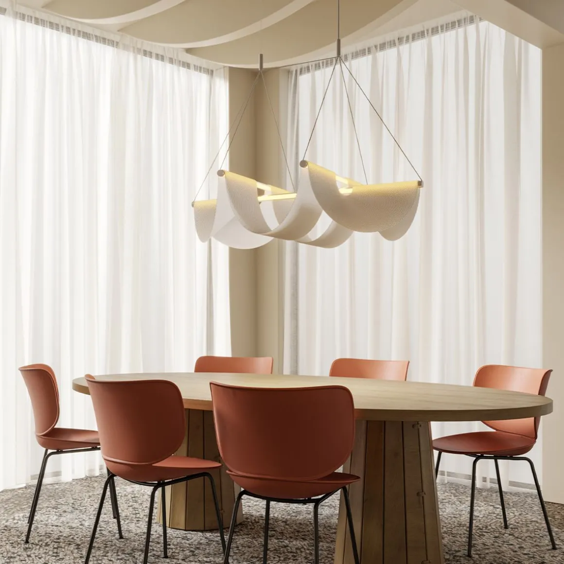 Matériaux : tubes de verre avec détails en aluminium, tissus PL tricoté 3D drapé