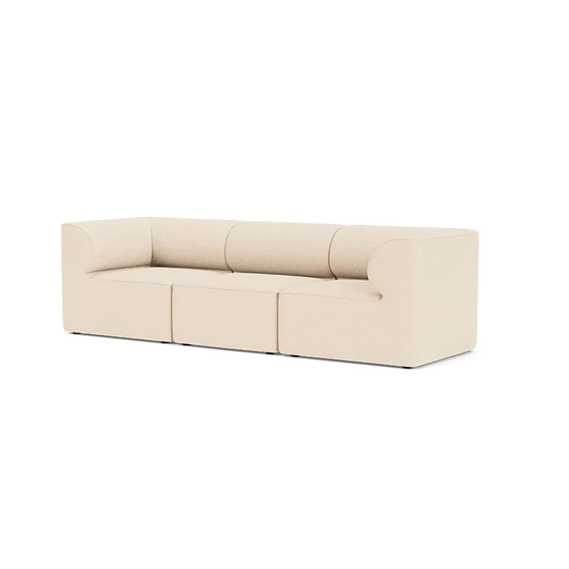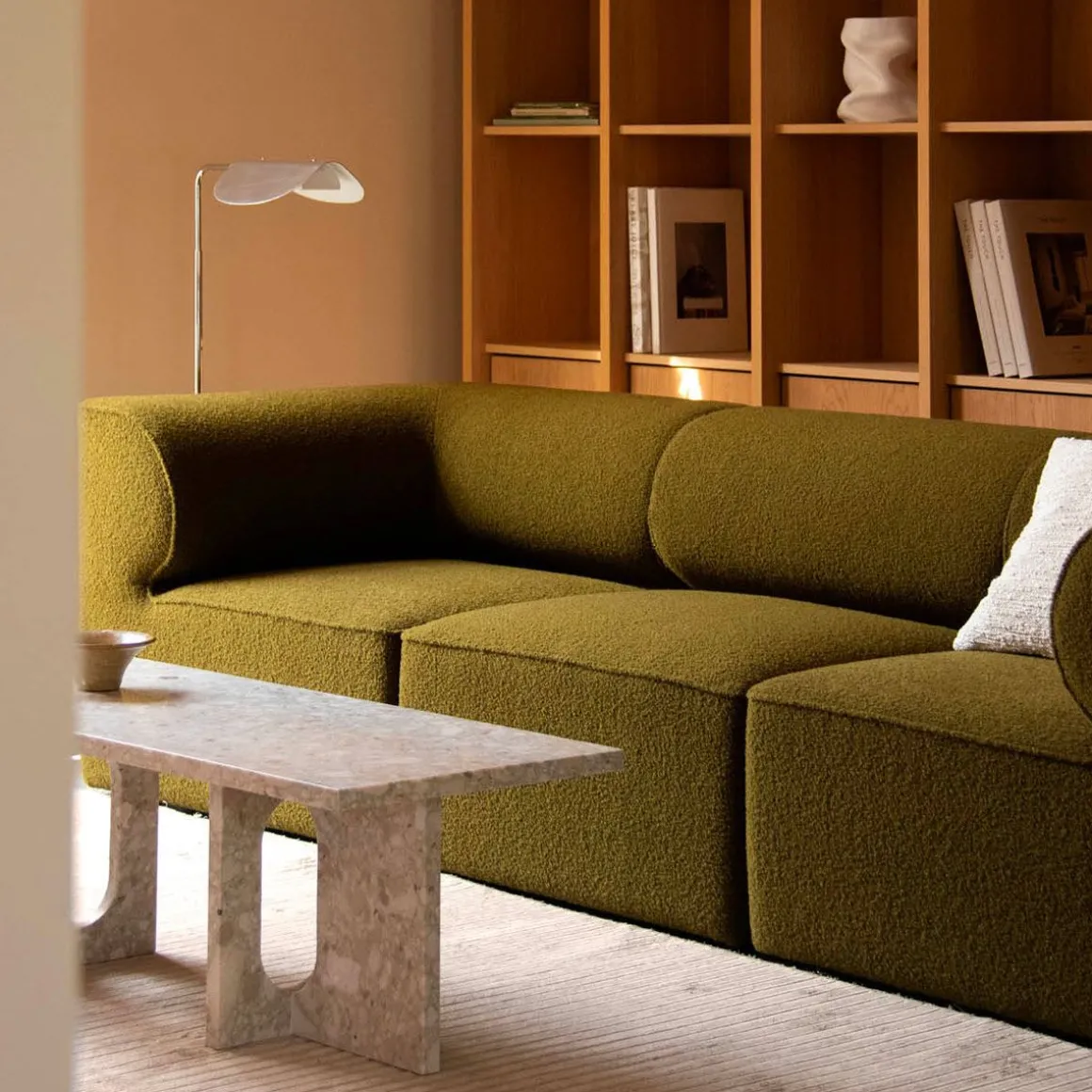 Eave Seamline de Audo par Norm Architects. Inspiré par l’architecture, le canapé modulaire Eave doit son nom aux « avant-toits » – les bords inférieurs du toit qui surplombent un mur. Le détail distinctif du canapé est son « avant-toit » interne – des accoudoirs rembourrés incurvés qui confèrent au canapé son caractère expressif. Mélange parfait de style et de confort, Eave est un canapé généreux qui encouragera les propriétaires à se détendre.