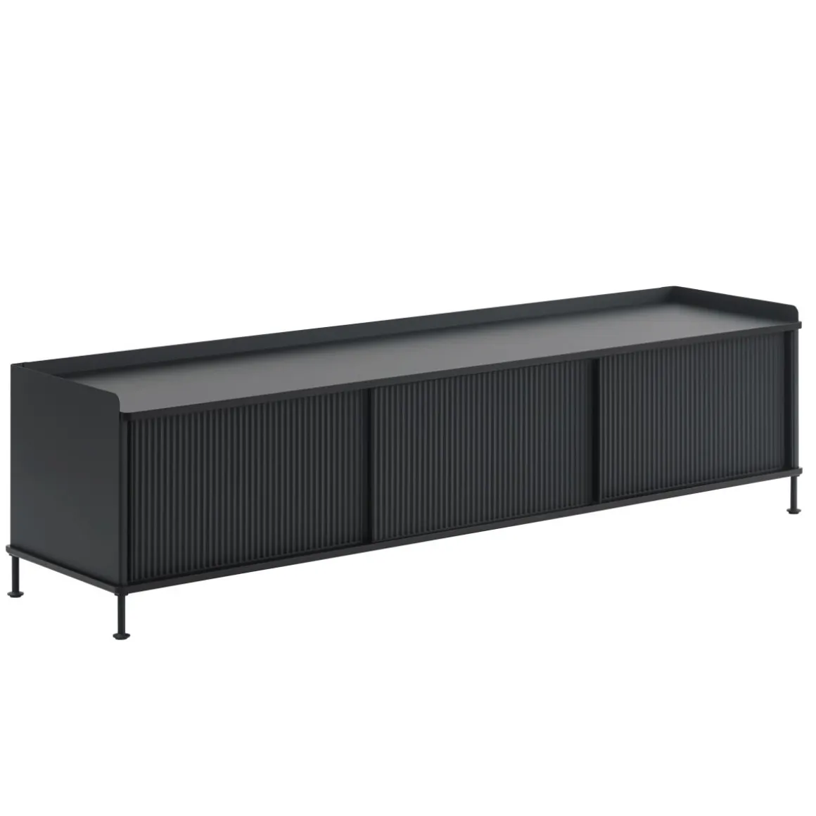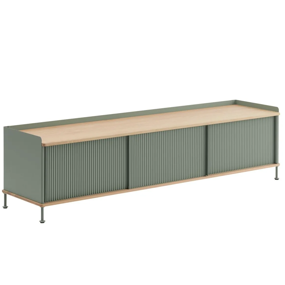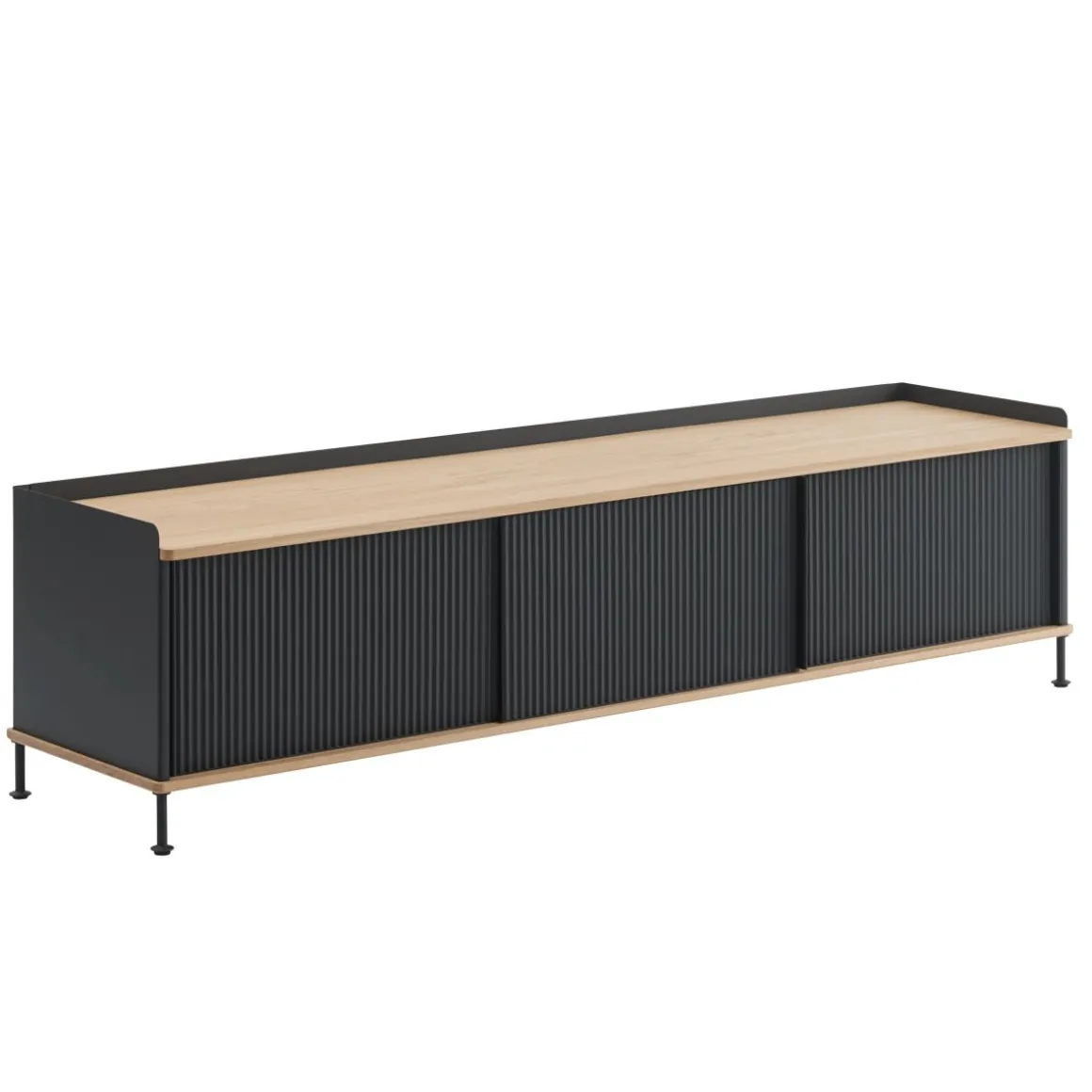 Le buffet Enfold combine la matérialité industrielle avec des références résidentielles pour une nouvelle perspective sur le stockage moderne. Fabriqué à partir d’un acier laqué qui enveloppe doucement son haut et son bas en chêne massif, le buffet Enfold fusionne des matériaux froids et chauds pour une expression unique, associée à l’expression vibrante et moderne de ses portes en acier striées. La conception flexible est disponible en quatre tailles, qui ont toutes des étagères réglables et des sorties de câble discrètes. Cela offre la possibilité de trouver la solution idéale pour votre espace, votre fonction et vos besoins – qu’il s’agisse d’une console multimédia, dans le couloir ou d’un buffet haut pour le rangement.