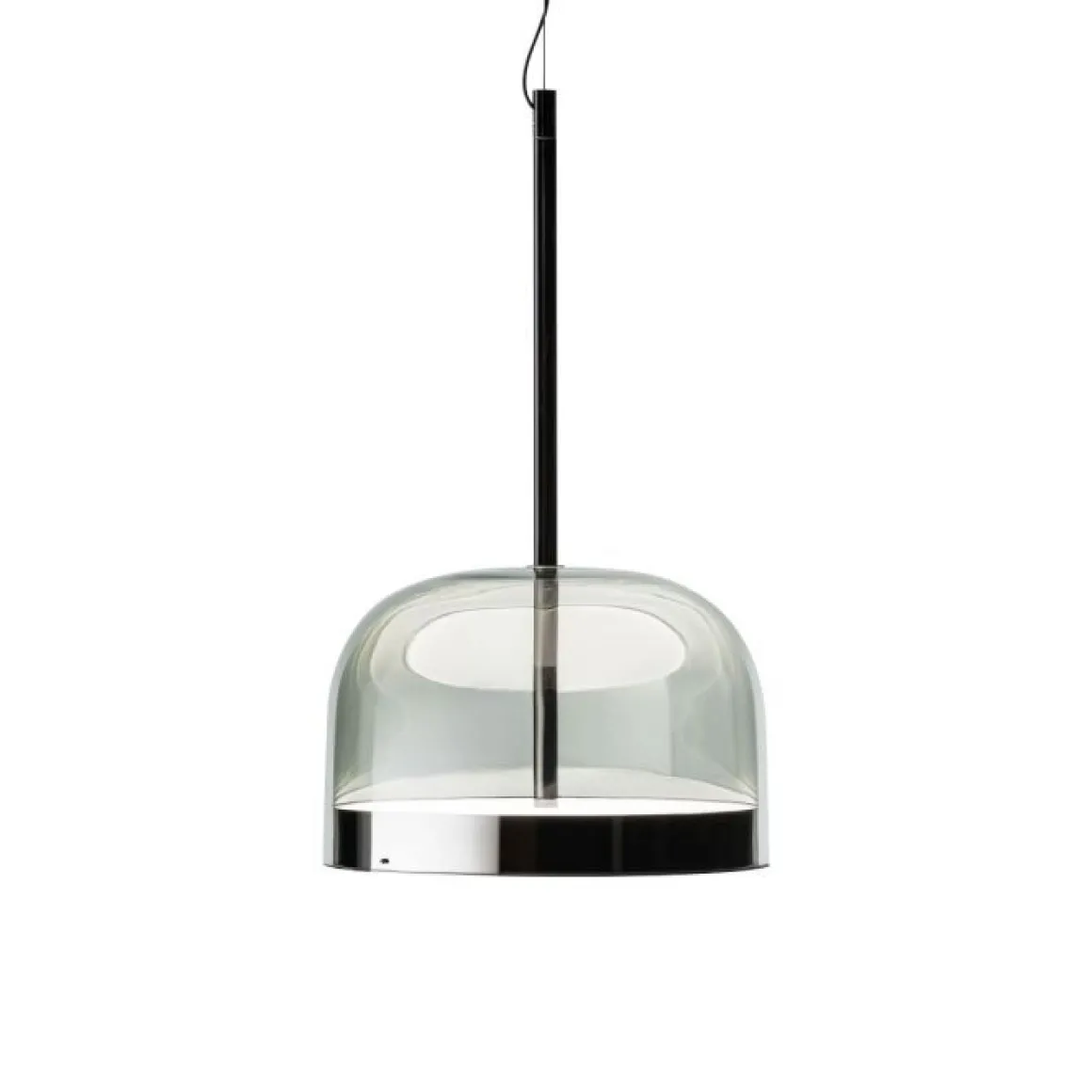 Equatore est la réinterprétation avec un goût contemporain des lampes classiques avec abat-jour en verre. Si, dans les abat-jour traditionnels, le diffuseur contient la sources lumineuse, dans cette famille de lampes, il est paradoxalement et suggestivement vide et l’effet lumineux est produit par deux disques lumineux situés à l’intéireur d’une bande métallique central, visible sur l’abat-jour est rappelant la ligne de l’Équateur. La lumière produite par les Led, grâce aux écrans intérieurs disposés en couches, se distribue régulièrement sur la surface des disques, en les faisant rayonner d’une lumière magique. Le disque inférieur produit une émission lumineuse vers le bas, tandis que le disque supérieur éclaire la calotte de verre, pour donner une diffusion douce de la lumière. Disponible en versions de table, de sol et à suspension, en deux mesures.