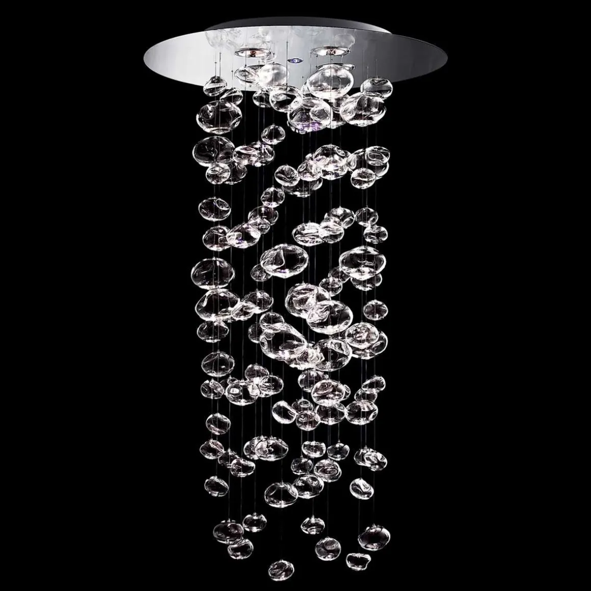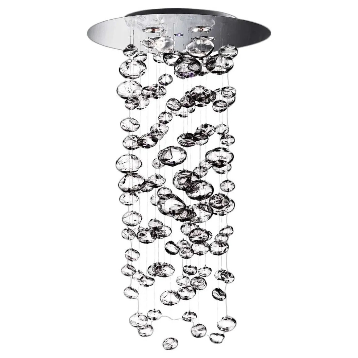 La suspension Ether 90 s designer par Patrick Jouin pour Muranodue représente une cascade de bulles en verre de Murano. Ces bulles sont illuminées depuis le haut au moyen de quatre spots et d’une LED multicolore en option, ce qui donne lieu à des effets de lumières particuliers. La structure métallique est en acier poli.
