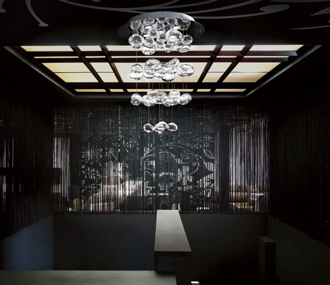 La suspension Ether designer par Patrick Jouin pour Muranodue représente une cascade de bulles en verre de Murano. Ces bulles sont illuminées depuis le haut au moyen de quatre spots et d’une LED multicolore en option, ce qui donne lieu à des effets de lumières particuliers. La structure métallique est en acier poli.