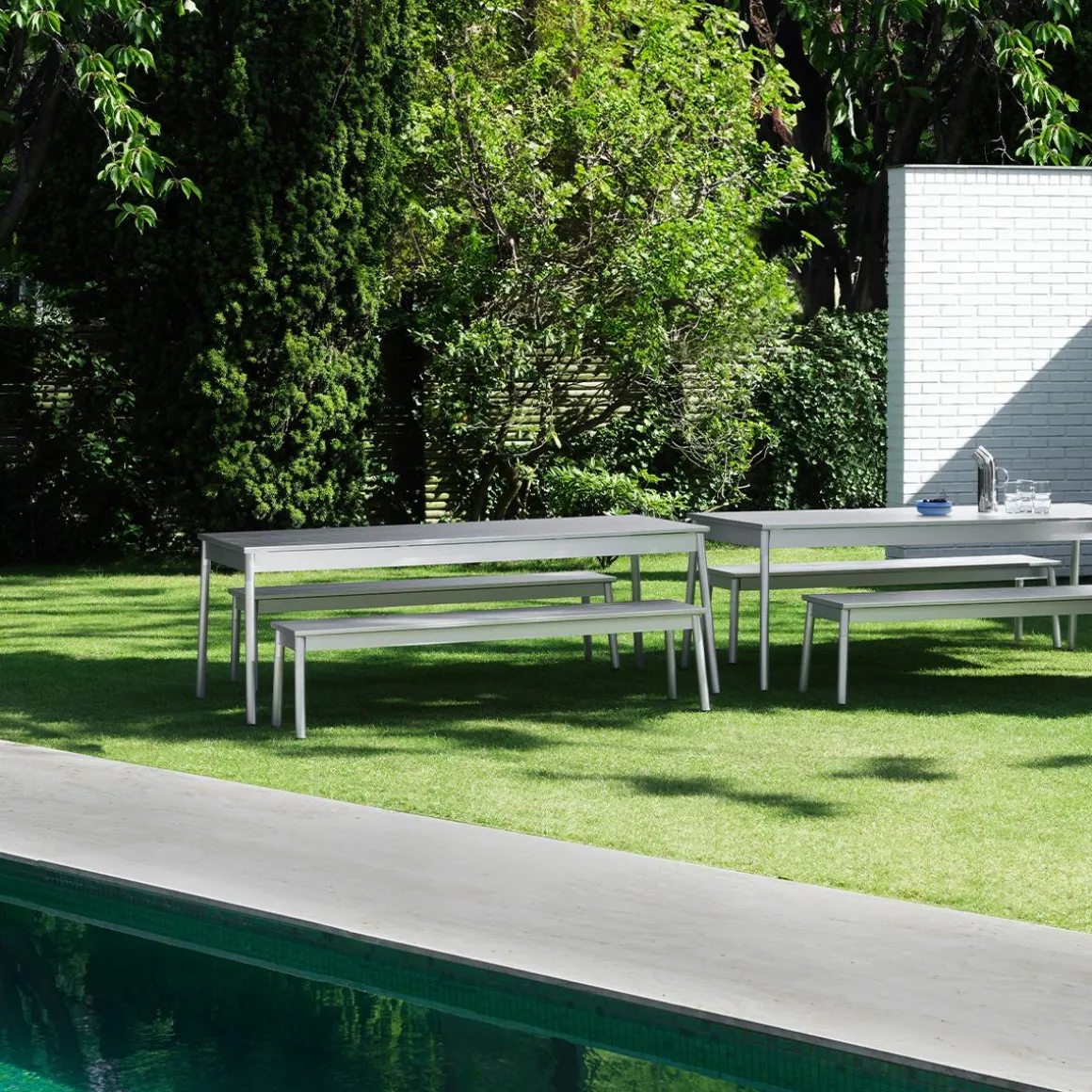 La table et le banc Ex sont fabriqués à partir de profilés en aluminium extrudé. La capacité unique de l’aluminium à être à la fois durable et léger en fait un matériau de choix pour les meubles d’extérieur, tandis que sa résistance naturelle à la corrosion et à la pourriture lui permet de résister aux conditions météorologiques tout en conservant sa beauté. Doté d’une construction élégante avec un plateau de table ou un siège en profilés d’aluminium placés avec un léger espace entre eux et soutenus par quatre pieds légèrement inclinés, Ex combine sans effort forme et fonction.