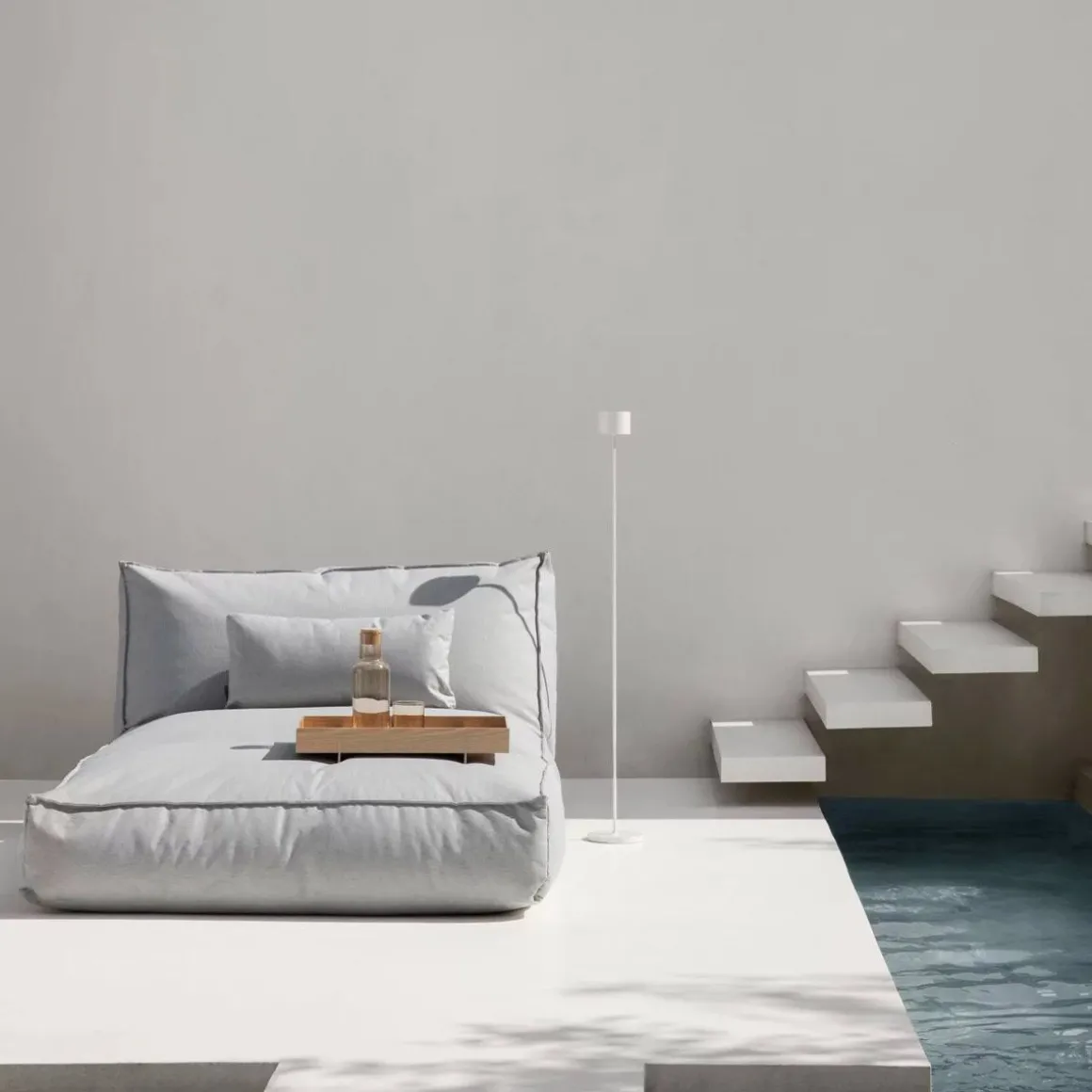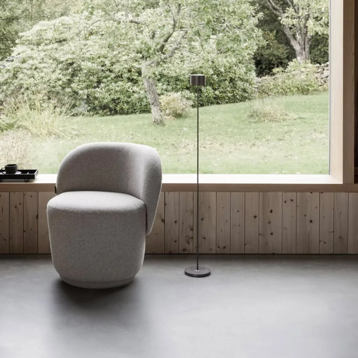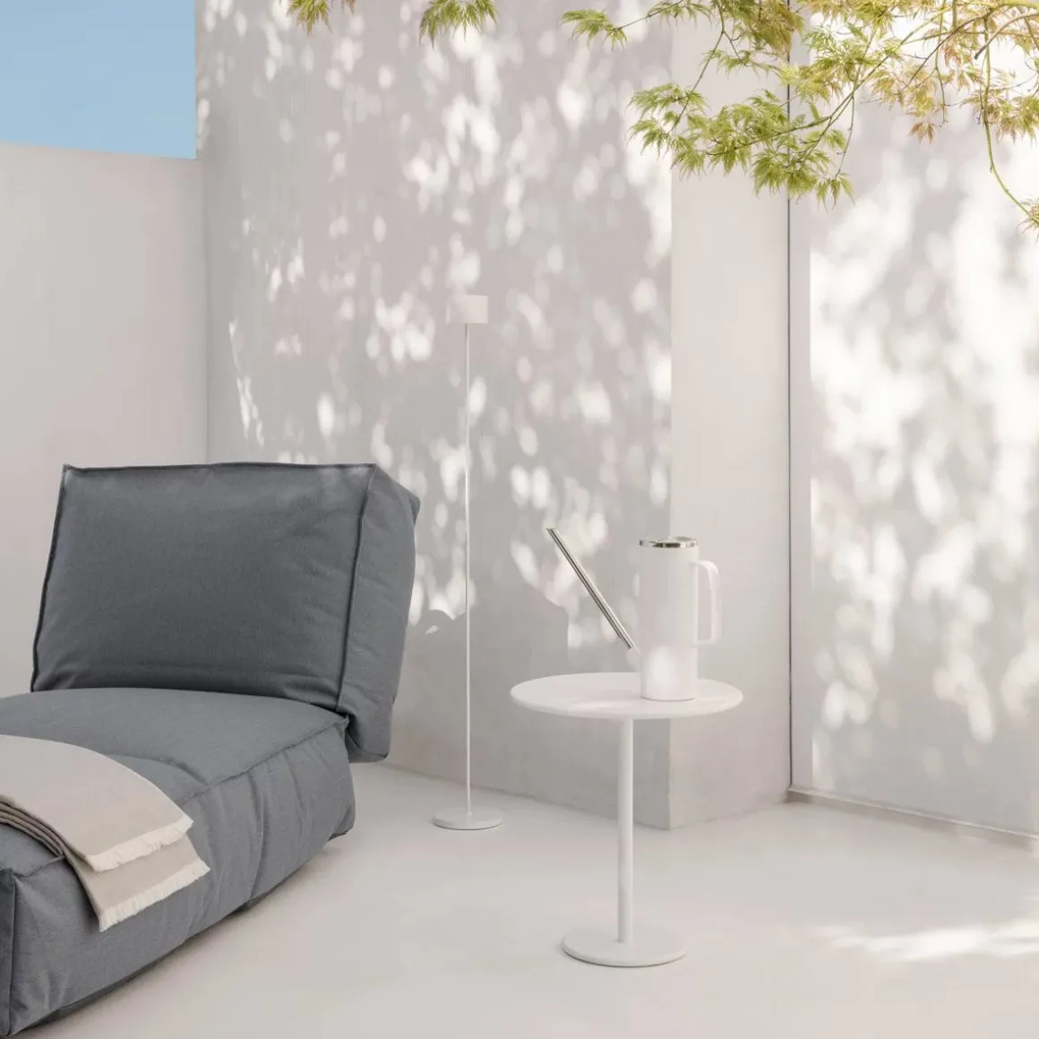 Farol de Blomus par Pierre Lienhart. Un effet puissant à l’intérieur comme à l’extérieur : le lampadaire LED mobile FAROL est élégant et crée une ambiance lumineuse romantique dans n’importe quel endroit. La batterie intégrée offre une grande flexibilité et permet d’utiliser le lampadaire aussi bien à l’intérieur qu’à l’extérieur, même en cas de forte pluie. Le lampadaire s’utilise en touchant brièvement le centre de l’abat-jour. Cela permet de contrôler trois niveaux de luminosité et l’interrupteur marche/arrêt, tandis qu’une fonction de variateur supplémentaire assure un éclairage agréable. La batterie se charge via une simple station de charge. La couleur de la lumière rouge ou verte indique le processus de charge.