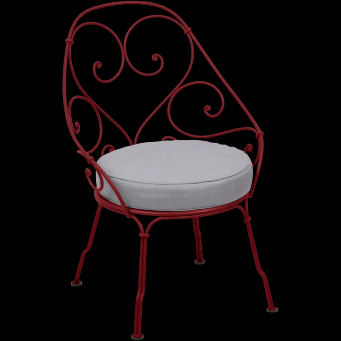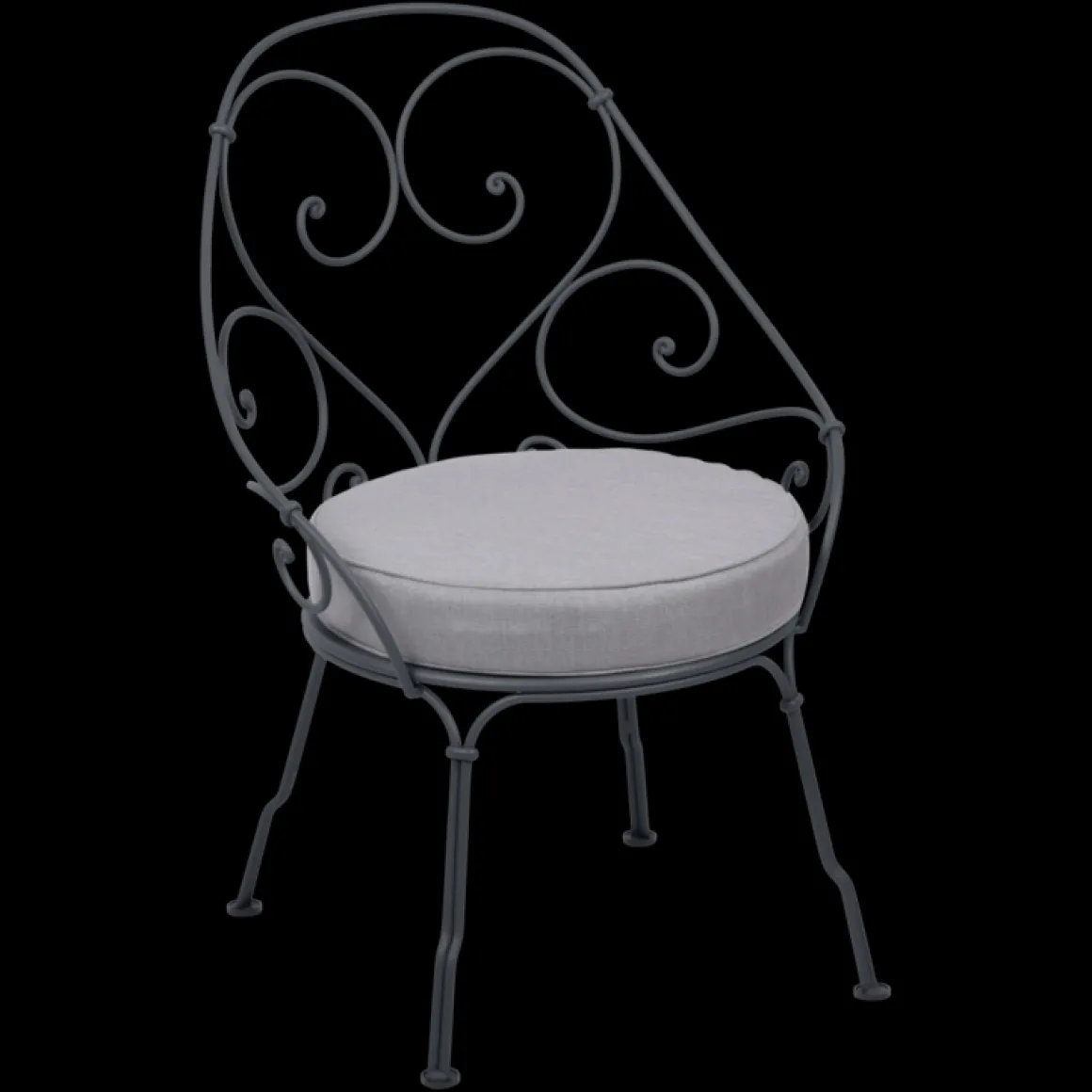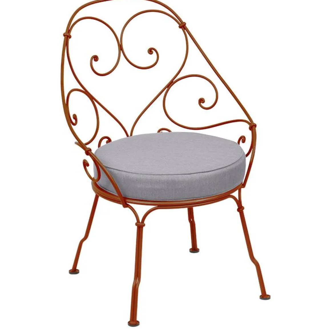 De style traditionnel avec ses élégantes volutes et bagues en métal forgées main, le fauteuil bas de jardin 1900 reflète tout le savoir-faire de Fermob sur le travail du métal et illustre une tradition très française de jardins romantiques. Charme et douceur sont apportés par ses lignes tout en rondeur tandis qu’un généreux coussin de 8 cm de hauteur, doux au toucher, ajoute un confort sans pareil à ce fauteuil en acier. Ce coussin 100% outdoor revêtu d’un tissu Sunbrella® a été étudié pour vivre en extérieur : grille anti-glisse, tissu déperlant, résistant au soleil, aux taches et à la moisissure… Les coloris Blanc grisé et gris flanelle se marient avec toutes les teintes du nuancier Fermob : en association avec des coloris neutres, ce fauteuil crapaud revisité évoque le charme du siècle dernier alors qu’en couleurs toniques, il joue sur le contraste entre romantisme et modernité. Au jardin à l’ombre d’un chêne, sur un balcon parisien, tout comme au salon, ce fauteuil en métal s’associe avec une table basse de jardin et l’ensemble de la collection 1900.