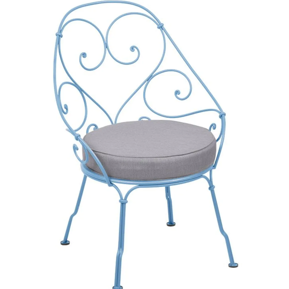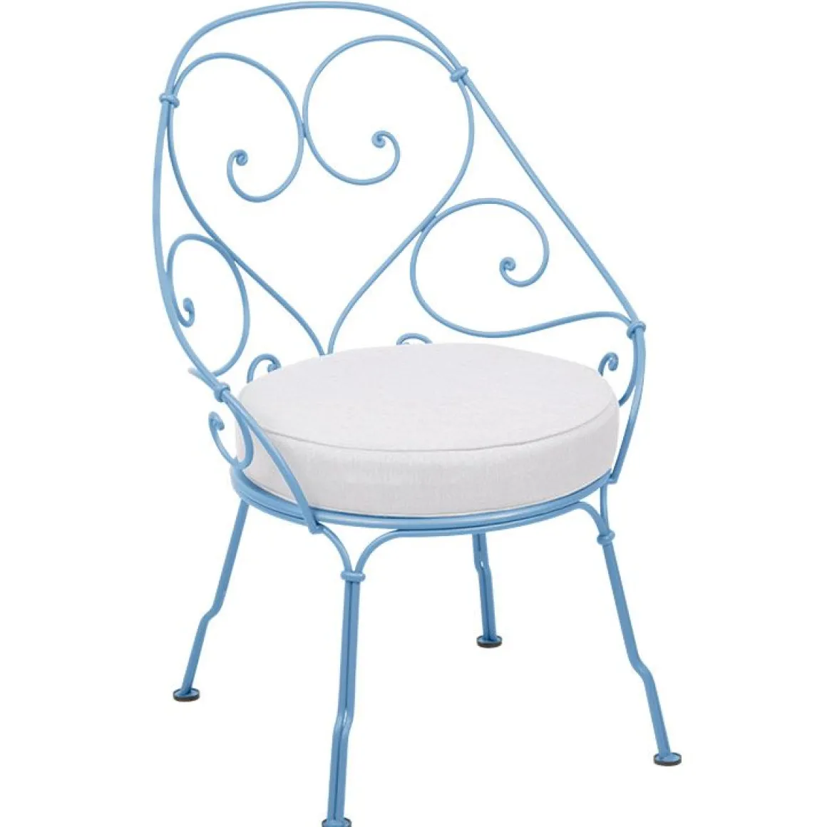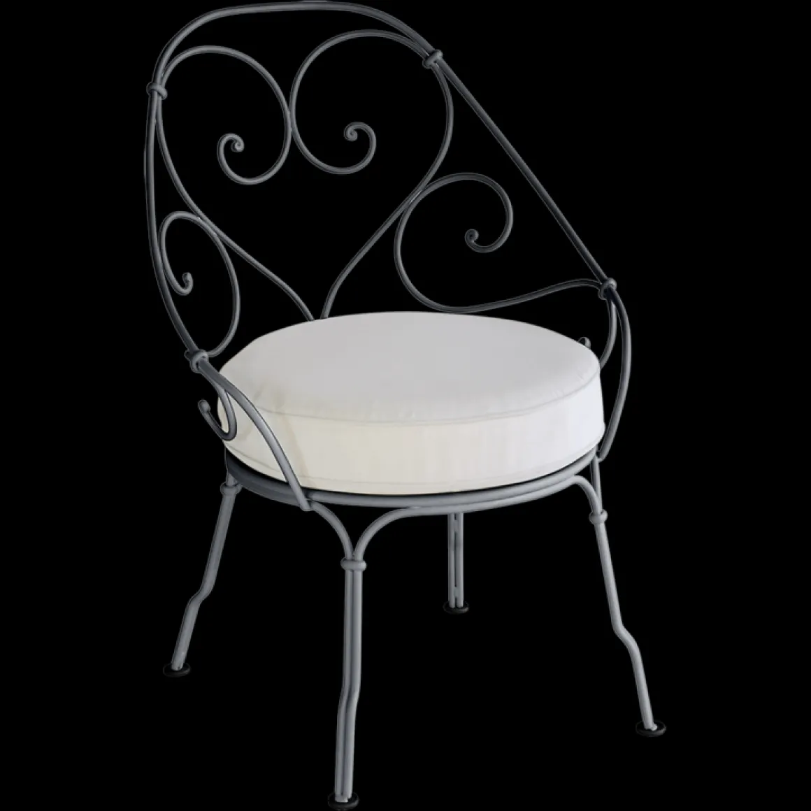 De style traditionnel avec ses élégantes volutes et bagues en métal forgées main, le fauteuil bas de jardin 1900 reflète tout le savoir-faire de Fermob sur le travail du métal et illustre une tradition très française de jardins romantiques. Charme et douceur sont apportés par ses lignes tout en rondeur tandis qu’un généreux coussin de 8 cm de hauteur, doux au toucher, ajoute un confort sans pareil à ce fauteuil en acier. Ce coussin 100% outdoor revêtu d’un tissu Sunbrella® a été étudié pour vivre en extérieur : grille anti-glisse, tissu déperlant, résistant au soleil, aux taches et à la moisissure… Les coloris Blanc grisé et gris flanelle se marient avec toutes les teintes du nuancier Fermob : en association avec des coloris neutres, ce fauteuil crapaud revisité évoque le charme du siècle dernier alors qu’en couleurs toniques, il joue sur le contraste entre romantisme et modernité. Au jardin à l’ombre d’un chêne, sur un balcon parisien, tout comme au salon, ce fauteuil en métal s’associe avec une table basse de jardin et l’ensemble de la collection 1900.