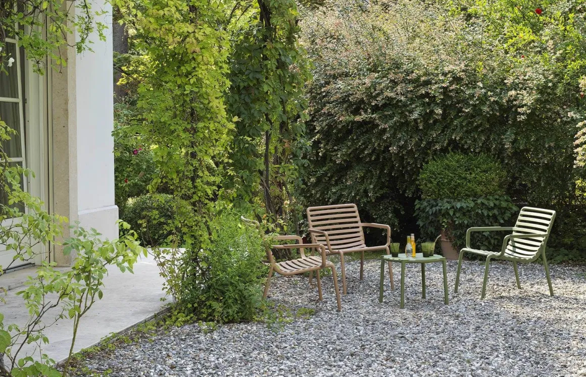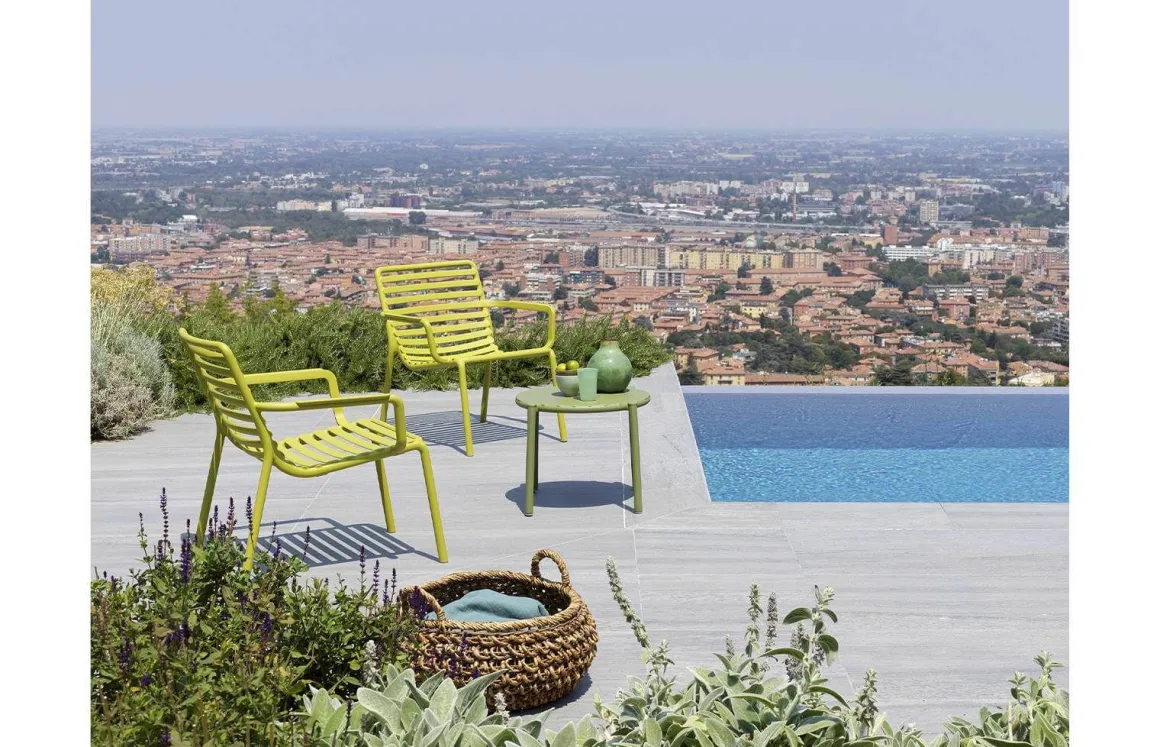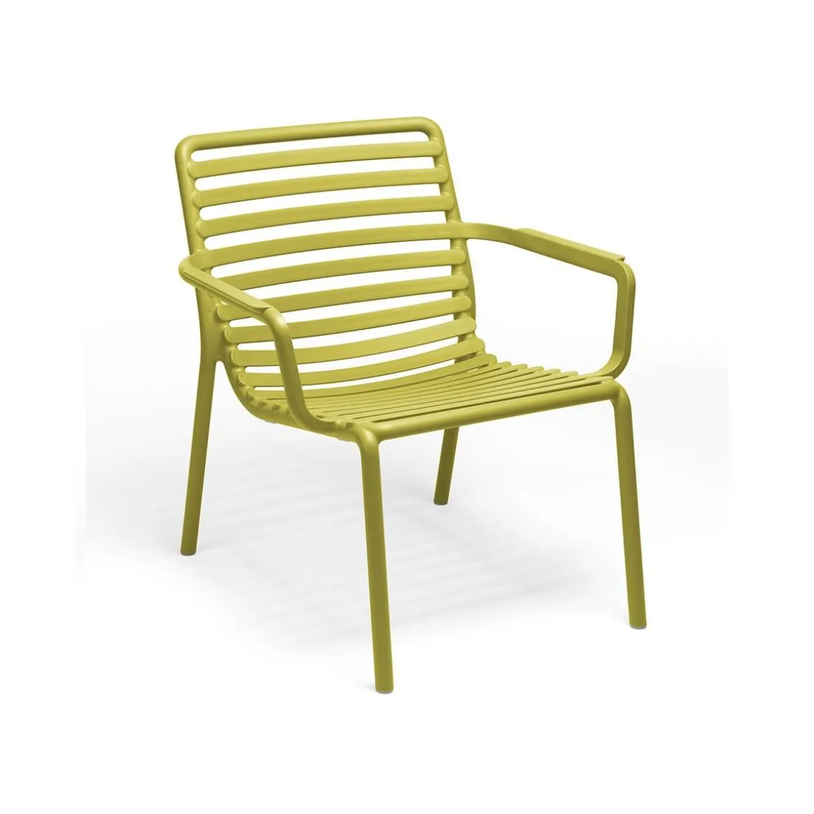 Fauteuil large de relaxation abaissé de plein air en résine de fibre de verre se distinguant par un jeu de pleins et de vides ponctués par une séquence de lattes horizontales. Empilable, facile à désinfecter et recyclable.