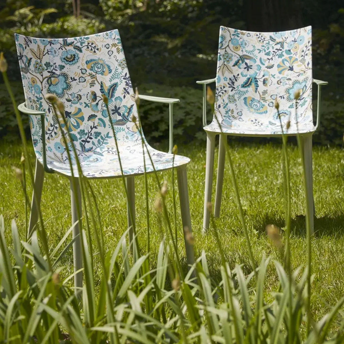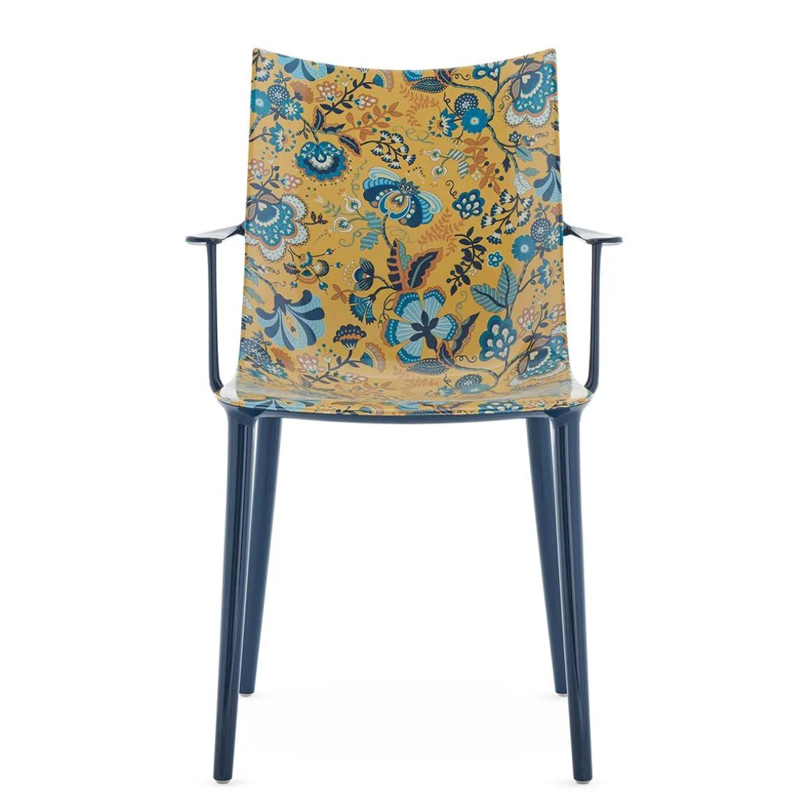 « Sa Majesté la chaise » incarne l’objet qui imprègne notre vie quotidienne, en racontant implicitement notre histoire. Philippe Starck nous emmène vers de nouveaux sommets avec la chaise H.H.H. – HER HIGHEST HIGHNESS. Avec une élégance et une puissance graphique inégalées, H.H.H. définit l’essence même de l’être humain qui interagit avec elle, l’obligeant à prendre position. En effet, que serions-nous sans l’action de s’asseoir, de « poser » devant un tel symbole de royauté et de raffinement ? Un objet qui va au-delà du simple concept de siège, en transformant chaque instant passé sur celui-ci en un véritable moment de royauté. L’assise a une finition ultra brillante également disponible dans les coloris blanc, noir, bordeaux, rouille, jaune moutarde, bleu, gris et vert. Fidèle à son rôle de pionnier dans la recherche de nouvelles formes d’innovation technologique, Kartell a également décidé de faire un pas de plus dans cette direction en expérimentant une nouvelle technique de graphic impression. Celle-ci permet d’obtenir quatre motifs floraux et géométriques aux couleurs variées au moyen d’une impression hautement technologique. Une variante ultra-moderne et alternative ornée des imprimés Liberty pour un style exclusif en harmonie totale avec l’esprit de Kartell.