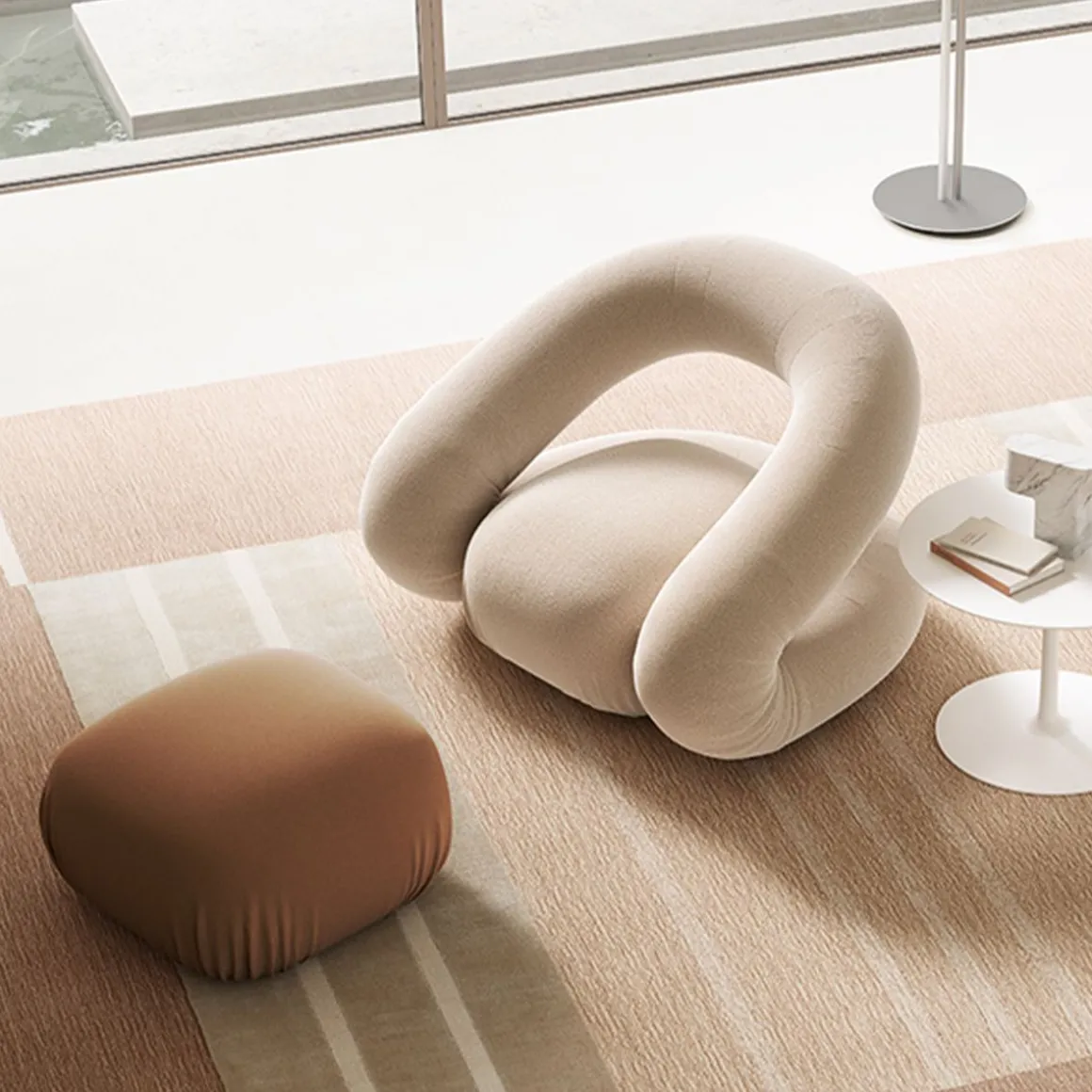 Le fauteuil Peggy interprète une tendance forte du marché : le goût du « soft home ». Avec son design tout en courbes et enveloppant, cette chaise véhicule un sentiment de sécurité, de protection et de confort, tout en s’éloignant de son contexte historique pour devenir une pièce iconique définie par ses contours purs. « Peggy est un fauteuil que nous pensons connaître », commente Gio Tirotto, « mais que nous n’avons jamais rencontré. » Fabriqué en tube d’acier et en mousse recyclée, il se compose de seulement deux parties : une base-dossier et une assise, maintenues ensemble par un système de fixation qui facilite son démontage. Grâce à ces éléments, le dossier le rend à la fois léger et dynamique, tout en courbes et confortable.
