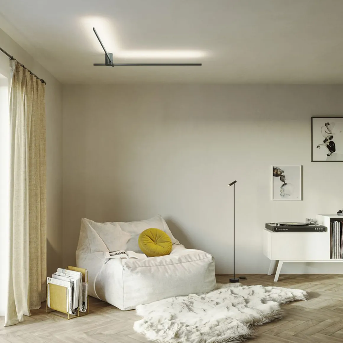 Plafonnier et luminaire mural indirect avec base cylindrique et deux baguettes lumineuses fines ; baguette inférieure pivotant jusuq’à 180°.