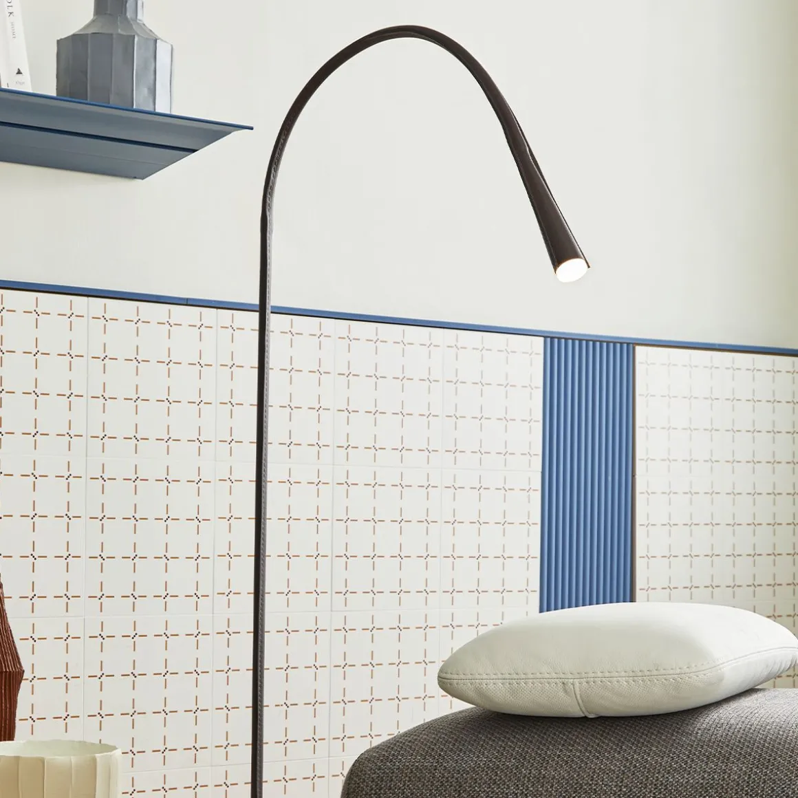 Modèle iconique de Contardi, Flexiled est disponible en version acier et cuir. Dans le modèle en métal, le bras flexible est recouvert d’un treillis d’acier tissé, puis enveloppé dans une gaine transparente. Cette dernière version est insérée dans un fourreau en cuir avec double couture sur les côtés. Flexiled se caractérise par des standards de qualité élevés, à commencer par l’utilisation d’un bras flexible en laiton (diamètre 12 mm), qui garantit la solidité et évite les grincements, même après une utilisation prolongée. L’ingénierie avancée et l’efficacité de la LED garantissent que la température sur la tête de la lampe reste dans les limites correctes, même après 24 heures d’utilisation ininterrompue. Flexiled est facilement « personnalisable » avec un choix de couleurs de cuir, de longueur et de forme de bras et de finition de la plaque murale.