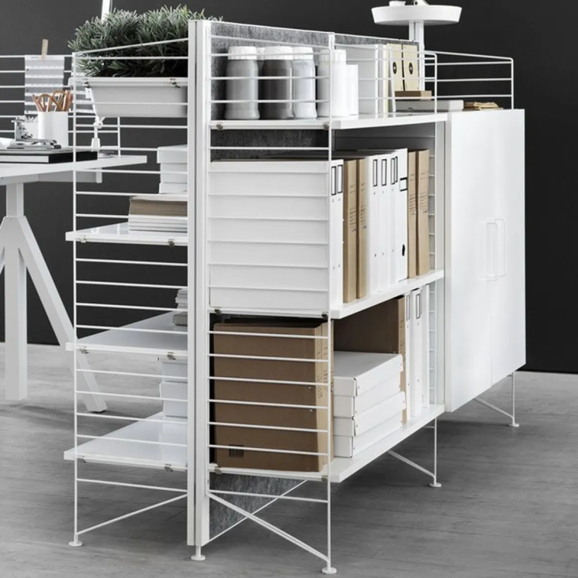 Les panneaux de sol sont disponibles en trois hauteurs, 85 cm, 115 cm, 200 cm et une profondeur de 30 cm. Les panneaux sont la base lors de la construction de votre étagère à cordes. Lorsque les panneaux sont choisis, vous pouvez commencer à ajouter des produits de 30 cm de profondeur de String® System. Choisissez parmi des étagères, des armoires, des tiroirs, des étagères à magazines et plus encore. Le pied du panneau de sol repose contre le sol, ce qui rend l’étagère stable tout en paraissant légère et aérée. Rendez votre étagère encore plus fonctionnelle et unique en ajoutant des organisateurs, un porte-couteau ou un porte-revues, qui sont tous placés sur les fils du panneau. Les panneaux sont disponibles dans deux emballages différents, soit avec un panneau de sol, soit avec deux panneaux de sol.