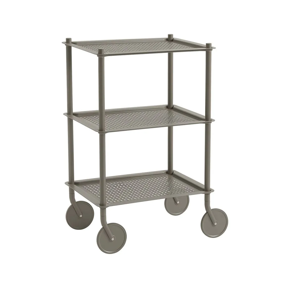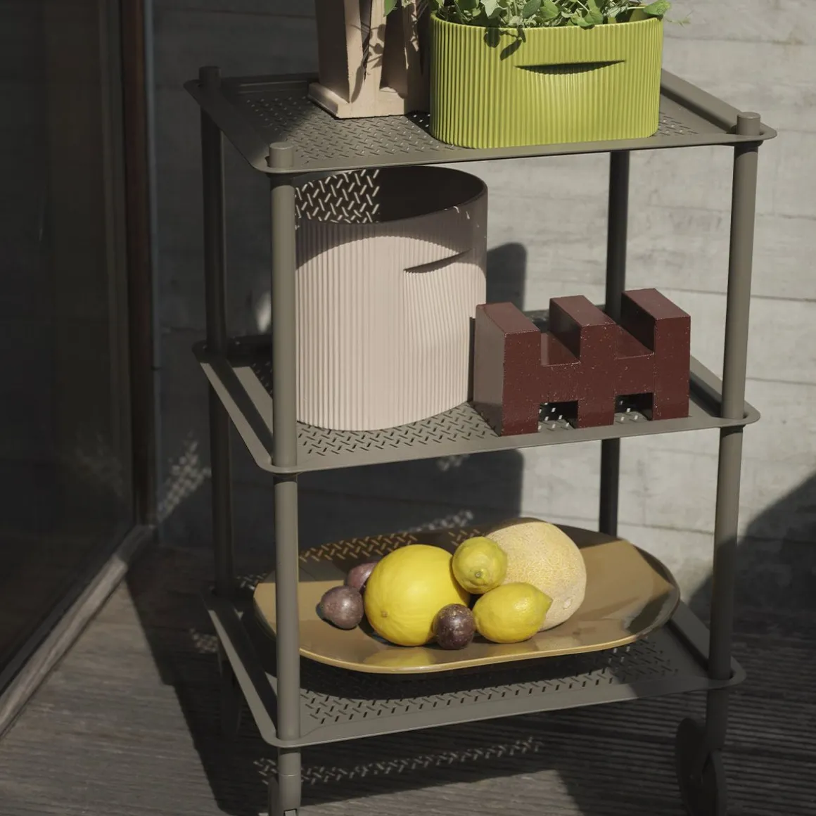 Flow trolley de Muuto par Normal Studio. Le Flow Trolley introduit la notion de design fonctionnel dans un contexte moderne grâce à ses plateaux rainurés en métal gaufré pour une expression contemporaine, associés à la flexibilité de ses roulettes qui lui permettent de se déplacer d’une pièce à l’autre. Conçu dans un look monochrome, le Flow Trolley ajoute un rangement moderne à n’importe quel espace de la maison, du lieu de travail ou de l’hôtellerie. Disponible dans une finition taupe adaptée à une utilisation extérieure.