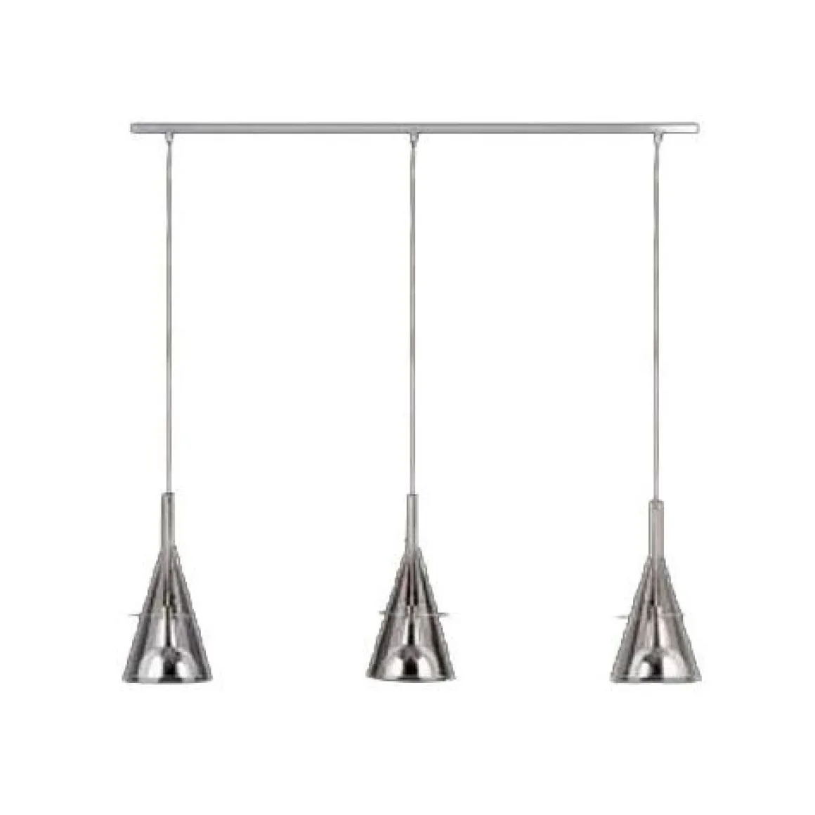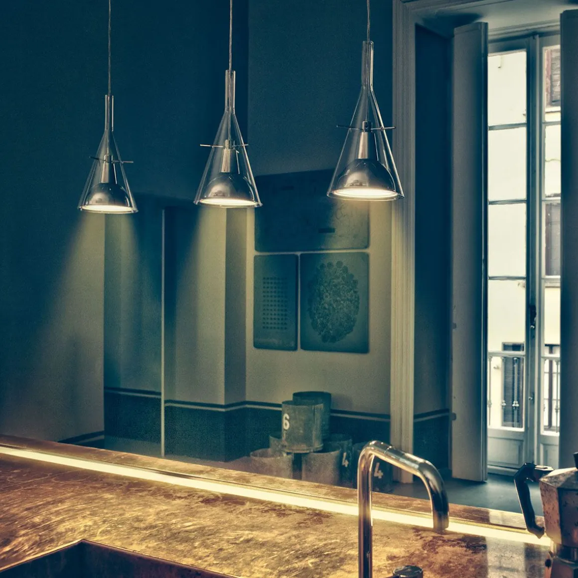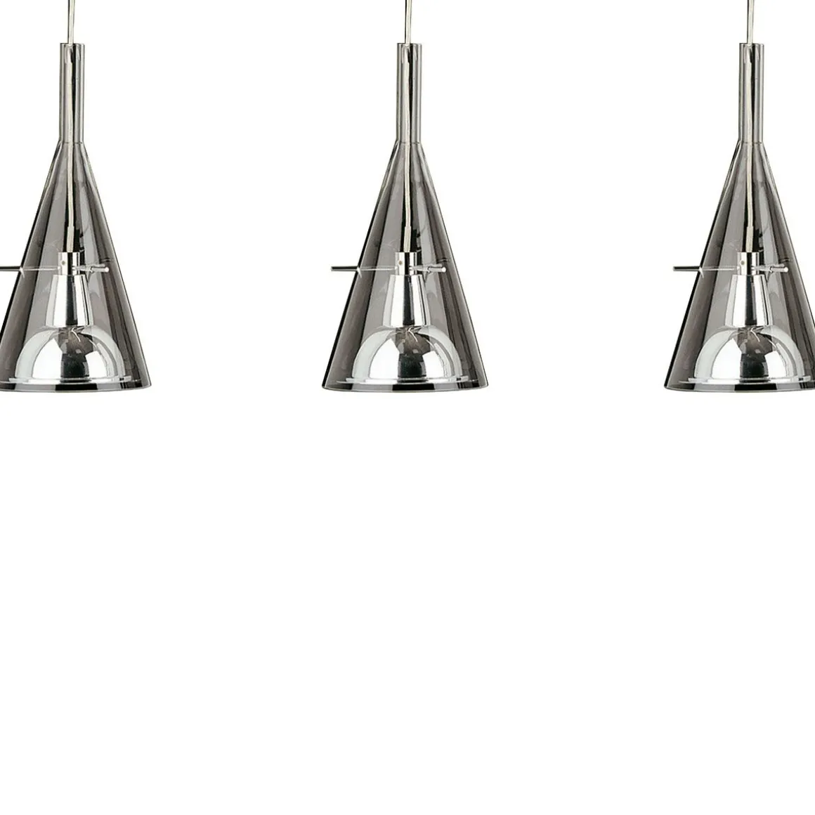 Flûte 3 est tirée de la collection Flûte dessinée par Franco Raggi pour Fontana Arte. La suspension caractérise par le contraste de ses matériaux : la douceur et la transparence du verre s’opposent à la force de l’aluminium chromé. Le cône de verre accueille en son interne le réflecteur, soutenu par trois bras chromés. La lumière se reflète à l’intérieur du cône et se diffuse de manière uniforme vers le haut.
