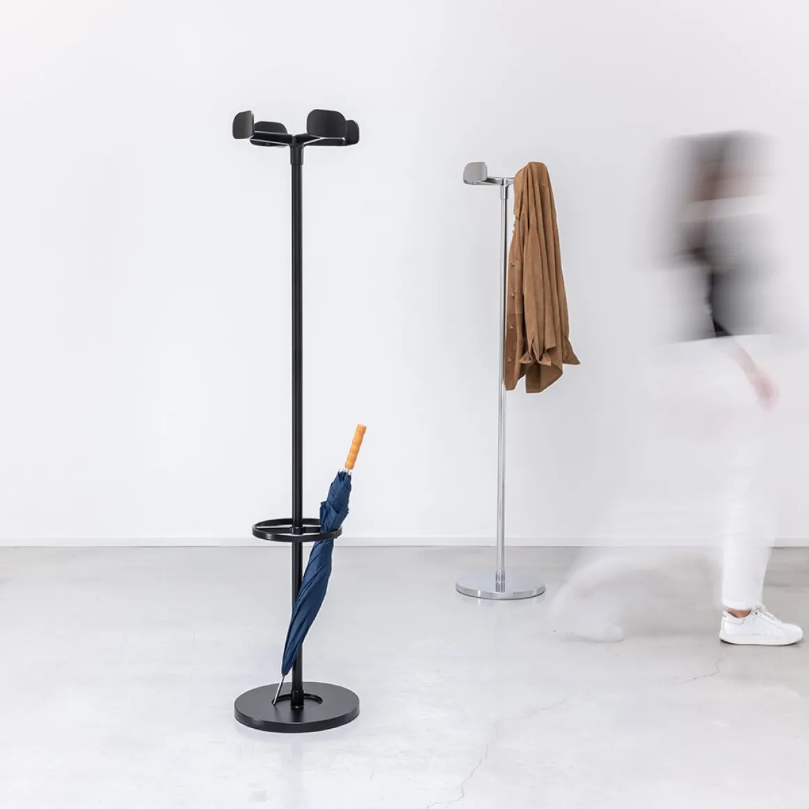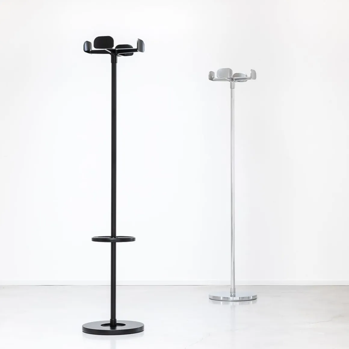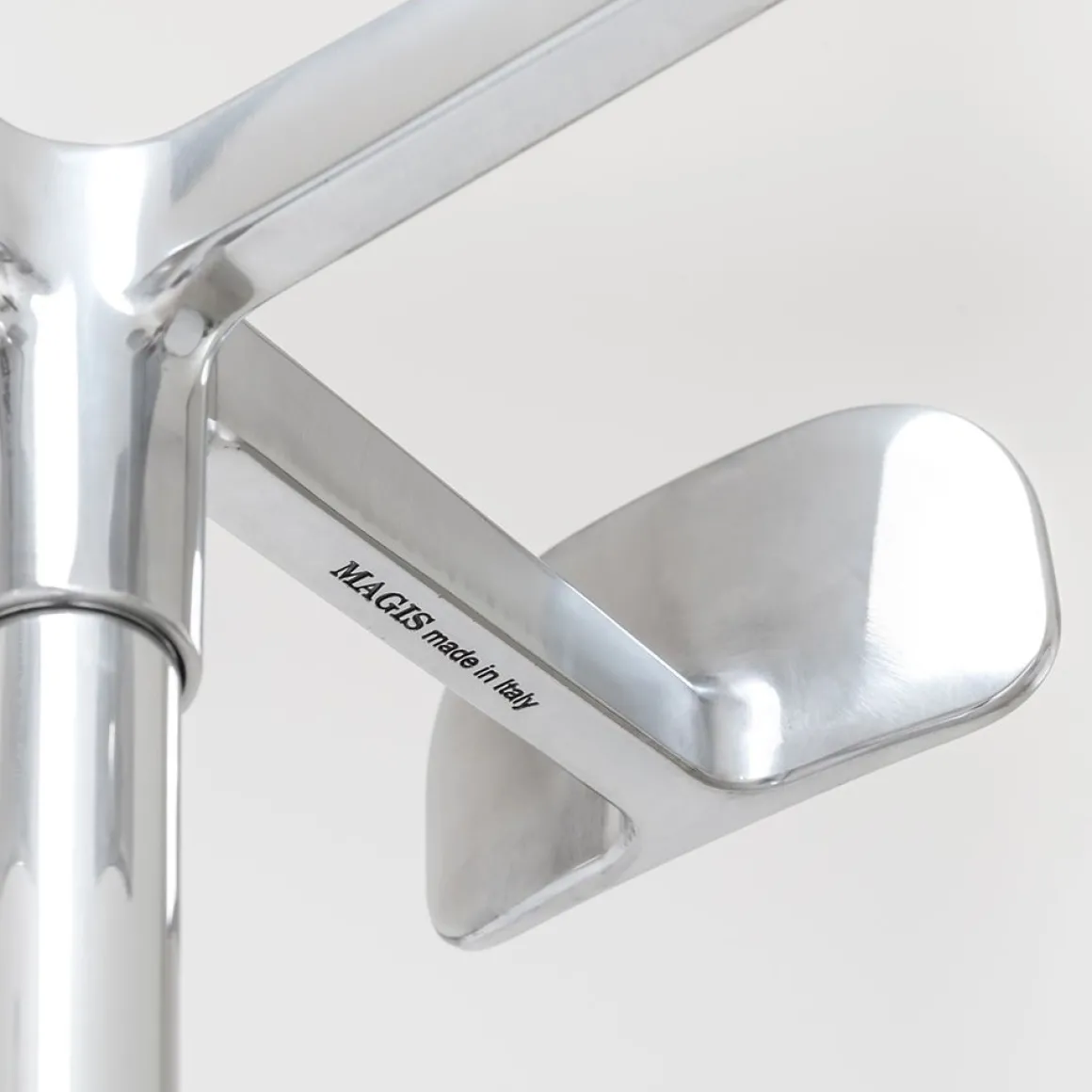 Porte manteaux Four Leaves de Magis, disponible aussi avec porte-parapluie. « Four Leaves est un produit intelligent qui s’adapte bien à n’importe quel environnement, tant public que domestique. Un portemanteaux doit sembler fantastique qu’il soit couvert de vêtements ou pas et c’est avec cette idée en tête que nous avons évité aussi bien le fonctionnalisme que la fantaisie. Le projet a abouti après des centaines d’esquisses et de prototypes, quand nous avons trouvé une forme si simple qu’elle semblait être le résultat d’une évolution plutôt que d’un dessin. Les « feuilles » soutiennent parfaitement les manteaux et les bras servent de tringles pour les cintres. La base, les patères et l’anneau porteparapluies en option sont en fonte d’aluminium, tandis que la tige est en aluminium extrudé de manière à donner à toute la pièce une finition brillante naturelle. » Edward Barber & Jay Osgerby