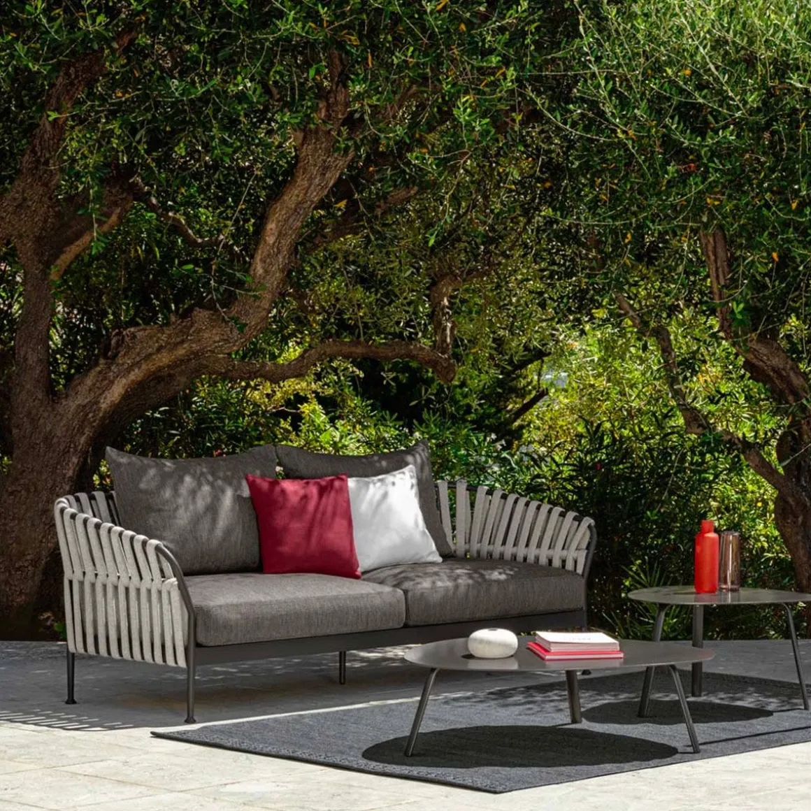 Les formes sinueuses et voluptueuses typiques de la collection Frame s’expriment pleinement dans le canapé 2 places: élément incontournable pour créer son extérieur précieux et élégant. Le tressage de la corde rembourrée sur la structure extérieure caractérise le produit et crée un fascinant jeu de lumières quand le soleil y pénètre. L’assise confortable et accueillante propose un volume solide et sculptural qui s’harmonise parfaitement à celui, moelleux et enveloppant, du dossier. Les matériaux, résistants aux intempéries, de la structure et des revêtements et le rembourrage en mousse quick dry foam en font un complément d’ameublement parfait pour valoriser le living d’extérieur.