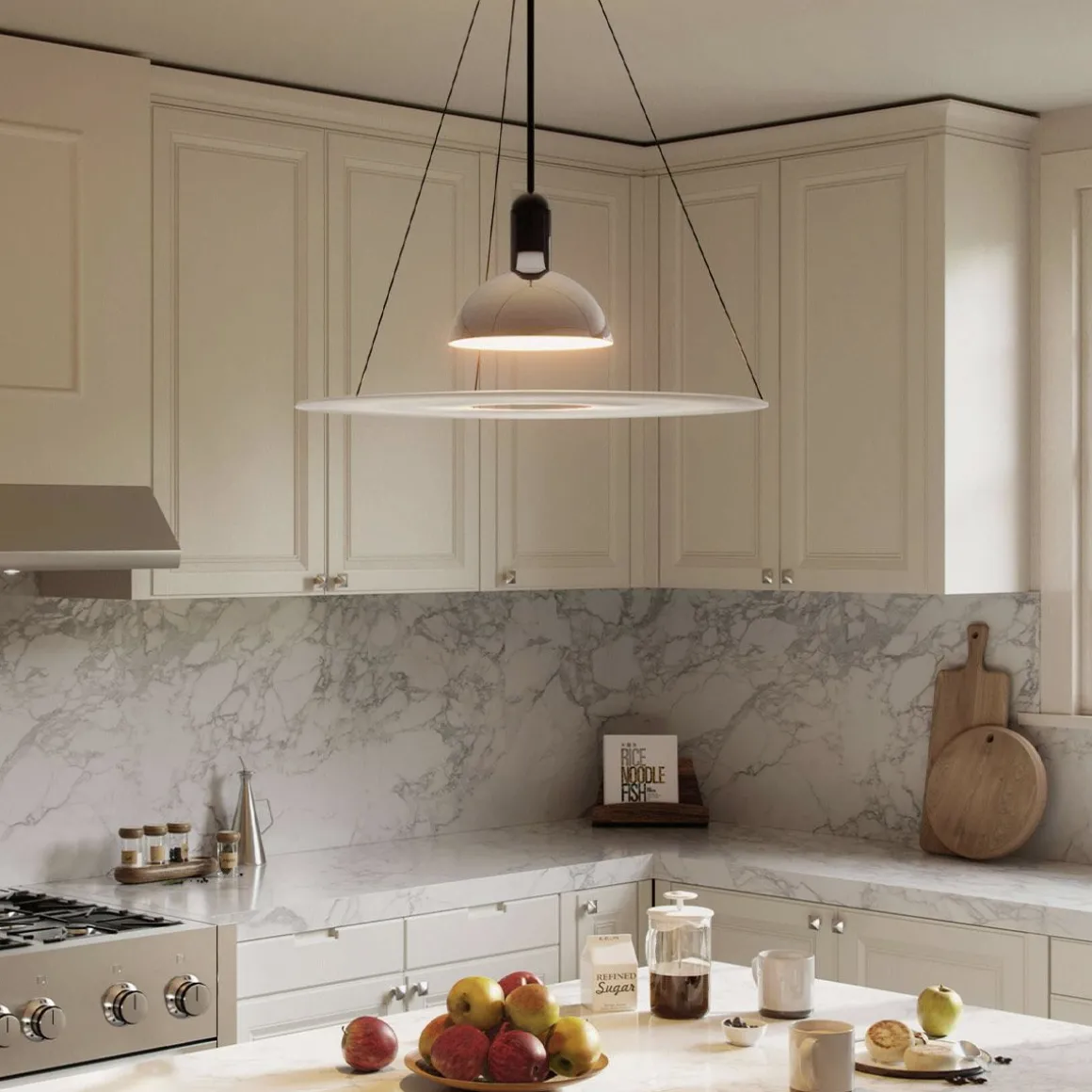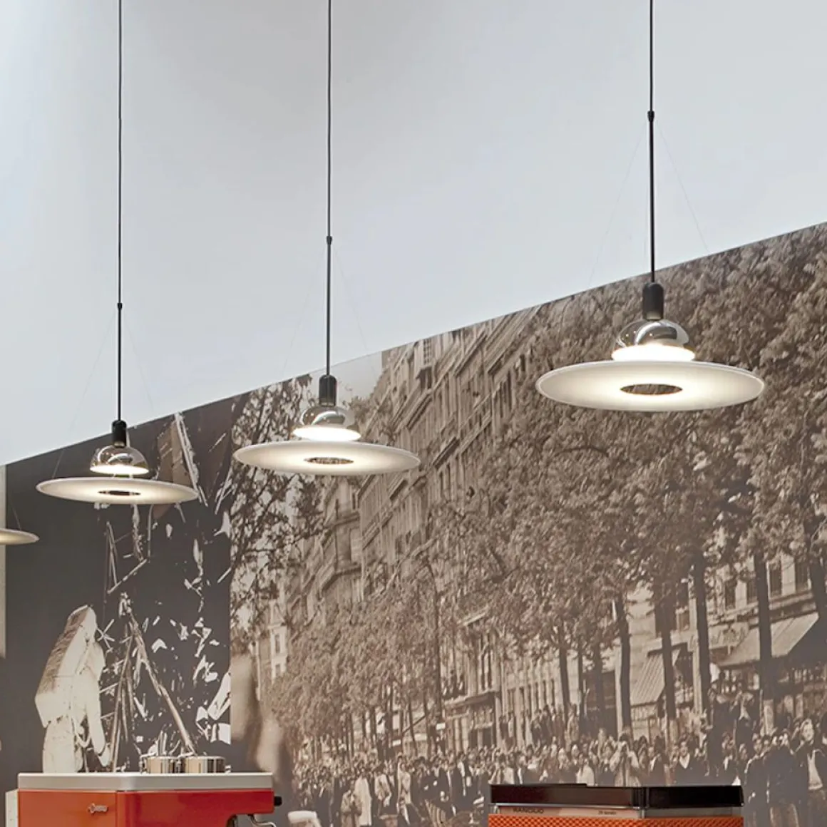 Frisbi est une suspension dessinée par Achille Castiglioni pour Flos. Cette suspension est à lumière directe, diffuse et réfléchie. Son diffuseur plat est suspendu au corps de l’appareil par trois fils en acier harmonique. Son réflecteur en tôle moulée, polie et nickelée lui donne une touche industrielle chic !