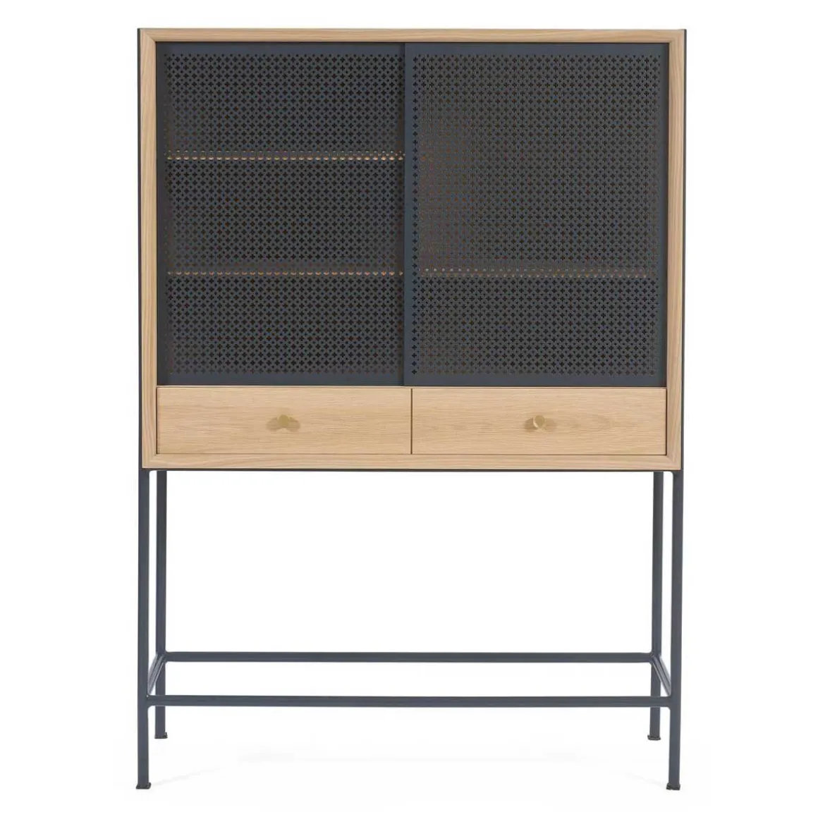 Matériaux : Corps et tiroir en MDF plaqué chêne naturel, poignées laiton brossé, Portes coulissantes en métal perforé laquées mates, Pieds laqués gris ardoise.