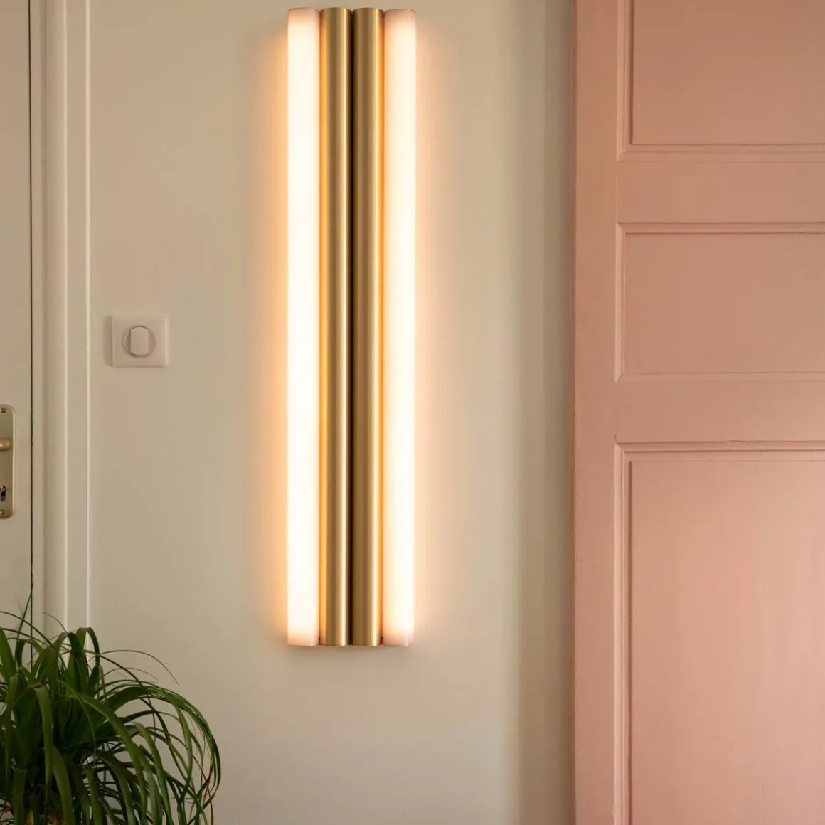 Gamma XL de CVL. GAMMA est un système graphique et versatile. C’est à partir de tubes métalliques et de cylindres blancs opalins, multipliés, que s’agence ainsi toute une gamme de luminaires. Sylvain Willenz, avait imaginé le concept GAMMA comme celui d’une forme de liberté dans son design et sa taille, envisageant un concept modulable. C’est ainsi qu’est née l’applique GAMMA XL.