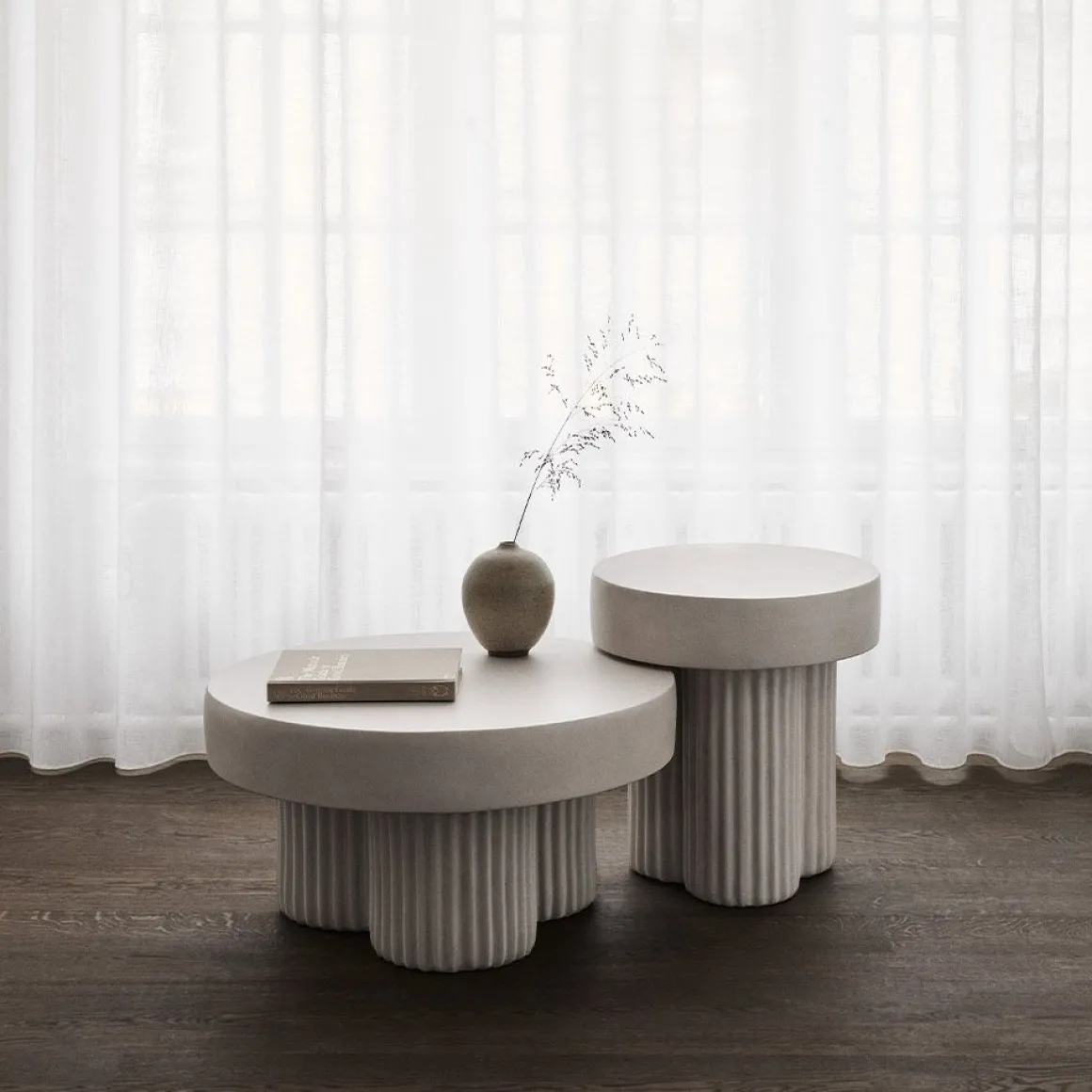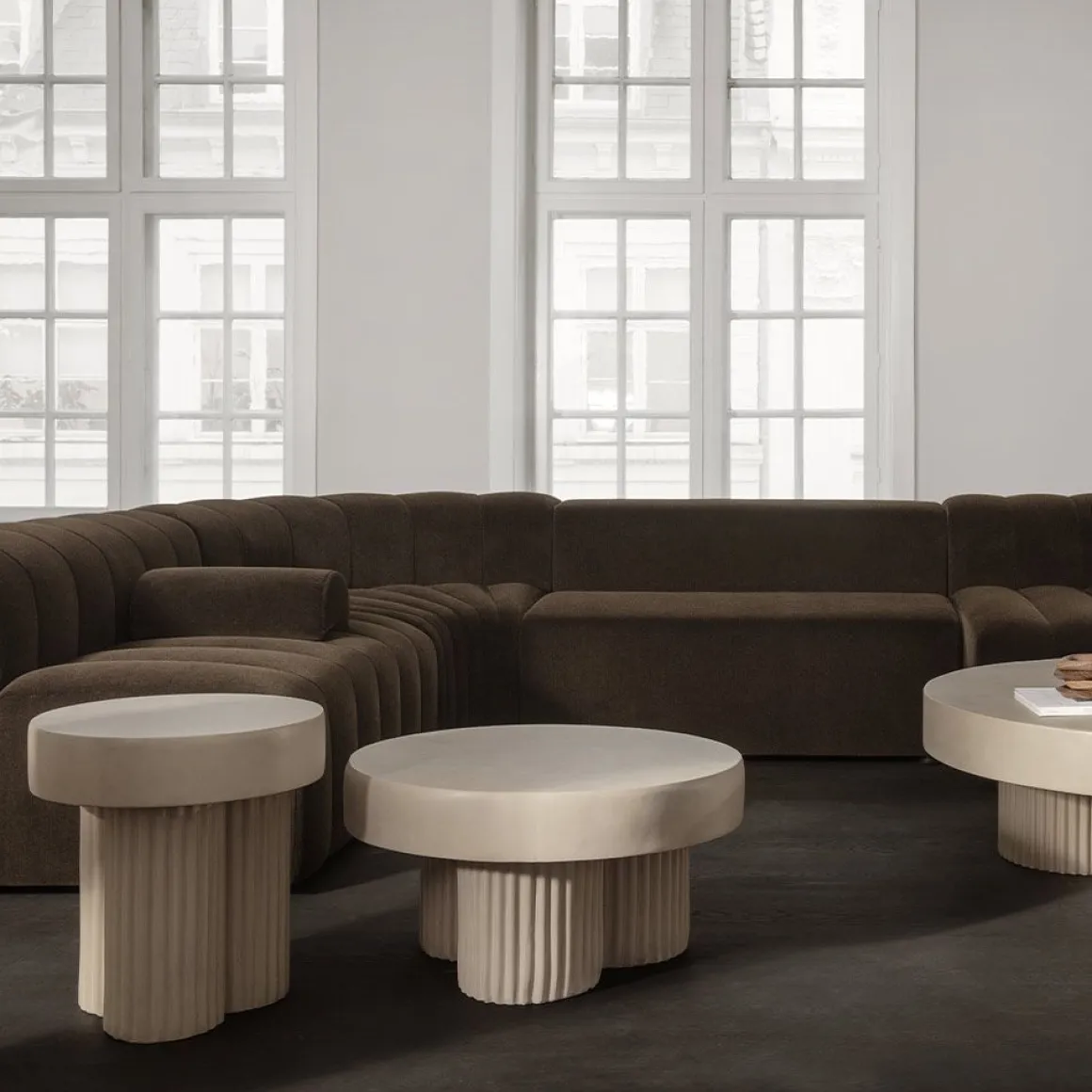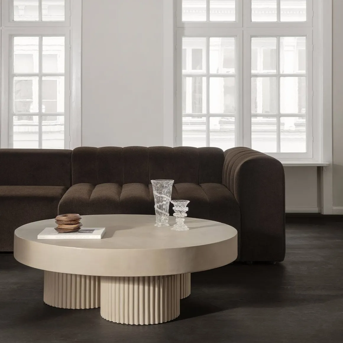 La table Gear, avec ses piliers robustes et son plateau épais, se dresse presque comme une modeste sculpture brutaliste. Gear s’inspire du mouvement architectural brutaliste des années 1950, caractérisé par ses formes géométriques et ses surfaces en béton brut. La série réinvente l’architecture brutaliste en meubles, mais vise à adoucir son expression dure, autrement perçue. Par exemple, les rainures dans les pieds de la table créent des effets d’ombre en fonction de l’éclairage qui les frappe, ajoutant ainsi un élément dynamique. Les équipements sont fabriqués à partir de béton brut comme matériau principal, tout comme les bâtiments brutalistes l’étaient il y a des décennies. Cependant, pour adoucir l’expression dure du matériau, le béton a été coloré pour ajouter des nuances et insuffler de la tactilité au design. La table Gear est fabriquée à la main selon un processus de fabrication en 9 étapes, mettant en valeur la précision d’un savoir-faire artisanal. Lors des dernières étapes, chaque table est peinte à la main, ce qui en fait une pièce unique dont l’expression varie. Les couleurs, dont Chalk et Earth, présentent un blanc crayeux et une nuance café, donnant au béton une teinte rougeâtre chaude. Ces nuances plus chaudes tempèrent l’expression, facilitant l’association avec des matériaux plus doux comme le bois et les tissus d’ameublement.