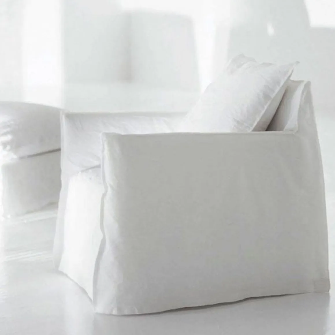 Ghost 05 de Gervasoni par Paola Navone. Fauteuil, structure en multiplias et bois massif, avec sangles élastiques. Rembourrage en mousse polyuréthane à densité différenciée, déhoussable.