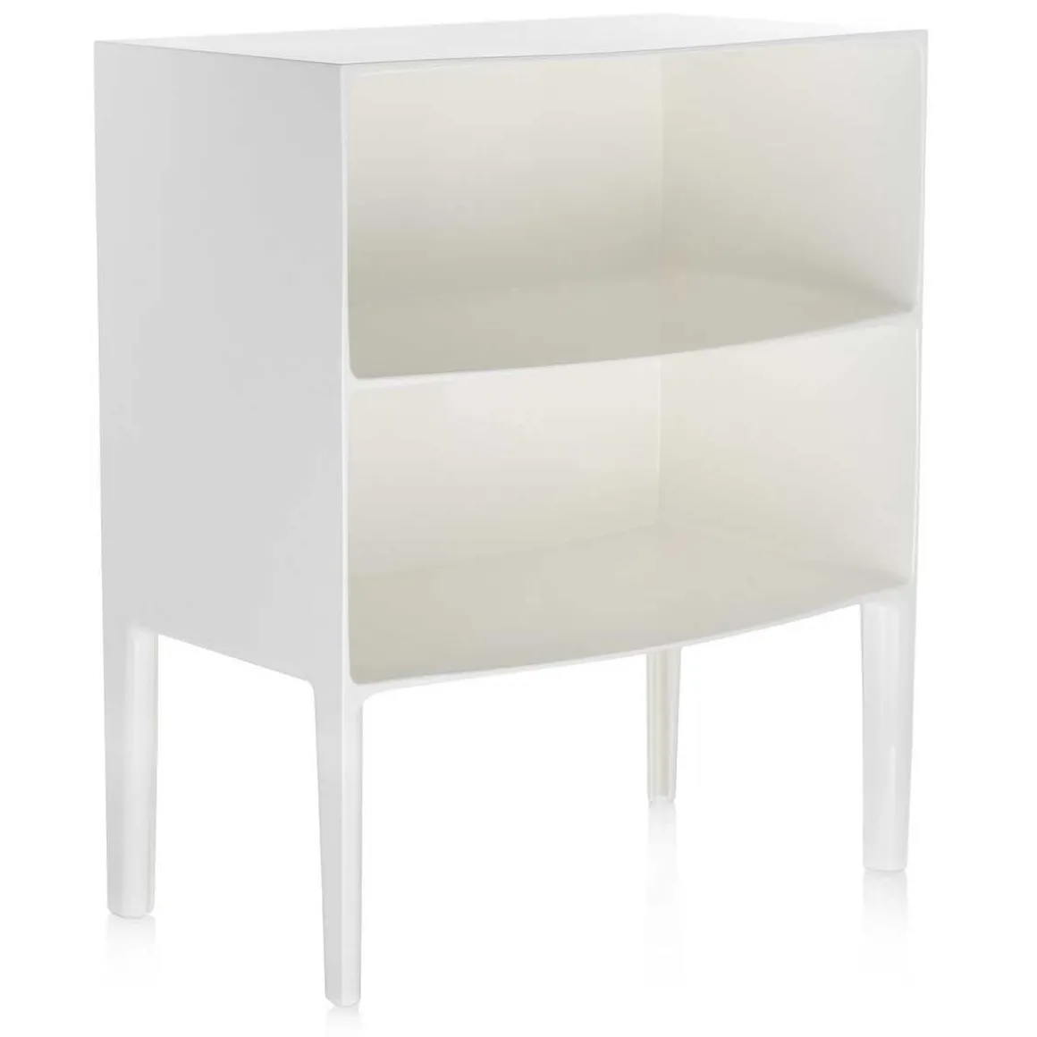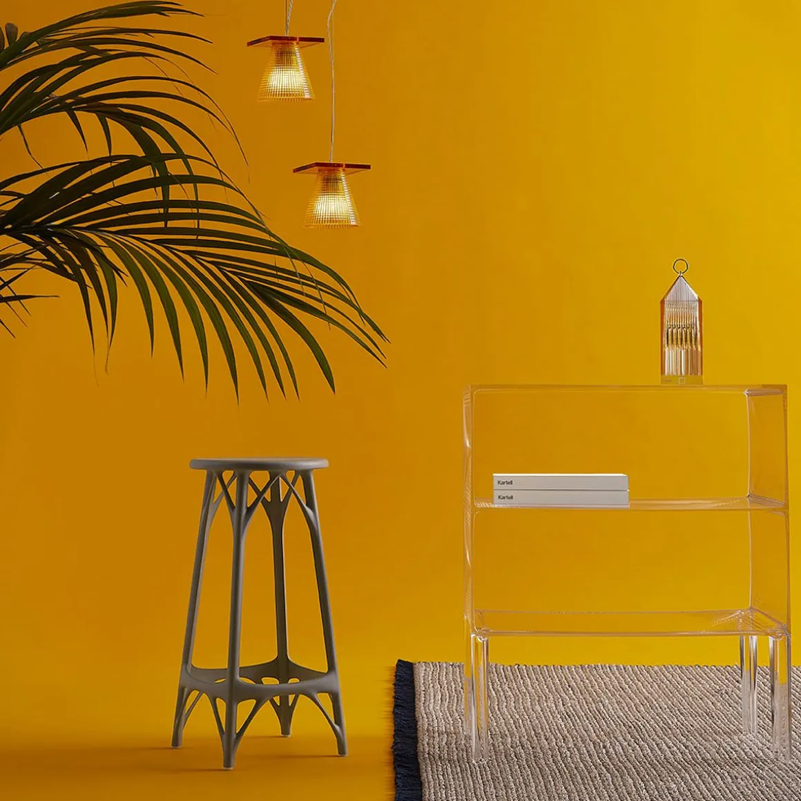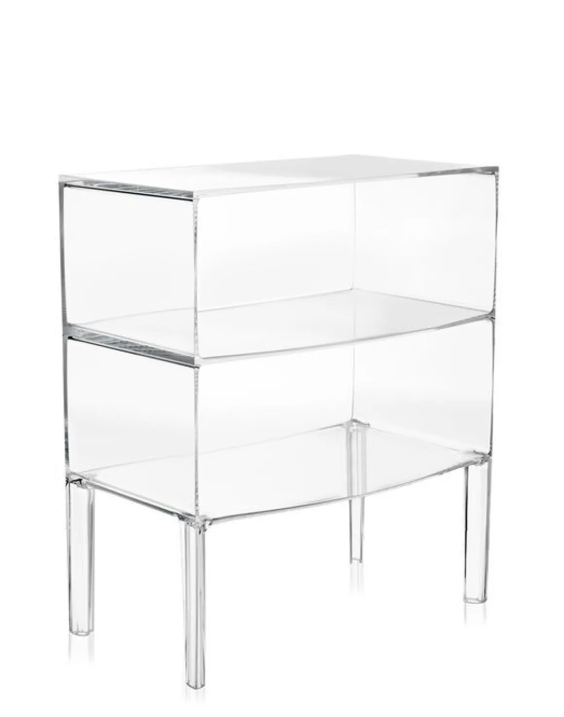 Ghost buster est la première commode éditée par Kartell. Ghost buster c’est aussi le record mondial du plus grand monobloc platique jamais produit dans le secteur de l’ameublement. Redessinée par Starck, la commode évoque les formes du meuble classique mais sa matière et sa transparence font de lui une pièce plus que jamais contemporaine. Sur la surface lisse de cette commode courent des angles et des courbes, des lignes droites et des sinuosités donnant vie à un captivant jeu de perspectives et de reflets presque magiques. Ghost Buster est composée de trois rayons ouverts sur le devant et soutenue par quatre pieds bi-faces.