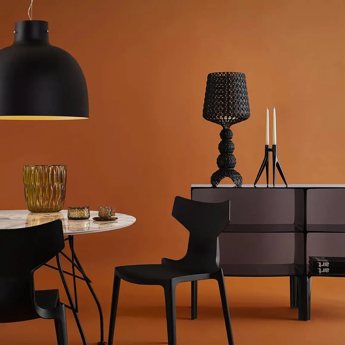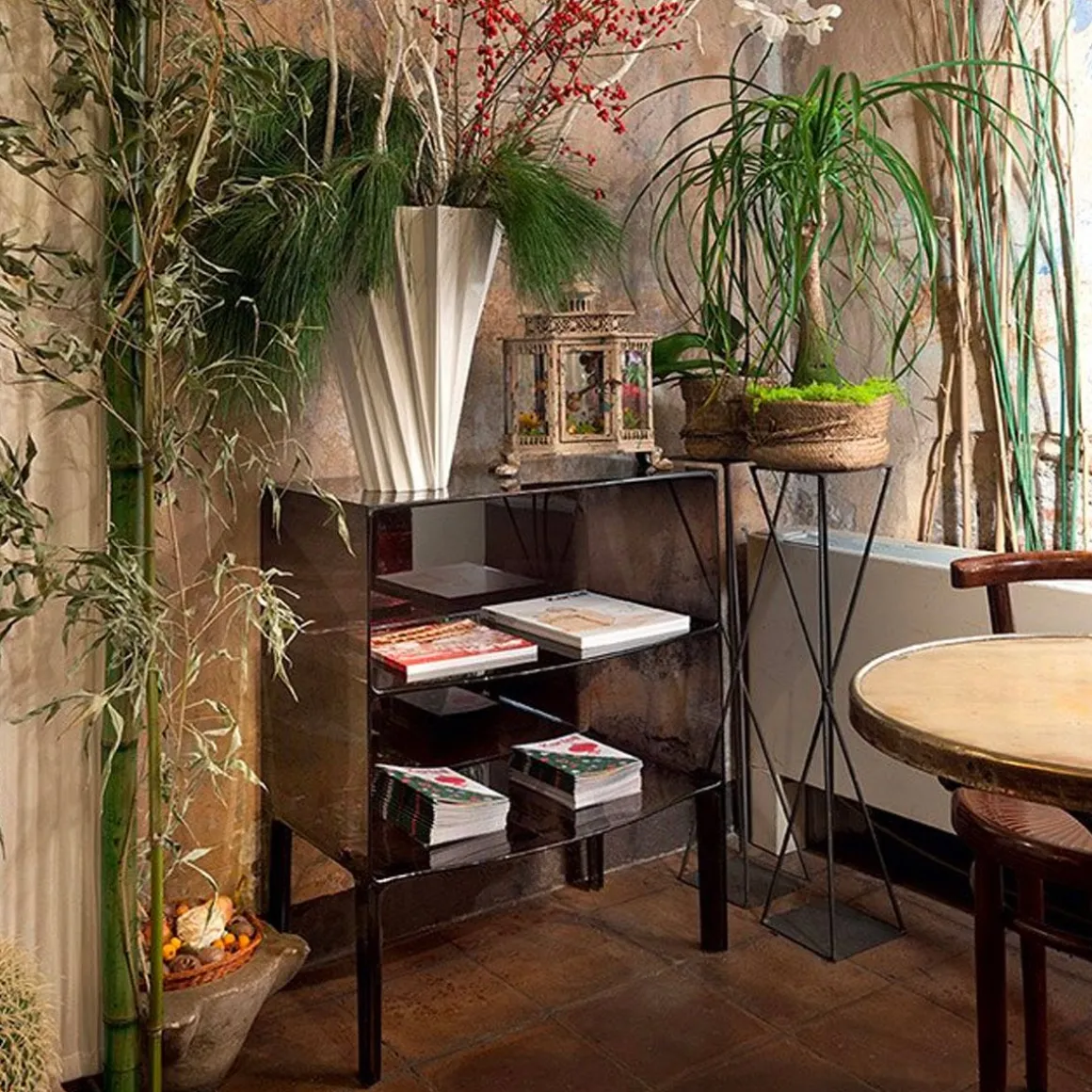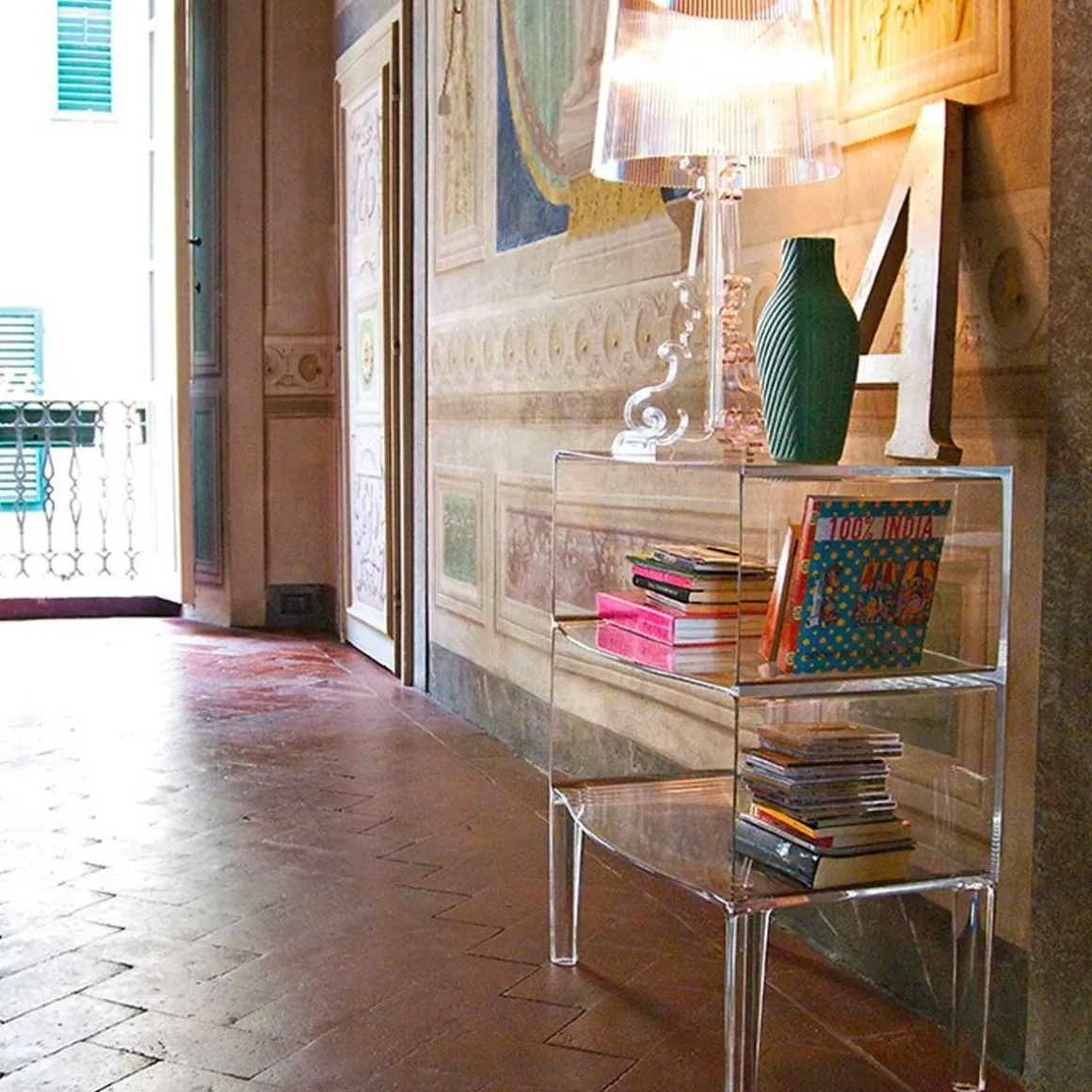 Ghost buster est la première commode éditée par Kartell. Ghost buster c’est aussi le record mondial du plus grand monobloc platique jamais produit dans le secteur de l’ameublement. Redessinée par Starck, la commode évoque les formes du meuble classique mais sa matière et sa transparence font de lui une pièce plus que jamais contemporaine. Sur la surface lisse de cette commode courent des angles et des courbes, des lignes droites et des sinuosités donnant vie à un captivant jeu de perspectives et de reflets presque magiques. Ghost Buster est composée de trois rayons ouverts sur le devant et soutenue par quatre pieds bi-faces.