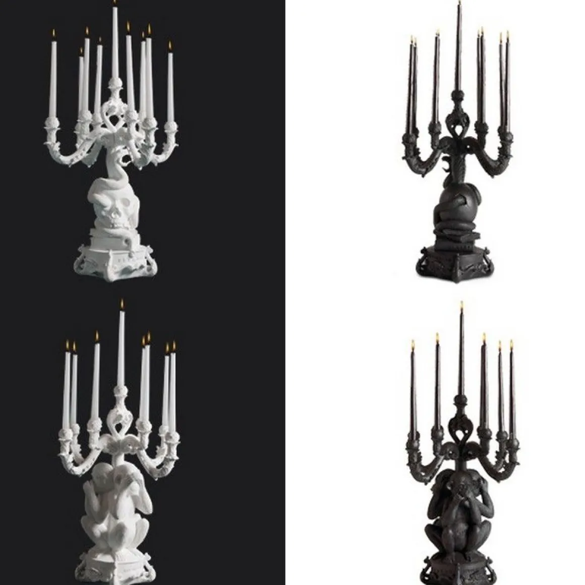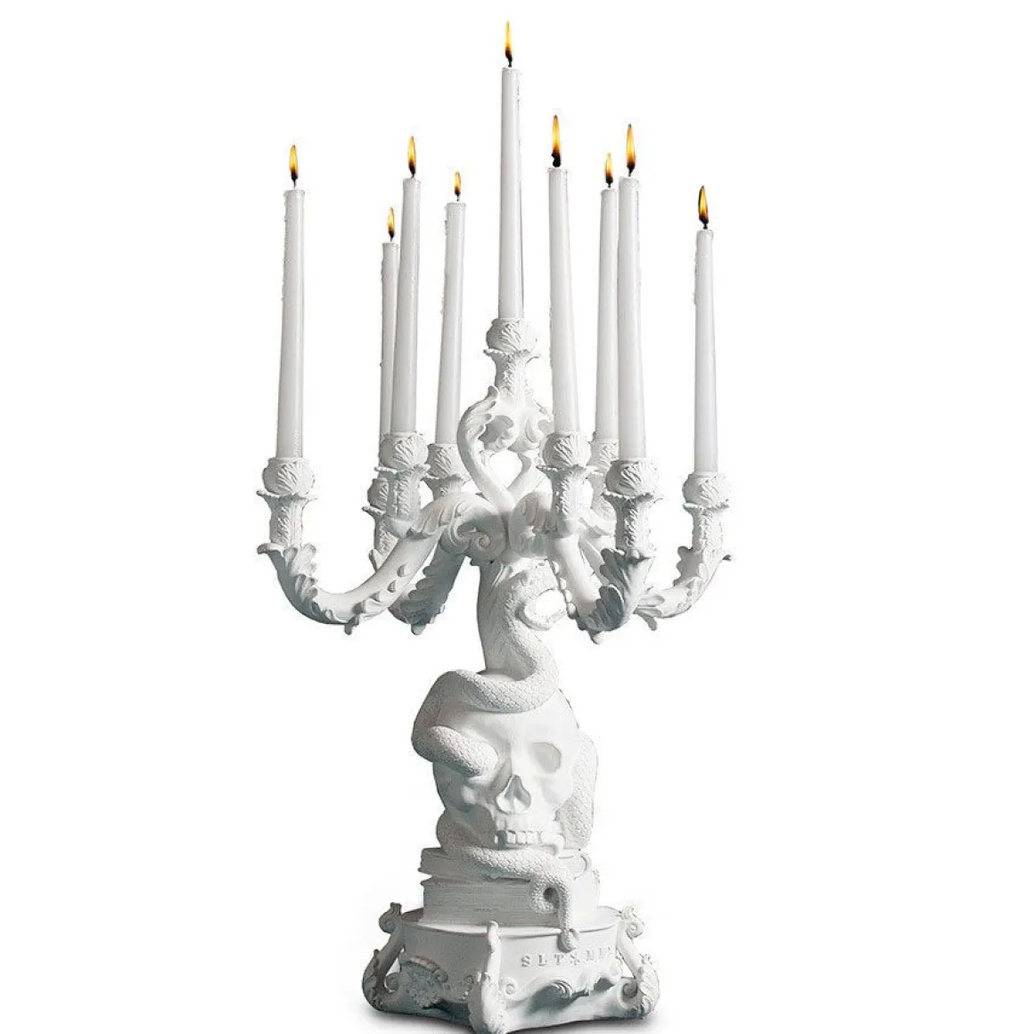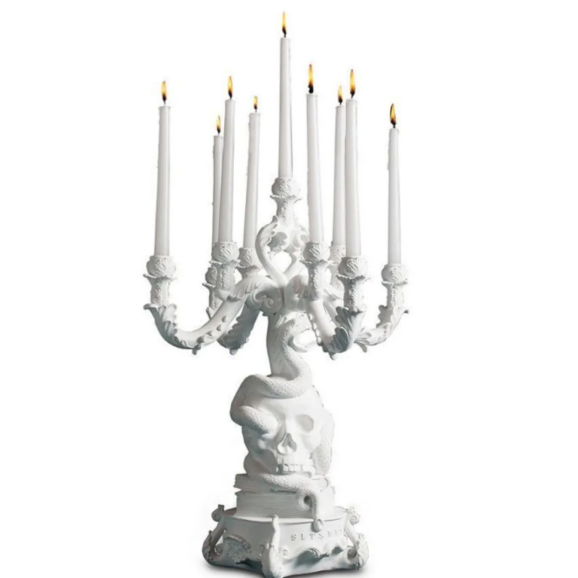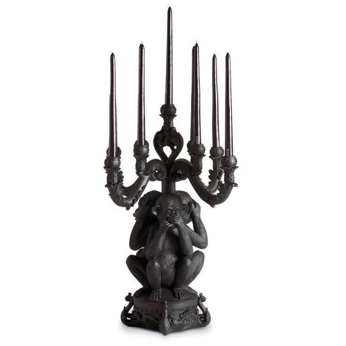 Ce chandelier de Seletti pour 9 bougies est baroque et surréaliste. La résine a remplacé le laiton, le marbre ou la porcelaine ; les volutes et feuillages en reliefs sont aux antipodes du minimalisme actuel. Les motifs qui composent le corps du chandelier sont loin des standards traditionnels du XVIIIe siècle avec un crâne percé par un serpent et 3 singes accroupis. Une création contemporaine atypique !