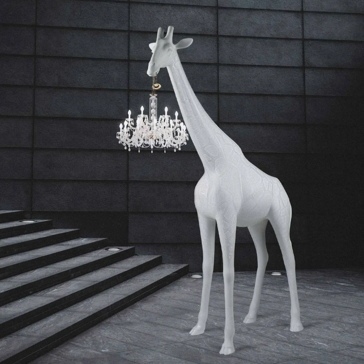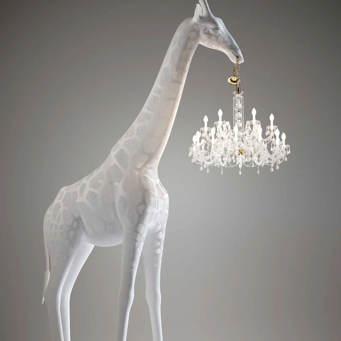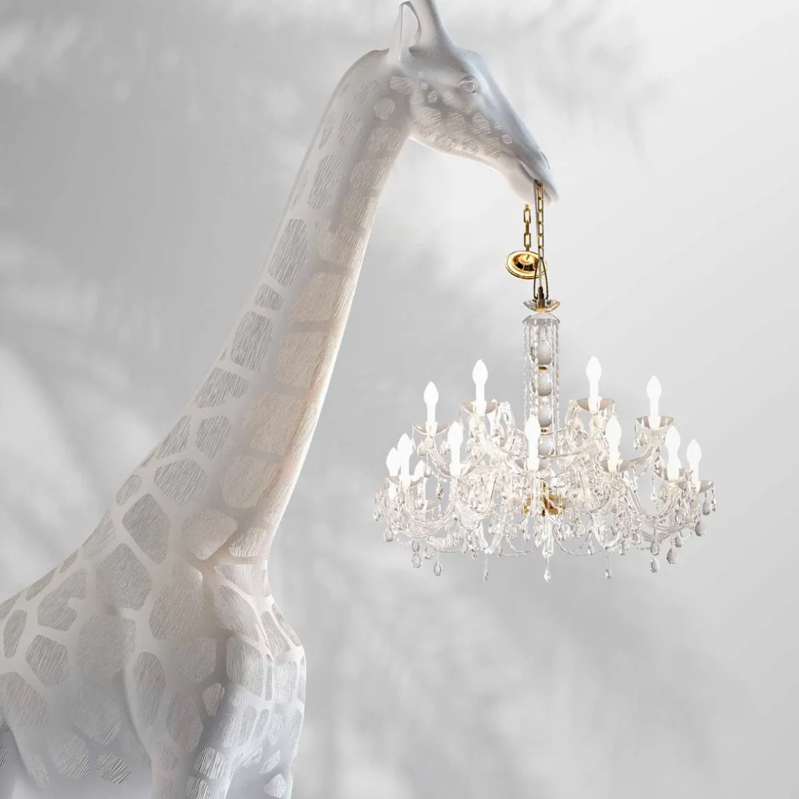 Giraffe in love XL de Qeeboo par Marcantonio. L’amour rend les gens fous, tout le monde le sait. Mais que va-t-il se passer lorsque la flèche de Cupidon touchera une girafe de 4 mètres de haut ? Les croquis visionnaires de Marcantonio ont répondu à cela en créant Giraffe in Love, une girafe rêveuse tenant un lustre classique de style Marie-Thérèse. Giraffe in Love Outdoor est une lampe girafe de la taille d’une authentique jeune girafe, adaptée aux environnements extérieurs grâce à son lustre résistant au vent et à l’eau.
