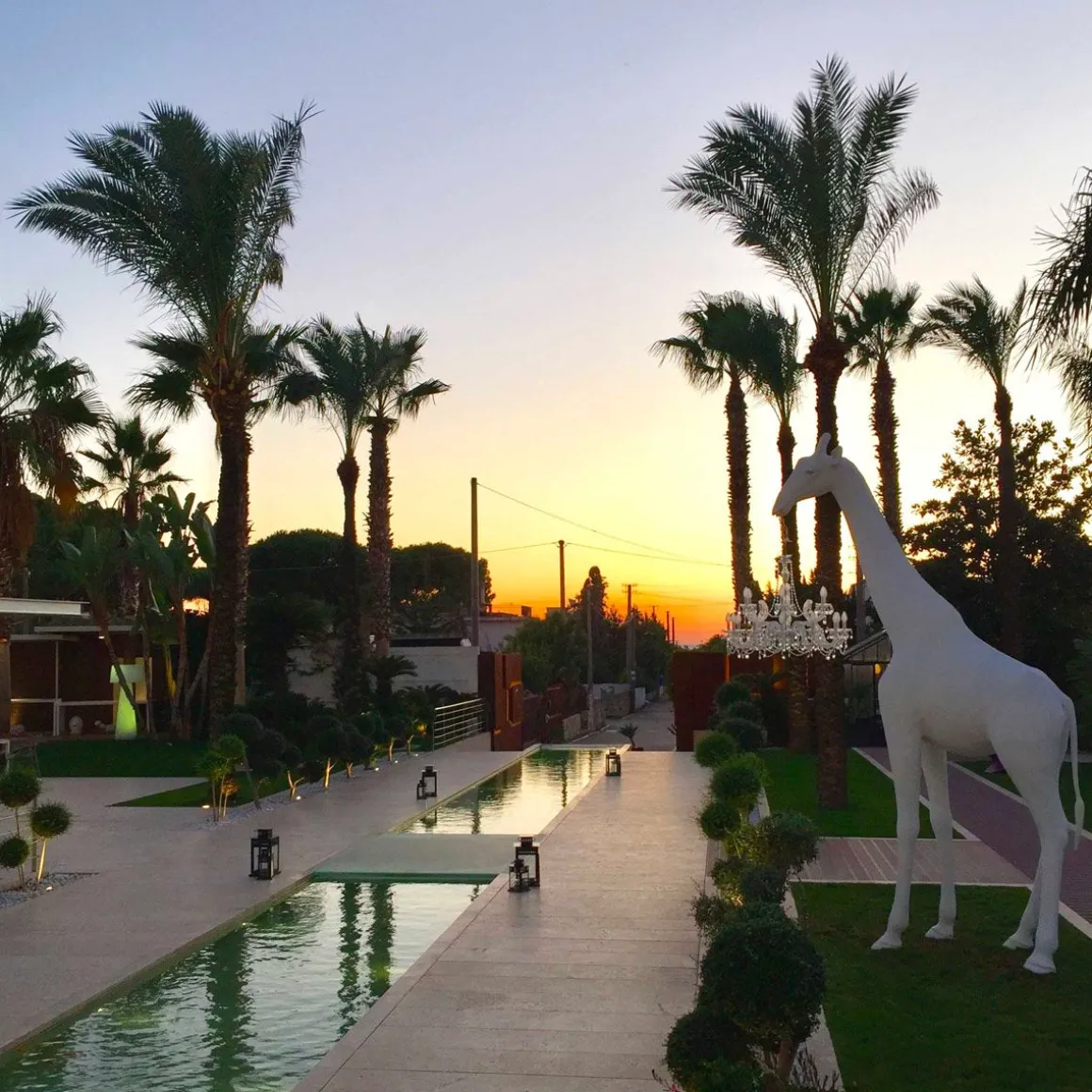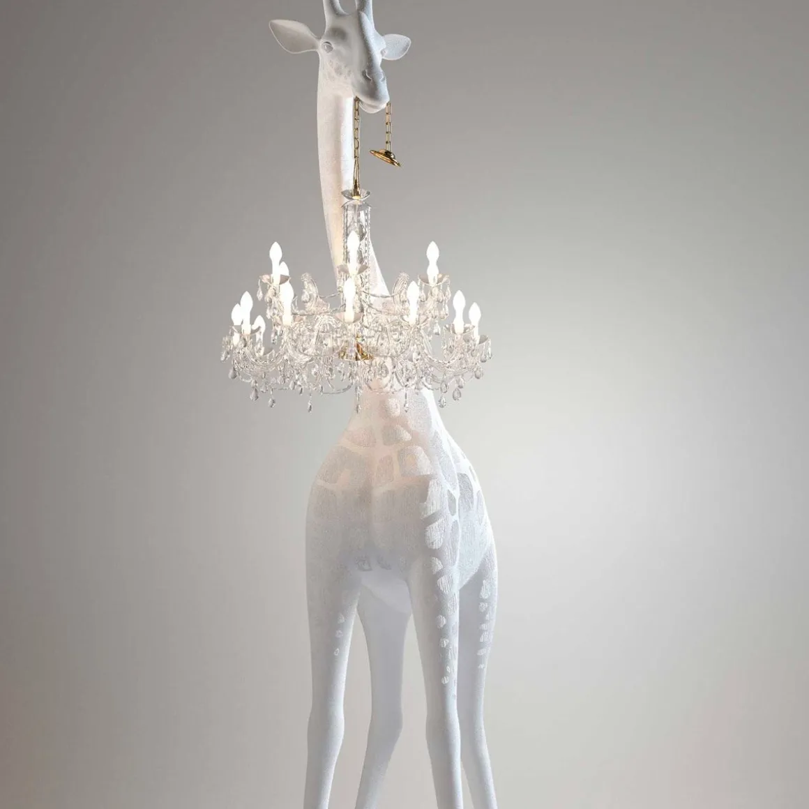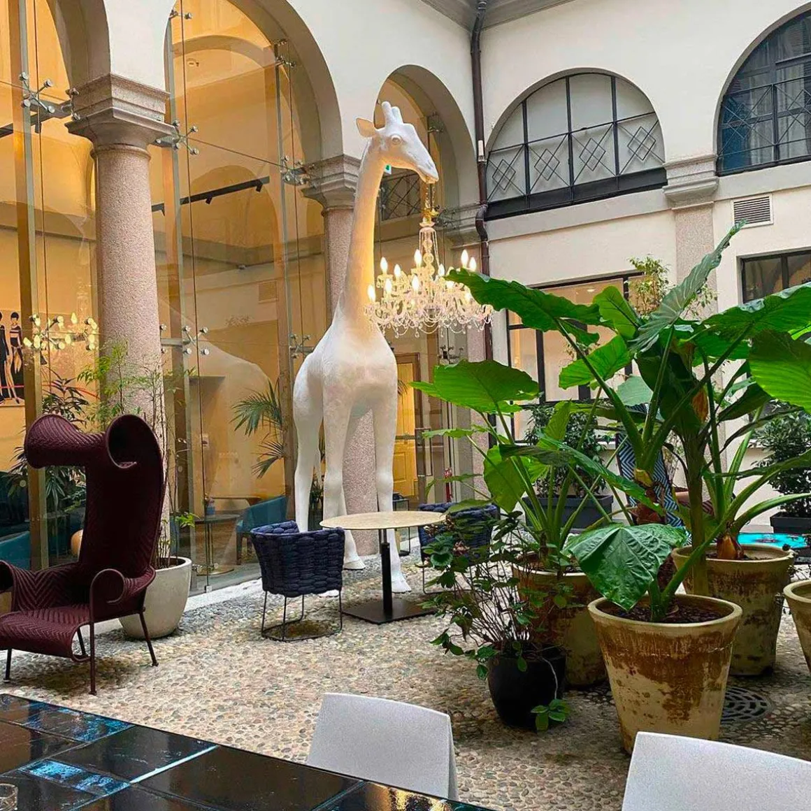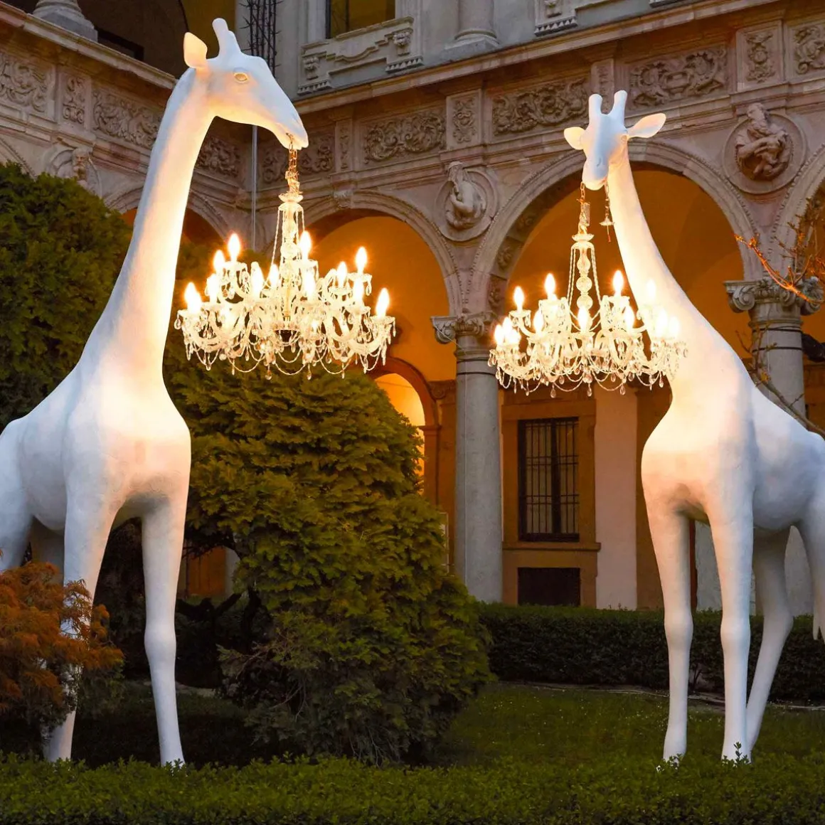Giraffe in love XL de Qeeboo par Marcantonio. L’amour rend les gens fous, tout le monde le sait. Mais que va-t-il se passer lorsque la flèche de Cupidon touchera une girafe de 4 mètres de haut ? Les croquis visionnaires de Marcantonio ont répondu à cela en créant Giraffe in Love, une girafe rêveuse tenant un lustre classique de style Marie-Thérèse. Giraffe in Love Outdoor est une lampe girafe de la taille d’une authentique jeune girafe, adaptée aux environnements extérieurs grâce à son lustre résistant au vent et à l’eau.