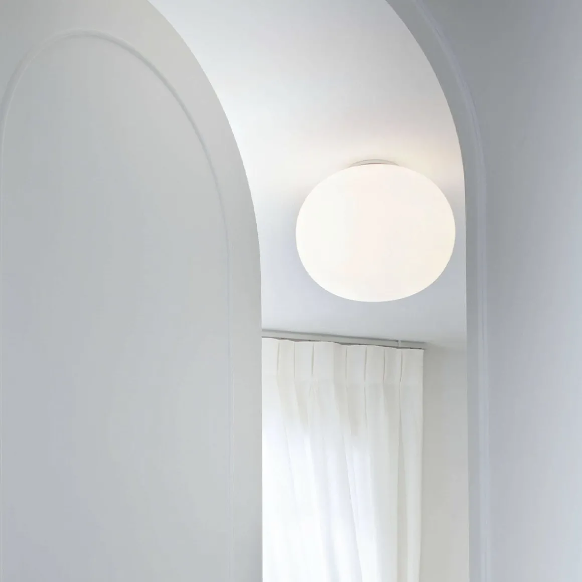 Glo Ball C1 est un plafonnier dessiné par Jasper Morisson pour Flos. Comme une boule de neige, elle se pare d’un manteau blanc. Les courbes sont généreuses, les traits fins. La sensation de légèreté se doit certainement à son diffuseur en verre.