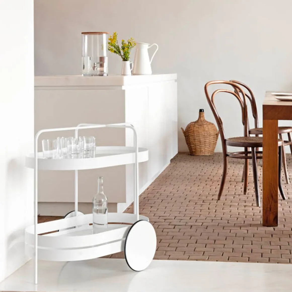 Grace de Schönbuch par Sebastian Herkner. Le chariot de service GRACE est à la fois frappant et sophistiqué. Parfait comme table d’appoint, il est également très pratique comme solution de rangement mobile ou chariot de bar. Le design est basé sur un détail moderne et intemporel de l’architecture des années 1950 et constitue un élément accrocheur dans n’importe quel espace. Le cadre est en métal peint par poudrage, avec une étagère supérieure en verre peinte à l’arrière pour correspondre.
