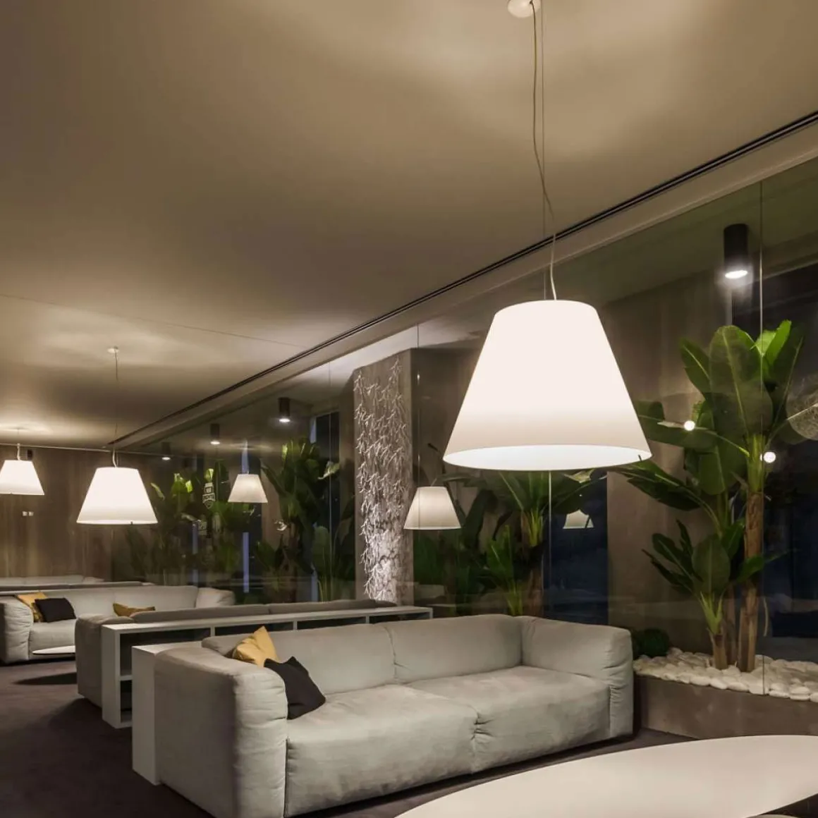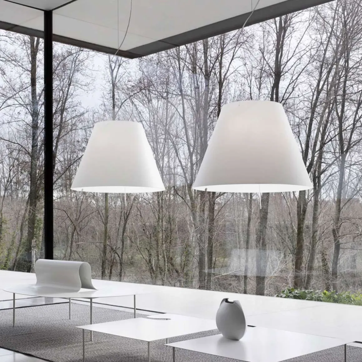 Sous une allure faussement classique, Grande Costanza impose une présence très design, alliant séduction, élégance et sobriété. Son abat-jour surdimensionné est réalisé en polycarbonate. Il diffuse une lumière douce et intense, idéale pour éclairer chaleureusement les volumes des intérieurs privé ou publics. Le contrepoids en acier chromé mat assure la stabilité tout en apportant une dimension décorative. Une suspension blanche d’une grande présence, légère et équilibrée.